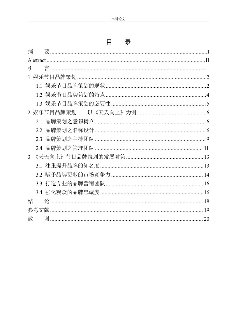 本科论文目录摘4444444引1娱乐节目品牌策划.…21.1娱乐节目品牌策划的现状…21.2娱乐节目品牌策划的特点.41.3娱乐节目品牌策划的必要性52娱乐节目品牌策划一以《天天向上》为例2.1品牌策划之意识树立…2.2品牌策划之名称设计..2.3品牌策划之主持团队…92.4品牌策划之管理团队113《天天向上》节目品牌策划的发展对策133.1注重提升品牌的知名度..3.2赋予品牌更多的市场竞争力143.3打造专业的品牌营销团队3.4强化观众的品牌忠诚度.16结18参考文献19致20本科论文摘要近年来,电视娱乐节目品牌策划逐渐成为一档节目能够长久发展下去的重要原动力。越来越多的娱乐节目更加注重节目的品牌策划。本文以湖南卫视热播的娱乐节目《天天向上》为例,探索电视娱乐节目在品牌策划方面的意识、独特的设计以及管理方式,重要的是要对《天天向上》的品牌策划进行一个完整的体系的概括和前卫性的预判。笔者写这篇文章希望能起到抛砖引玉的作用,为同行在电视娱乐节目品牌策划过程中起到良好的导向作用。关键词:品牌策划;娱乐节目;品牌管理;天天向上本科论文AbstractIn recent years,brand planning of TV entertainment programs hasgradually become an important driving force for the long-term development of aprogram.More and more entertainment programs pay more attention to theprogram brand planning.Taking the Popular Entertainment Program Day DayUp on Hunan satellite TV as an example,this paper explores the consciousness,unique design and management of TV entertainment program in the aspect ofbrand planning,what is important is to have a complete systematic summary andavantgarde prediction of the DayDay Up's brand planning.I write this article inthe hope of playing a role in the Tossing out a brick to get a jade gem,for peersin the television entertainment program brand planning process to play a goodguiding role.Keywords:Brand planning;Entertainment;brand management;Day Day Up