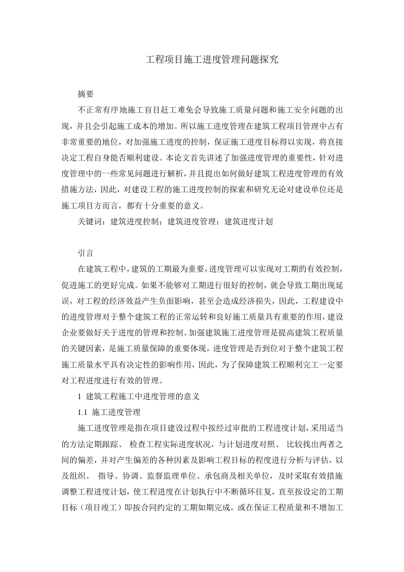 工程项目施工进度管理问题探究摘要不正常有序地施工盲目赶工难免会导致施工质量问题和施工安全问题的出现,并且会引起施工成本的增加。所以施工进度管理在建筑工程项目管理中占有非常重要的地位,对加强施工进度的控制,保证施工进度目标得以实现,将直接决定工程自身能否顺利建设。本论文首先讲述了加强进度管理的重要性,针对进度管理中的一些常见问题进行解析,并且提出如何做好建筑工程进度管理的有效措施方法,因此,对建设工程的施工进度控制的探索和研究无论对建设单位还是施工项目方而言,都有十分重要的意义。关键词:建筑进度控制;建筑进度管理:建筑进度计划引言在建筑工程中,建筑的工期最为重要,进度管理可以实现对工期的有效控制,促进施工的更好完成。如果不能够对工期进行很好的控制,就会导致工期出现延误,对工程的经济效益产生负面影响,甚至会造成经济损失,因此,工程建设中的进度管理对于整个建筑工程的正常运转和良好施工质量具有重要的作用,建设企业要做好关于进度的管理和控制。加强建筑施工进度管理是提高建筑工程质量的关键因素,是施工质量保障的重要体现,进度管理是否到位对于整个建筑工程施工质量水平具有决定性的影响作用,因此,为了保障建筑工程顺利完工一定要对工程进度进行有效的管理。1建筑工程施工中进度管理的意义1.1施工进度管理施工进度管理是指在项目建设过程中按经过审批的工程进度计划,采用适当的方法定期跟踪、检查工程实际进度状况,与计划进度对照、比较找出两者之间的偏差,并对产生偏差的各种因素及影响工程目标的程度进行分析与评估,以及组织、指导、协调、监督监理单位、承包商及相关单位,及时采取有效措施调整工程进度计划,使工程进度在计划执行中不断循环往复,直至按设定的工期目标(项目竣工)即按合同约定的工期如期完成,或在保证工程质量和不增加工程造价的条件下提前完成。在现代工程项目管理中,进度已经被赋予更广泛的含义,它将工程项目任务、工期、成本有机地结合起来,形成一个综合的指标,能全面反映项目的实施状况。所以进度控制已不只是传统的工期控制,而且还将工期与工程实物、成本、资源配置等统一起来,其基本对象是工程活动。施工进度管理控制就是对工程建设项目建设阶段的工作程序和持续时间进行规划、实施、检查、调查等一系列活动的总称。工期、费用、安全、质量构成了项目的四大目标,这些目标均能通过进度控制加以掌握,而项目进度的控制是工程建设的四大目标的重要部分。因此,进度控制管理是项目的灵魂,必须加强项目进度控制管理。1.2施工进度与质量、投资关系是相互联系的在项目实施中进度与投资的关系是加快进度往往要增加投资,采取各种赶工措施使工程建设项目及早竣工,尽快发挥工程建设投资的经济效益。而进度与质量的关系是加快进度,因人、机械超强工作造成工人疲劳,机械维修,材料供应紧张,施工条件的改变,可能会影响到工程质量。适度均衝的加快施工进度,可以在计划工期内得到合理的提前,可以保证施工质量。严格控制质量,可以避免返工,进度则会加快。反之则会因返工,造成工期延后,施工成本增加。投资与质量的关系是质量好要增加施工成本,但严格控制质量,可以避免返工,提高了承包商的施工效益,减少建设项目的经常性维护费用,延长工程使用年限,反而降低了投资成本,提高了建设单位的投资效益。施工进度管理控制是对工程建设项目建设阶段的工作程序和持续时间进行规划、实施、检查、调查等一系列活动的总称。工程建设项目的进度控制,是工程建设过程中一项重要而复杂的任务,是工程建设的三大目标的重要部分。2建筑工程施工中进度管理的作用与内容2.1建筑工程施工中进度管理的作用其一保证工程按期完成,在开展建筑工程施工之前,相关企业、单位就根据该工程制定了相关的工期,而施工企业、单位在实施施工的过程中加强对自身建设的进度管理,则能够最大限度地保证工程按期完成,进而保障自身的利益。其二,控制投资成本,施工的进度和质量、投资等是彼此联系在一起的,一是在项目实施过程中加快工程的进度就必须加大投资,而加快了施工的进度之后就能有效缩短工期,这样就能减少建设资金的投入。二是加快了工程施工进度就有可能会影响到工程施工的质量,甚至造成不必要的返工,进而导致工期的延长与投入的增加。其三,提升经济效益。工程施工中的进度管理,不仅重要而且十分复杂,作为建筑工程建设的一个重要组成部分不但能够提高企业的投资效益,而且还能在提升企业经济效益上发挥重要的作用。2.2项目进度管理内容其一,事前进度管理。事前进度管理是工程项目正式实施前所进行的进度管理,其内容具体包括:①编制施工阶段的进度管理工作细节:②编制综合总体施工进度计划:③审核施工单位施工进度计划:④构建进度计划系统:⑤编制年度,季度和月度进度计划等。其二,事中进度管理。事中管理是对施工过程的进度管理,该过程的进度管理是至关重要的,它关系到既定的进度目标能按时完成有这个过程中、进度管理人员一定要及时发现实际进度与计划进度间存在的偏差,并及时采取必要的措施来纠正这种偏差,以确保工程进度的按期完成。