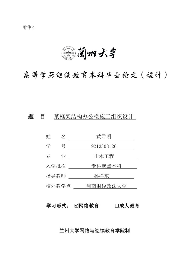 附件4题目某框架结构办公楼施工组织设计姓名黄君明学号9213303126专业土木工程入学批次专科起点本科指导教师孙祥东校外教学点河南财经政法大学学习形式:☑网络教育口成人教育兰州大学网络与继续教育学院制诚信责任书本人郑重声明:本人所呈交的毕业论文(设计),是在导师的指导下独立进行研究所取得的成果。毕业论文(设计)中凡引用他人已经发表或未发表的成果、数据、观点等,均已明确注明出处。除文中已经注明引用的内容外,不包含任何其他个人或集体已经发表或在网上发表的论文。本人郑重承诺:因个人原因,未按照毕业论文工作的时限规定完成,本人自愿承担因此影响正常毕业的后果。特此声明论文作者签名:黄君明日期:2023年3月27日摘要该项目地处于某城区,此次毕业设计的目标是一栋写字楼,该项目基底建筑面积697.95平米,总的建筑区域为2093.1平米,其构造属于框架结构体系,该项目是以实际条件以及当前相关的相关的法律、法规等为基础,进行了一项完善的、科学的施工组织设计,可以让项目顺利地进行,进而实现提升项目的施工速度,减少了项目的成本。按照有关的规定,该工程设计要做好施工准备工作,然后再进行施工措施与施工进度计划工作,然后进行资源配置计划工作,再设计总施工平面布局工作,施工前需熟悉图纸之后对施工过程进行科学而又合理地的安排,保证了项目的施工质量与施工的安全性,在资源配置计划中进行了施工的工作量与机械的数量的计算,对施工的时间进行了有效的控制,掌握好施工时间管理规划,进行横道图以及施工平面布置图的绘制。关键词:单位工程:施工组织设计:办公楼I