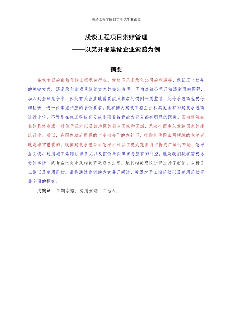 南昌工程学院自学考试毕业论文浅谈工程项目索赔管理一以某开发建设企业索赔为例摘要在竞争日趋白热化的工程承包行业,索赔不只是承包公司趋利避害、保证正当权益的关镀方式,还是承包商项目监管实力的突出表现。国内建筑公司开始逐渐面向国际,加入到全球竞争中,因此有关企业就需要依照相应的惯例开展监管,此外承包商也要仔细钻研、进一步掌握相应的条例要求。现在国内建筑工程企业和其他国家的建筑承包商进行比较,不管是在施工科技部分或是项目监管能力部分都有明显的距离。国内建筑企业的具体市场一般位于亚洲以及该地区的部分国家和区域,无法全面步入发达国家的建筑行业。所以,在国内政府提倡的“走出去”的方针下,抵御其他国家同领域的竞争者就是非常重要的,我国建筑承包公司怎样才可以在更大范围内占据更广阔的市场,怎样全面使用通用施工索赔法律条文以及惯例来保障自身应有的利益,就是我们现在需要思考的事情。笔者在本文中从相关研究意义出发,地其相关理论知识进行了概述,分析了工期以及费用赔偿,最终通过案例的方式展开阐述,希望对于工期赔偿以及费用赔偿开展全面的探究。关键词:工期索赔;费用索赔;工程项目南昌工程学院自学考试毕业论文AbstractIn the increasingly competitive international engineering contracting market,projectclaim is not only an important means to avoid the risk of loss contractor,safeguard theirlegitimate rights and interests,but also an important manifestation of the contractor projectmanagement level.Chinese construction firms have for the international market andparticipate in international competition,which requires project management in accordancewith international practice,the contractor needs to seriously study learning,adapt tointernational practices.At present,China Construction Company compared with the largeforeign construction contractors,both in the technical aspects of the construction or projectmanagement level there is a big gap.Our construction company construction market,mainlyin Asia and Africa,some countries and regions,it is difficult to enter the US and Europeanconstruction market.Therefore,in the implementation of our government under the "goingout"policy background,the face of strong foreign competitors,how to be able to expand ourconstruction contractors occupy a larger market share in the international constructioncontracting,construction claims how to make the international laws and conventions and tosafeguard their legitimate rights and interests,it is a subject worth exploring.In this article theauthor from the research sense,the theory of knowledge to which provides an overview andanalysis of the time claim costs claimed last case will be described in the form of expectedclaims and expenses for the duration of the claim to have a deeper understanding.Keywords:period claim;fee claims;Project南昌工程学院自学考试毕业论文目录Abstract.................II1相关理论概述...1.1索赔的概念..1.2索赔的分类1.2.1工期索赔...132.1.1工期索赔的分析程序...2.1.2工期索赔的计算方法2.2工程延误的费用索赔.……2.2.1费用索赔的计算原则....42.2.2工程延误费用索赔的构成及计算574.1.1施工方索赔主张4.4承包商施工索赔应注意的问题.…104.4.1走出“中标靠低价,盈利靠索赔”的误区..104.4.2重视培养合同管理索赔专家....104.4.3积极发挥监理工程师的作用104.4.4充分把握索赔处理的灵活性,10