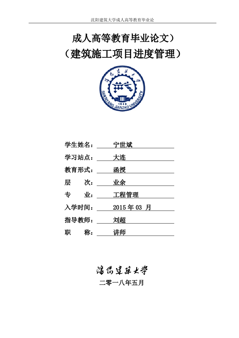 沈阳建筑大学成人高等教育毕业论成人高等教育毕业论文)(建筑施工项目进度管理)学生姓名:宁世斌学习站点:大连教育形式:函授层次:业余专工程管理入学时间:2015年03月指导教师:刘超职称:讲师二零一八年五月沈阳建筑大学成人高等教育毕业论文摘要建筑工程实施过程中,众所周知,加强施工进度管理是确保工程在规定期限内完工的必要条件之一,特别是大型重点建设项目,工期要求十分紧迫,项目施工方的工程进度压力非常大。数百天的连续施工,使施工人员形成两班轮换制上岗作业,甚至24小时连续施工时有发生。但是,不正常有序地施工盲目赶工难免会导致施工质量问题和施工安全问题的出现,并且会引起施工成本的增加。所以施工进度管理在建筑工程项目管理中占有非常重要的地位,对加强施工进度的控制,保证施工进度目标得以实现,将直接决定工程自身能否顺利建设。本论文首先讲述了加强进度管理的重要性,针对进度管理中的一些常见问题进行解析,并且提出如何做好建筑工程进度管理的有效措施方法,因此,对建设工程的施工进度控制的探索和研究无论对建设单位还是施工项目方而言,都有十分重要的意义。关键词:建筑进度控制;建筑进度管理;建筑进度计划;施工进度成本沈阳建筑大学成人高等教育毕业论文目录第2章建筑工程施工中进度管理的意义....2.1施工进度管理…12.2施工进度与质量、投资关系是相互联系的第3章建筑工程施工中进度管理的作用3.1保证工程按期完成…33.3提升经济效益33.4项目进度管理内容.…3.4.1事前进度管理.…3.4.2事中进度管理…43.4.3事后进度管理…4第4章影响建筑工程施工进度的因素。。。44.1建筑工程的施工工期较长…44.2缺乏合理的施工计划.44.3缺乏完善的管理体制…4.4物资供应不及时…4.5项目设计变更方面的因素54.6施工地理因素…64.7其他方面的因素6第5章工程项目进度管理中存在的问题..65.1有的项目管理中存在忽视施工进度的思想..65.4在施工的进度计划中没有突出重点.75.5对施工工期的控制中,存在很多业主无限制地缩短工程工期的情况.75.6项目工期的相关计划中存在着失误,这主要包括以下情形…7
