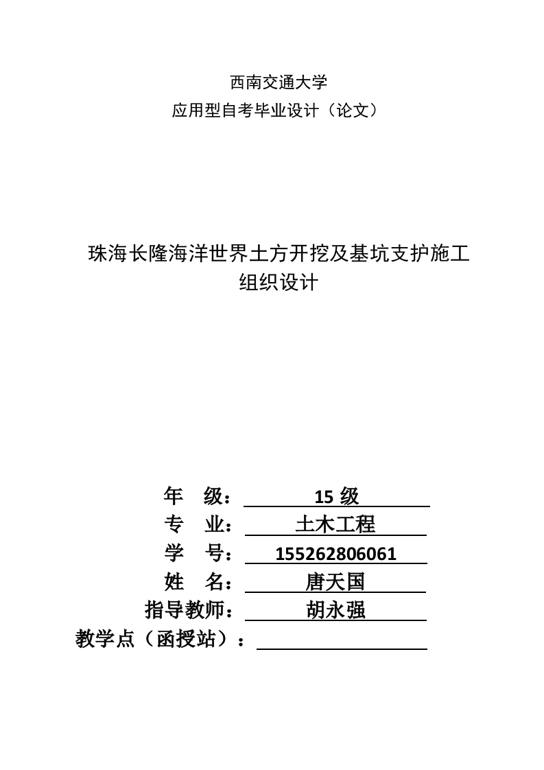 西南交通大学应用型自考毕业设计(论文)珠海长隆海洋世界土方开挖及基坑支护施工组织设计级:15级专学姓土木工程155262806061唐天国指导教师:胡永强教学点(函授站):西南交通大学应用型自考毕业设计(论文)诚信承诺一、本设计(论文)是本人独立完成;二、本设计(论文)没有任何抄袭行为;三、若有不实,一经查出,请答辩委员会取消本人答辩(评阅)资格。承诺人(钢笔填写):年月日西南交通大学应用型自考毕业设计(论文)目录摘1Abatract…22工程施工组织设计的概述32.1工程施工组织设计的重要性2.1.1对施工次数的影响.2.1.2对施工方法的影响…32.1.3对施工效率的影响…42.1.4对施工质量的影响…2.2工程施工组织设计与基坑施工的关系3珠海长隆海洋世界工程概况…3.1施工组织设计概况…3.2土方及基坑工程概况…53.3项目组织机构概况…4珠海长隆海洋世界土方开挖施工组织设计74.1土方施工总体思路.…74.2土方量计算…4.3土方分层施工控制4.4机械设备及开挖工期.….124.4.1土方机械的组织.124.4.2工期进度计划.134.5土方挖运的安全措施.145珠海长隆海洋世界基坑支护施工组织设计145.1支护桩施工5.2水泥搅拌桩施工5.3钢管桩施工…175.4边坡喷锚施工.175.5排水工程…185.6基坑监测…195.7基坑临边防护20结论21致谢22参考文献….23
