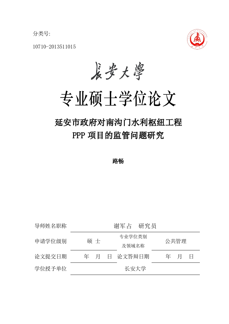 分类号:10710-2013511015专业硕士学位论文延安市政府对南沟门水利枢纽工程PPP项目的监管问题研究路畅导师姓名职称谢军占研究员专业学位类别申请学位级别硕士公共管理及领域名称论文提交日期年月日论文答辩日期年月日学位授予单位长安大学PPP project in the south channel of the project of thewater control projectA Dissertation Submitted for the Degree of MasterCandidate:Lu ChangSupervisor:Prof.Xie JunzhanChang'an University,Xi'an,China