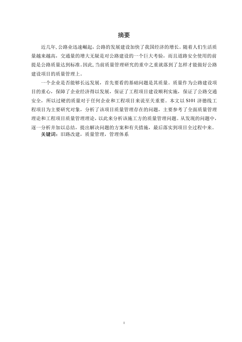 摘要近几年,公路业迅速崛起,公路的发展建设加快了我国经济的增长。随着人们生活质量越来越高,交通量的增大无疑是对公路建设的一个巨大考验,而且道路安全使用的前提是公路质量达到标准。因此,当前质量管理研究的重中之重就落到了怎样才能做好公路建设项目的质量管理上。一个企业是否能够长远发展,首先要看的基础问题是其质量。质量作为公路建设项目的重心,保障了企业经济得以发展,保证了工程项目建设顺利实施,保证了公路交通安全,所以过硬的质量对于任何企业和工程项目来说至关重要。本文以S101济德线工程项目为主要研究对象,分析了该项目质量管理存在的问题,主要参考了全面质量管理理论和工程项目质量管理理论,以此来分析该施工方的质量管理问题。从发现的问题中,逐一分析并加以总结,提出解决问题的方案和有关措施,最后落实到项目全过程中来。关键词:旧路改建,质量管理,管理体系ABSTRACTIn recent years,with the rapid rise of highway industry,the development andconstruction of highway has accelerated the economic growth of our country.With theincreasing quality of people's life,the increase of traffic volume is undoubtedly a great test ofhighway construction,and the premise of road safety is that the quality of highway reaches thestandard.Therefore,the most important task of current quality management research is how todo well the quality management of highway construction projects.Whether an enterprise can develop in the long run depends on its quality first.As thefocus of highway construction projects,quality ensures the development of enterpriseeconomy,the smooth implementation of project construction,and the safety of highway traffic,so excellent quality is very important for any enterprise and project.Taking S101 Jide lineproject as the main research object,this paper analyzes the existing problems of the projectquality management,mainly referring to the theory of total quality management and the theoryof project quality management,so as to analyze the quality management problems of theconstruction party.From the problems found,analyze and summarize one by one,proposesolutions and relevant measures,and finally implement them in the whole process of theproject.Key Words:Old road reconstruction,quality management,management system目录摘要ABSTRACT....第一章绪论1.1研究背景…11.2研究的目的和意义1.2.1研究的目的.…1.2.2研究的意义…1.3国内外研究现状313.1国外研究现状…1.3.2国内研究现状…31.4研究内容及方法…1.4.1研究内容1.4.2研究方法…第二章建设工程质量管理的相关理论.…62.1质量管理的相关概念.62.2工程项目质量管理的内容及特点2.2.1工程项目质量管理的内容.…72.2.2工程项目质量管理的特点72.3工程项目质量管理的影响因素2.4工程项目质量管理的方法9第三章S101济德线项目概况及质量管理现状103.1项目概况.103.2S101济德线施工现场质量管理现状3.2.1项目改建特点分析…3.2.2S101济德线项目质量管理的目标123.2.3S101济德线项目质量管理组织机构…143.3S101济德线质量管理存在的问题
