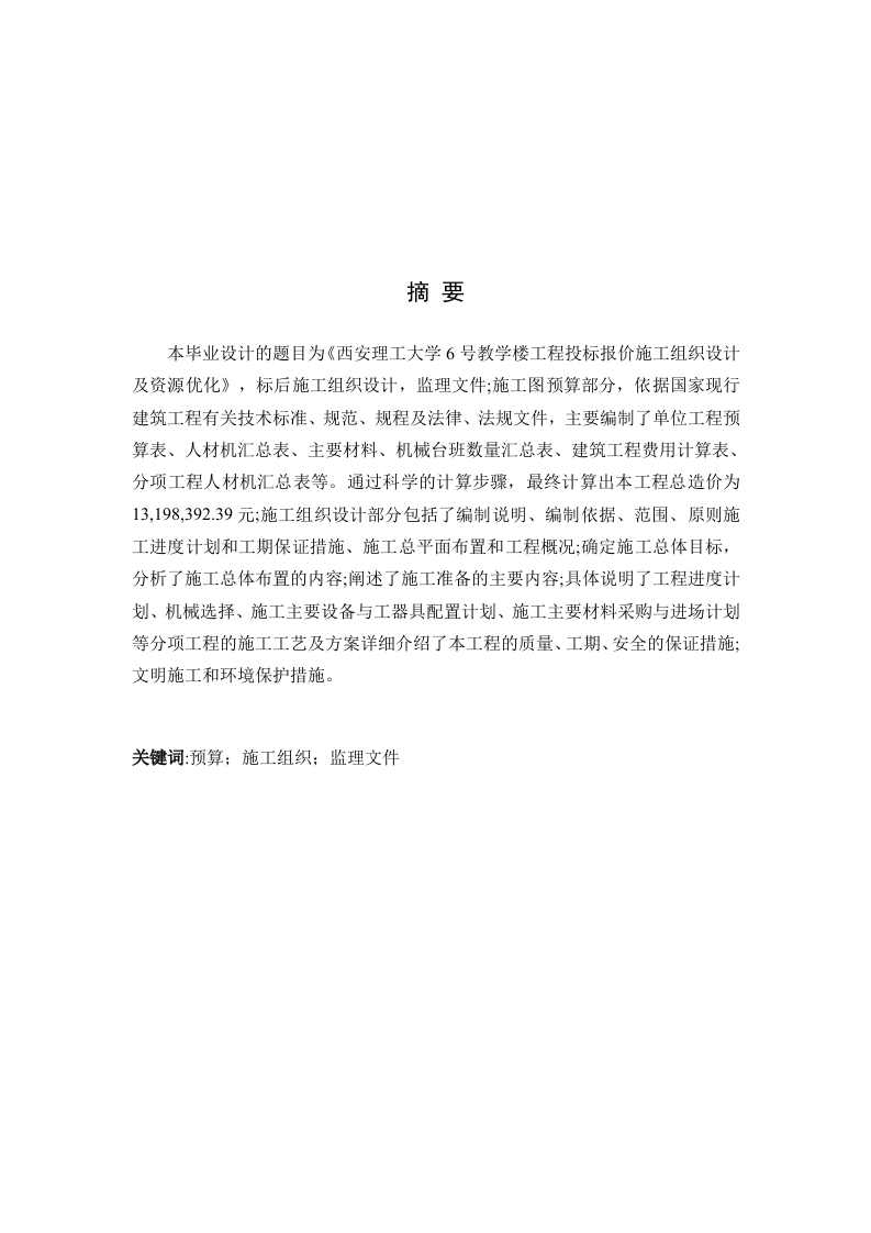 摘要本毕业设计的题目为《西安理工大学6号教学楼工程投标报价施工组织设计及资源优化》,标后施工组织设计,监理文件:施工图预算部分,依据国家现行建筑工程有关技术标准、规范、规程及法律、法规文件,主要编制了单位工程预算表、人材机汇总表、主要材料、机械台班数量汇总表、建筑工程费用计算表、分项工程人材机汇总表等。通过科学的计算步骤,最终计算出本工程总造价为13,198,392.39元;施工组织设计部分包括了编制说明、编制依据、范围、原则施工进度计划和工期保证措施、施工总平面布置和工程概况:确定施工总体目标,分析了施工总体布置的内容;阐述了施工准备的主要内容;具体说明了工程进度计划、机械选择、施工主要设备与工器具配置计划、施工主要材料采购与进场计划等分项工程的施工工艺及方案详细介绍了本工程的质量、工期、安全的保证措施:文明施工和环境保护措施。关键词:预算;施工组织:监理文件SummaryThe title of this graduation project is "Construction Organization Design andResource Optimization of Bidding Quotation for No.6 Teaching Building Project of Xi'an University of Technology",the post-bid construction organization design andsupervision documents;In the construction drawing budget part,according to the currentnational construction engineering related technical standards,specifications,proceduresand laws and regulations,the unit engineering budget table,talent machine summarytable,main materials,machinery machine-team quantity summary table,constructionengineering cost calculation table,sub-item engineering talent machine summary table,etc.are mainly compiled.Through scientific calculation steps,the total cost of the projectis finally calculated to be 13,198,392.39 yuan.The construction organization design partincludes the compilation instructions,compilation basis,scope,principle,constructionprogress plan and time limit guarantee measures,general layout of construction andgeneral situation of the project.Determine the overall construction objectives andanalyze the contents of the overall construction layout.The main contents of constructionpreparation are expounded.The construction technology and scheme of the sub-projectssuch as the project progress plan,mechanical selection,construction main equipment andtools allocation plan,construction main materials procurement and mobilization plan aredescribed in detail.The quality,construction period and safety assurance measures of theproject are introduced in detail.Civilized Construction and Environmental ProtectionMeasures.Key words:budget,construction organization,supervision docu目录第一部分商务部分1.1投标函…1.1.1投标函的概念1.1.2投标函的作用11.3投标函的内容与写作1.2投标保函…212.2投标人应具备的条件1.2.3程序信息…31.2.4投标保函的期限.…1.2.5投标保函…31.3企业资质…14法定代表人身份证明格式1.5企业财务状况…1.6企业信誉…1.8项目组织结构…1.8.1项目组织机构配备情况表第二部分造价部分182.1投标总价…182.1.1单位工程投标报价汇总表192.2分部分项工程清单与计价表…2.3措施项目工程量清单与计价表332.4措施项目综合单价分析表…342.5单价措施项目工程量清单综合单价分析表1252.6措施项目清单计价表.1312.7其他项目清单与计价汇总表1312.8实物消耗量统计表…132第三部分施工组织设计1353.1编制概况…1353.1.1编制原则1353.1.2工程目标1353.2工程概况…1363.2.1工程概况…3.2.2工程特点.1383.3施工条件…3.4工程管理机构与组织…1393.4.1工程管理机构.…1393.4.2项目班子组成及岗位责任…1393.4.3项目经理部职责…3.4.4项目管理制度3.5施工部署…