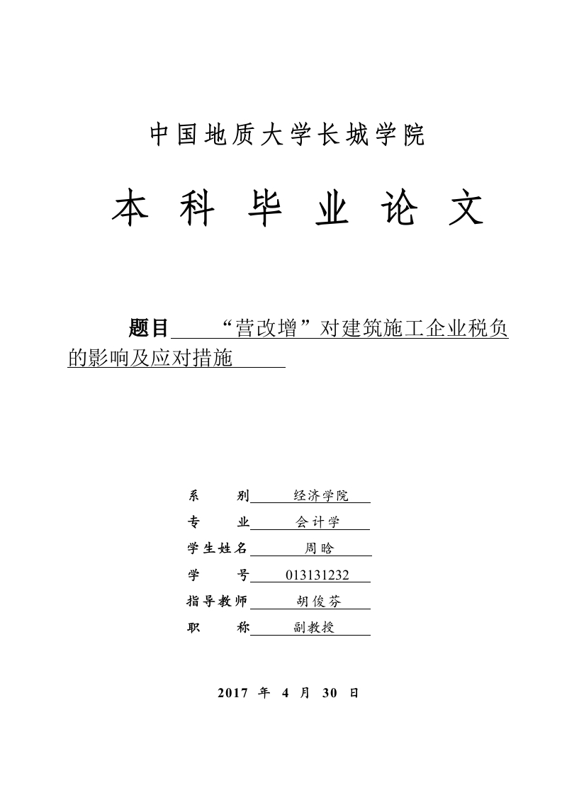 中国地质大学长城学院本科毕业论文题目“营改增”对建筑施工企业税负的影响及应对措施系别经济学院专业会计学学生姓名周晗学号013131232指导教师胡俊芬职称副教授2017年4月30日本科毕业生毕业论文(设计)诚信承诺书毕业论文“营改增”对建筑施工企业税负的影响及应对措(设计)题目施学生姓名专业会计学学号013131232指导老师胡俊芬职称副教授所在系别经济学院诚信承诺本人慎重承诺和声明:我承诺在毕业论文(设计)活动中遵守学校有关规定,恪守学术规范,在本人的毕业论文中不剽窃、抄袭他人的学术观点、思想和成果,不篡改研究数据,如有违规行为发生,我愿承担一切责任,接受学校的处理。学生(签名):年月日中国地质大学长城学院毕业论文任务书学生姓名周晗学号013131232专业班级会计学12班指导教师胡俊芬职称单位河北金融学院毕业论文“营改增”对建筑施工企业税负的影响及应对措施题目毕业论文主要内容和要求:主要内容:“营改增”作为我国税制改革的主要内容之一,这项方案的实施影响着我国各行各业的发展,其中建筑产业是我国国民经济发展的重要动力,其税负的变化直接与其发展步伐有着重要的联系。文章就“营改增”对建筑施工企业税负的影响进行了讨论:首先,论述了国家实施“营改增”的背景与意义:其次,对“营改增”的相关概念进行了阐述:再次,分析了“营改增”后建筑施工企业税负情况:最后,针对实施“营改增”方案后建筑施工企业税负有所增加的相关问题,提出了几点企业减轻税负的应对措施。要求:论文撰写要求思路清晰、内容充实、论点明确,论据充分,论证严密,语言通顺。撰写论文前应首先阅读相关的研究资料,掌握学术前沿动态,对相关理论著作要很好的把握,提高理论水平及思想深度。根据开题报告和老师提出的意见对论文提纲进行修改,确定大纲后认真撰写毕业论文。撰写论文结束后要根据老师的修改意见,认真反复的修改论文,并按照要求参加毕业论文的答辩,严格按照论文进度安排进行论文的写作。论文的格式、字数等撰写方面的要求参照《中国地质大学长城学院毕业论文(设计)撰写规范》。毕业论文主要参考资料:[1]郭目生.“营改增”对建筑安装施工企业的影响及对策[J刀].经济视角(上旬刊),2014,(09):24-26.[2]王明山.营改增对建筑施工企业税负的影响与对策分析[J刀.时代金融2016,(24):158-168.[3]王振华.“营改增”对建筑施工企业的影响及应对措施[J].财会学习,2015,(10):142-144.[4]吕政.论营改增对建筑施工企业的税负影响及应对措施[J刀.财经界(学术版),2015,(21):252.[5]李魁.“营改增”对建筑施工企业的影响及相应处理[J刀.财会学习,2016,(10):1-3.[6]姜杰.营改增对建筑施工企业的影响及应对[J刀.财会学习,2016,(10):157-159.[7]廖宾.营改增视角下建筑施工单位的影响研究[A].《决策与信息》杂志社、北京大学经济管理学院.“决策论坛一一管理科学与经营决策学术研讨会”论文集(上)[C].《决策与信息》杂志社、北京大学经济管理学院:2016:1.[8]蒋蔚.“营改增”对建安企业税负的影响及对策[A].中国武汉决策信息研究开发中心、决策与信息杂志社、科技与企业杂志社、北京大学经济管理学院.软科学论坛一一公共管理体制改革与发展研讨会论文集[C].中国武汉决策信息研究开发中心、决策与信息杂志社、科技与企业杂志社、北京大学经济管理学院:2014:2.[9]吴丽华.建筑业营改增税率:11%太高,6%最好[N].华夏时报,2013-0204003.