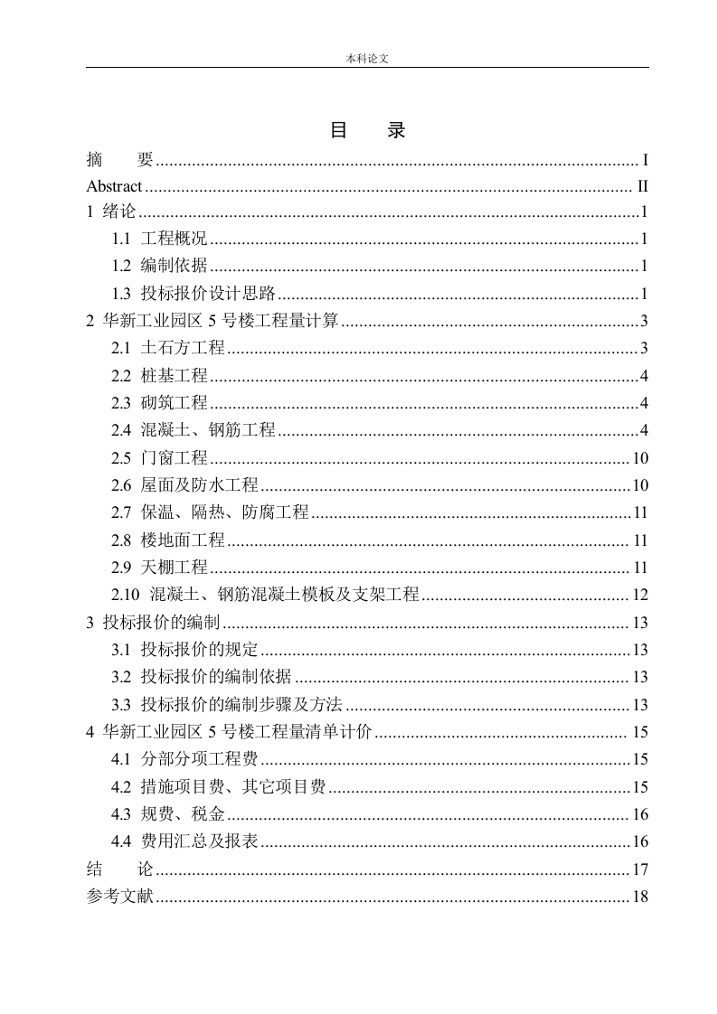 本科论文目录摘要…Abstract.......1绪论1.1工程概况1.2编制依据1.3投标报价设计思路.2华新工业园区5号楼工程量计算2.1土石方工程2.2桩基工程.42.3砌筑工程2.4混凝土、钢筋工程2.5门窗工程2.6屋面及防水工程.102.7保温、隔热、防腐工程2.8楼地面工程…112.9天棚工程…112.10混凝土、钢筋混凝土模板及支架工程123投标报价的编制133.1投标报价的规定133.2投标报价的编制依据133.3投标报价的编制步骤及方法134华新工业园区5号楼工程量清单计价154.1分部分项工程费154.2措施项目费、其它项目费4.3规费、税金164.4费用汇总及报表.16结17参考文献18本科论文附录1单位工程投标报价汇总表附录2分部分项工程和单价措施项目清单与计价表.21附录3总价措施项目清单与计价表.42附录4其他项目清单与计价汇总表43附录5规费、税金项目清单与计价表…44致谢45本科论文摘要本文就对华新工业园区5号楼工程进行投标报价编制,编制过程前准备了相应工作所需的各种图纸资料、规范要求及算量计价软件等。具体工作内容为计算工程数量、工程量清单计价四。其次,介绍了工程量清单计价及投标报价的基本概念和过程内容。本工程为框架结构工业厂房,最终投标报价共15418736.42元。并对投标报价报出的全过程做了详细的阐明陈述,为合理编制工程项目的投标报价提供准确的方向与思路。充分理解和分析招投标文件中表达的信息、详细审阅图纸内容、计算工程量是合理编制投标报价的前提。工程量计算的作用是人工、材料、机械消耗量的依据,需要严格按照计算规则进行计算,还需仔细核对工程量清单内容,避免缺项漏项。投标人可以更具需求自己确定投标报价,但是必须严格符合计价规范中规定的内容,不得更改规定的内容部分。结合工程实际情况确定人工、材料、机械的消耗量及价格,还要合理确定管理费的取费标准。根据行业竞争情况和对工程的渴望程度合理选定利润率]。关键词:投标报价:工程量计算:清单计价