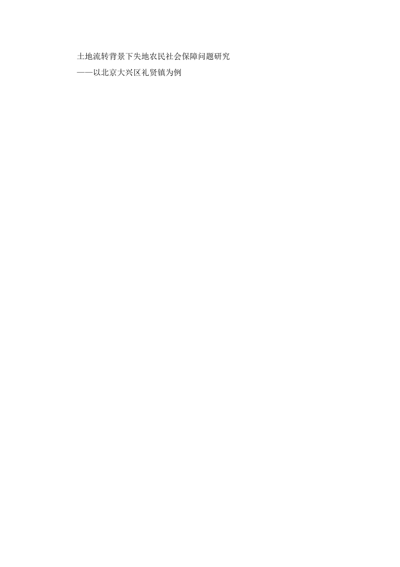 土地流转背景下失地农民社会保障问题研究一一以北京大兴区礼贤镇为例目录摘要Abstract..1绪论1.1研究背景、目的及意义31.1.1研究背景31.1.2研究目的…1.1.3研究意义.41.2国内外研究综述…51.2.1国内研究现状.…51.2.2国外研究现状.71.2.3国内外研究评述91.3研究内容与方法91.3.1研究内容…1.3.2研究方法…101.4研究思路…2概念界定及相关理论…122.1概念界定122.1.1失地农民社会保障122.1.2公民权利与失地农民社会保障权利122.1.3土地流转132.2相关理论…132.2.1新公共服务理论…132.2.2凯恩斯社会保障理论142.2.3社会保障话度水平理论…143大兴区礼贤镇农村社会保障现状…153.1大兴区礼贤镇土地流转概况…3.1.1大兴区礼贤镇简介153.1.2土地对大兴区礼贤镇村民的保障作用.…153.1.3大兴区礼贤镇土地流转情况.…3.1.4土地流转对大兴区礼贤镇村民的不同影响..173.2大兴区礼贤镇社会保障概况及与全国社保对比分析.183.2.1国家角度保险情况…183.2.2以盈利为目的保险情况.184大兴区礼贤镇农村社会保障存在的问题调查分析…194.1调查问卷的设计、发放与回收与分析…194.1.1样本基本情况统计描述分析194.1.2调查问卷的分析.…4.2国家职能方面调查分析..204.2.1保障项目较为单一204.2.2保障标准略有不当…4.3基层政府方面调查分析4.3.1政策宣传不力…214.3.2执行力度较低…224.3.3资金来源不足224.4土地流转背景下失地农民方面调查分析..224.4.1存在养老问题.224.4.2存在就业问题.….224.4.3意识转变问题..235大兴区礼贤镇改进农村社会保障问题的对策.235.1大兴区礼贤镇农村社会保障体系的构建.235.1.2构建思路5.1.3构建内容.265.2国家方面5.2.1增加农村社保项目….285.2.2调整农村社保标准.305.2.3优化农村社保形式.…