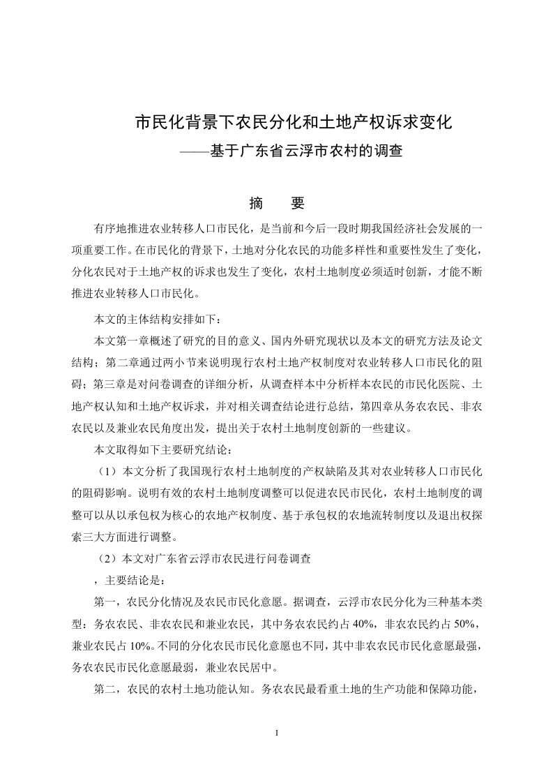 市民化背景下农民分化和土地产权诉求变化基于广东省云浮市农村的调查摘要有序地推进农业转移人口市民化,是当前和今后一段时期我国经济社会发展的一项重要工作。在市民化的背景下,土地对分化农民的功能多样性和重要性发生了变化,分化农民对于土地产权的诉求也发生了变化,农村土地制度必须适时创新,才能不断推进农业转移人口市民化。本文的主体结构安排如下:本文第一章概述了研究的目的意义、国内外研究现状以及本文的研究方法及论文结构:第二章通过两小节来说明现行农村土地产权制度对农业转移人口市民化的阻碍:第三章是对问卷调查的详细分析,从调查样本中分析样本农民的市民化医院、土地产权认知和土地产权诉求,并对相关调查结论进行总结,第四章从务农农民、非农农民以及兼业农民角度出发,提出关于农村土地制度创新的一些建议。本文取得如下主要研究结论:(1)本文分析了我国现行农村土地制度的产权缺陷及其对农业转移人口市民化的阻碍影响。说明有效的农村土地制度调整可以促进农民市民化,农村土地制度的调整可以从以承包权为核心的农地产权制度、基于承包权的农地流转制度以及退出权探索三大方面进行调整。(2)本文对广东省云浮市农民进行问卷调查,主要结论是:第一,农民分化情况及农民市民化意愿。据调查,云浮市农民分化为三种基本类型:务农农民、非农农民和兼业农民,其中务农农民约占40%,非农农民约占50%,兼业农民占10%。不同的分化农民市民化意愿也不同,其中非农农民市民化意愿最强,务农农民市民化意愿最弱,兼业农民居中。第二,农民的农村土地功能认知。务农农民最看重土地的生产功能和保障功能,非农农民最看重土地的财产功能,以农为主兼业农民对土地的认知情况类似于务农农民,以非农为主兼业农民对土地的认知情况类似于非农农民。第三,云浮市农民对农村土地功能的认知程度也各有不同。务农农民最看重土地的生产功能和保障功能,非农农民最看重土地的财产功能,以农为主的兼业农民则类似于务农农民,以非农为主的兼业农民则类似于非农农民。第四,云浮市农民对农村土地产权制度的认知普遍存在不清晰的情况。农户对集体土地产权归谁所有、与谁签订承包合同、土地流转后承包经营权归谁所有、土地流转及增值后所得收益归谁所有、承包的土地能否抵押等问题仍然认识不清。第五,市民化背景下,分化农民对土地产权的诉求有共同之处,也存在差异。无论哪一种分化农民,都对集体所有权、承包权以及收益权有着强烈的诉求:务农农民和以农为主的兼业农民对土地使用权有着强烈的诉求,非农农民和以非农为主的兼业农民对土地的流转权和有偿退出权有着强烈的诉求。(3)着眼于分化农民的土地产权诉求,本文提出一下建议。在农村土地制度创新方面,针对务农农民,需要对以承包权为核心的农地产权制度进行创新:针对非农农民,需要基于承包权的农地流转制度的创新:针对市民化的农民,需要积极探索以退出权为核心的农村土地制度。关键词:市民化:农民分化:农民土地产权诉求目录1.2.1研究目的..1.2.2研究意义....1.3文献综述...1.3.1国内研究.21.3.2国外研究...1.3.3综合述评..2现行农村土地产权制度对农业转移人口市民化的阻碍..72.1现行农村土地制度的产权安排......72.2现行农村土地制度的主要缺陷92.2.2产权残缺102.3现行农村土地制度对农民市民化的影响..102.3.1产权模糊对农民市民化的影响102.3.2产权结构残缺对农民市民化的影响112.3.3流动性差对农民市民化的影响1112123.2调查样本..123.3样本农民分化情况.·133.4样本农民的市民化意愿..143.4.1分化农民市民化意愿基本情况143.4.2分化农民市民化意愿影响因素...153.5样本农民的土地功能认知.·163.5.1我国农村土地的基本功能....