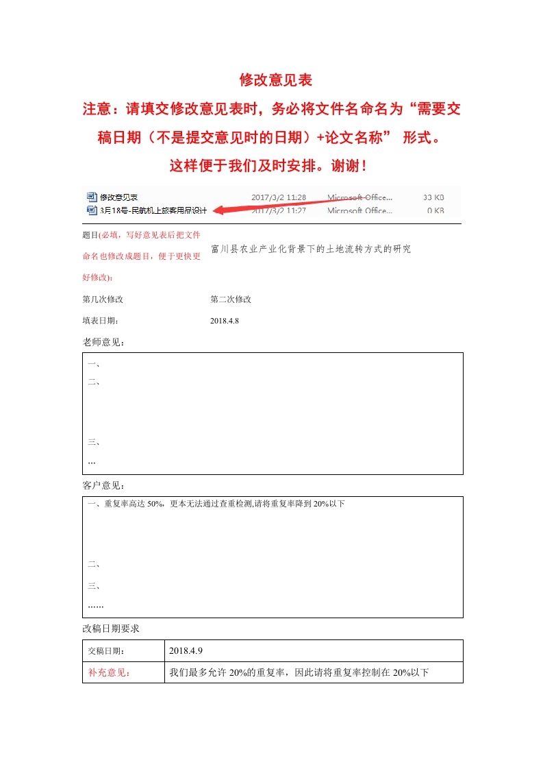 修改意见表注意:请填交修改意见表时,务必将文件名命名为“需要交稿日期(不是提交意见时的日期)+论文名称”形式。这样便于我们及时安排。谢谢!2017/3/211:28Microseft-Office...33 KB趣目(必填,写好意见表后把文件富川县农业产业化背景下的土地流转方式的研究命名也修改成题目,便于更快更第几次修改第二次修改填表日期:2018.4.8老师意见:客户意见:一、重复率高达50%,更本无法通过查重检测.请将重复率降到20%以下三、改稿日期要求交稿日期:2018.4.9补充意见:我们最多允许20%的重复率,因此请将重复率控制在20%以下修改须知:1.因修改需要根据意见查阅相关资料,修改论文内容一般三天左右,格式小问题可以加快,硕士博士毕业论文内容五天到一周左右,如需要加急修改,请和客服详谈。2笼统的意见,恕不修改。您要说出详细修改的意见哦,否则我们也不清楚您的想法。2.请不要将意见一点一点的提出来,请全部整理好以后,一次性发给我们,单独的意见不予受理。3.在与初衷无明显出入、不改变题目、文章整体思路和大框架的前提下,免费修改。换题目、大修改视为重写,不予免费。4.凡在成文后换题、追加、细化写作要求,属买家本身的责任,恕不免费修改,敬请谅解。
