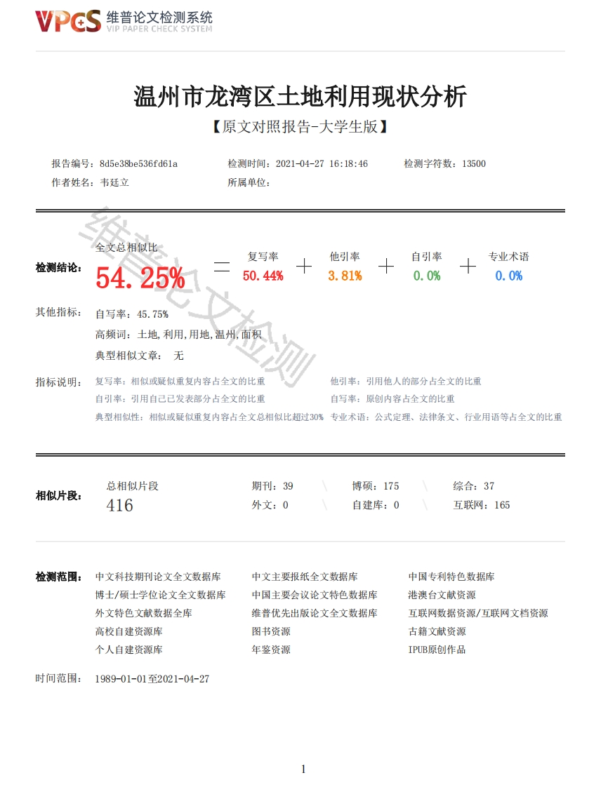 维普论文检测系统/IP PAPER CHECK SYSTEM温州市龙湾区土地利用现状分析【原文对照报告-大学生版】报告编号:8d5e38be536fd61a检测时间:2021-04-2716:18:46检测字符数:13500作者姓名:韦廷立所属单位:全文总相似比复写率他引率自引率专业术语检测结论:54.25%50.44%3.81%0.0%0.0%其他指标:自写率:45.75%高频词:土地,利用,用地,温州,面积典型相似文章:无指标说明:复写率:相似或疑似重复内容占全文的比重他引率:引用他人的部分占全文的比重自引率:引用自己已发表部分占全文的比重自写率:原创内容占全文的比重典型相似性:相似或疑似重复内容占全文总相似比超过30%专业术语:公式定理、法律条文、行业用语等占全文的比重总相似片段期刊:39博硕:175综合:37相似片段:416外文:0自建库:0互联网:165检测范围:中文科技期刊论文全文数据库中文主要报纸全文数据库中国专利特色数据库博士/硕士学位论文全文数据库中国主要会议论文特色数据库港澳台文献资源外文特色文献数据全库维普优先出版论文全文数据库互联网数据资源/互联网文档资源高校自建资源库图书资源古籍文献资源个人自建资源库年鉴资源IPUB原创作品时间范围:1989-01-01至2021-04-27维普论文检测系统VIP PAPER CHECK SYSTEM原文对照颜色标注说明:■自写片段■复写片段(相似或疑似重复)口引用片段(引用)■专业术语(公式定理、法律条文、行业用语等)目录摘要1关键词11引言11.1研究内容及目的11.2国内外研究动态21.2.1国外研究动态21.2.2国内研究动态21.3研究方法32温州市龙湾区土地利用现状分析32.1温州市龙湾区概况32.1.1温州市龙湾区行政辖区范围32.1.2温州市龙湾区自然情况32.1.3温州市龙湾区社会经济概况42.2温州市龙湾区土地利用现状分析42.2.1土地利用现状42.2.2土地利用特点62.2.3土地利用变化情况62.3温州市龙湾区土地利用存在的问题72.3.1人地矛盾日益凸显72.3.2城乡空间布局有待整合72.3.3城镇用地结构不合理72.3.4土地生态环境趋于恶化82.3.5违法用地现象屡禁不止83促进温州市龙湾区土地合理利用的建议83.1严格保护耕地,守住耕地红线83.2控制建设用地的无序扩张,整合城乡布局83.3严格保护生态用地,充分发挥未利用地的价值93.4促进旅游产业发展,合理增加绿化面积93.5调整土地利用结构,优化布局93.6改造城中村时关注农民需要103.7加强污染治理,提高环境质量103.8加强监察力度,坚持依法行政102维普论文检测系统VIP PAPER CHECK SYSTEM4结论10参考文献12致谢13附录14温州市龙湾区土地利用现状分析摘要:土地,作为一种全人类生产和生活的基础保障性质资源,它的不可再生与社会经济人口迅速发展现状的矛盾越来越大。特别是在人们集中生活的城市里,由于人口不断的增多而土地的数量却是固定不变的,人类和土地之间的矛盾越来越激烈,日常生活中随处可见的堵车、乱丢垃圾以及房租上涨等城市问题就是因为这样而产生的。在本文章中,尝试通过对温州市龙湾区的土地利用情况进行研究和剖析,发现其出现的问题并因地制宜的提出合理建议从而使温州市龙湾区的土地资源得到充分有效的使用,人们的生活水平得到合理有效的改善,社会经济的发展得到足够有力的保障。关键词:土地:土地利用:土地合理利用;龙湾区土地合理利用1引言土地是全人类生产和生活的基础保障性质资源,它同时也是不可再生的。它固定不变的数量和人类不断发展的数量之间的矛盾引发了各种问题,因为人越多,所需要的土地数量也越多。我们无法改变土地的数量,但我们可以在有限的数量中创造无限的、可持续发展的价值,这就要求我们必须充分合理的利用它,有效的保护它。随着科学技术的发展,社会经济的发展越来越迅速,城市化的速度也越来越迅速,城市人口的数量越来越多,很多城市都存在着因为人地矛盾的问题。不可置否,温州市龙湾区的土地利用也存在着或多或少的问题。首先是肉眼可见的城市的范围越来越大,城镇向外扩张的面积也越来越大,每年都有在建设的新楼,每年都有被新占的土地,耕地面积越来越少,人地矛盾越来越激烈:其次是有些空地空在那里没有被利用,但是又去占用耕地进行建设,更有年年都在翻新的楼房,这些现象都说明人们没有深刻认识到土地的合理利用的重要性:再次是公园的数量越来越少,且公园的绿化没有人打理,有些绿地都己经荒了,但是房屋建设、商业建筑的数量却越来越多,这些说明温州龙湾的用地结构存在问题:最后是城市里有很多居住区、工业区混合的现象,这样会带来噪声污染、固体、液体和气体等污染,对人们的日常生活环境影响很大,使人们的生活质量下降,这种现象在旧城区最为普遍。以上的问题都说明温州市龙湾区的土地利用情况存在很多问题,对于土地资源的重要性还没有一个正确的认知。对于这些问题,则需要我们在了解和分析的基础之上提出相应的建议进行解决。1.1研究内容及目的温州市为浙江省地级市,是阀门、皮革之乡。它发展得比较早,在初期的城市发展过程中由于没有很好的考虑到土地资源的可持续利用,出现很多不合理利用土地的情况,比如乱占乱用,造成土地资源浪费的现象。龙湾区作为温州市三大主城区的其中一个城区,它不可置否也存在着相关土地不合理利用的情况,随之而来的居住拥挤、环境污染、经济发展不平衡和土地资源浪费的问题影响着城市的发展。在这个文章中,