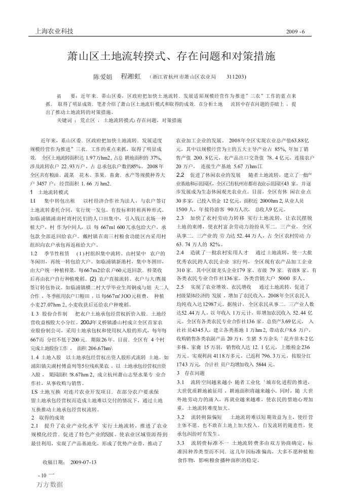 上海农业科技2009-6萧山区土地流转揆式、存在问题和对策措施陈爱娟程湘虹(浙江省杭州市薄山区农业局311203)翦要:近年来。蒂山区委,区政府把加快土地流转。发展适陌规模经营作为推进”三农”工作的蓝点来抓。取得了明显成效。笔者介绍了萧山区土地流轩模式和取得的成效。在分析土地流转中存在问愿的芬础上,提出了推动土地流转的对策措施。近年来,系山区委。区政府把加快土地流转。发展适度农业加工企业的发展。2008年全区实现农业总产值63.88亿规模经营作为推进”三衣。工作的重点来抓,取得了明显成元,其中以规模经营为主的五大主导产业占85%,年加丁销效。全区土地流转面积达1.97万hm2,占总耕地面积的37%,售产值200.8亿元,衣产品出口交货值78.4亿元,连接农户涉及流转浓户22.93万户,占总承包农户数的85%。2008年20万户,连接生产基地5.67万hm江全区共有粮油、装菜花木、茶果。奋禽。水产等规摸种养大2.2促进了休闲农业的发展随者土地流转,建立了指产户3457户:经营面积1.66万hm2.基地和示范园区,全区己有杭州市都市示范园区43家,并逐1土地流转模式步发展成为生态休闲观光农业点。目前,全区有体闲农业点LI集中转包出租以村经济合作社为法人,与农户签订30多家,己投入资金12亿元,面积近2000m2.从业人员土地流转委托合同,实行统一发包,有投标和转租两种形式。1500人,年接特游客90万人次,总收人9亿元.如临浦镇浦南村将村民们的人口田集中,引入钱江衣场一种2.3加快了衣村劳动力转移实行土地流转,让农民摆脱植大户,村作为中间人,以每667ml600兀承包给大户,承土地的束缚,使衣村富余劳动力纷纷从军二。三产业,全区包款全部返回给农户。戴村镇在南三村粮食功能区内采用村从挛二.三产业的劳力达52.44万人,占全区农村劳动力组织向农户承包再返租给大户。63.74万人的82%.2.4造就了一批农村实用人才通过士地流转,使一大批冬闲田,再统一转包给大户。如临浦镇新港村,集中冬因田,优秀农民跨人农民企业家行列,全区现有农产品加工企业由大户统一种植梓菜。每667m2给农户60元返回款.梓菜收310家.其中区级龙头企业179家、市级79家.省级8家。有后再由衣户自行种植晚稻。2)农户直接流转。衣户与大直接各类衣民专业合作社136家。各类营销大户5000多人。签订转包协议。如临浦镇横二村大学毕业生周钢成与姐夫二人2.5实现了农业增效、在民增收通过土地流转,促进了合作,冬季租用农户口粮田,以每667mJ00元租费,种植村级某体经济的发展,增加了农民收入,2008年全区农民人小麦27.07hm2,小麦收获后还给农户种晚稻。均纯收入达12987元。据统计,全区农民从事二.三产业人数L,3股份合作制把衣户土地承包经营权折价入股.土地经达52.4万人,以年收入1万元计,即增加浓民收入52.44亿营收益按股大小分红。200J年义桥镇潘山村成立全区首家农元。全区有各类农民专业合作社136家,总资产3.69亿元,入业股份制公司,采用士地承包权和使用权入股的形式,每年每社社员4345人,建立各类基地1万m2,带动农户8.6万户,667而分红不低于200元.期限26年。目前.全区有4个村收购销售各类农副产品20万t、生猪5万余头、花卉苗木2亿完成土地股份工作,面积206.67hm多株、家禽15万羽,销售收人达12.1亿元,上缴税金2361.4土地入股以土地承包经营权出资人股形式流转土地。如万元,实观利润4118万多元,已返利796.3万元,按股分红浦阳镇尖湖村博益列等5位残疾果农,以士地承包经营权出资1743万元。合计社员户均增加收入584元。入股,果园面积8.67hm2,成立抗州萧山志坚水果专业合3存在问愿作社,从事收购与销售。3.1流转空间越来越小随者工业化'城市化进程的推进,LS土地互换对连片农业开发项目.在部分农户要求保大世优质耕地被征用,耕地面积将越来越小。同时,随大世留土地承包经营权而造成土地难以交付的情况下,通过土地外地劳动力的涌入,再就业越来越难,使农民的惜地心理加互换推动土地承包经营权流转,重,土地流转难度加大。2取得的成效3.2流转朔限偏短士地流转难以短期效益为主,使经营2.1提升了农业产业化水平实行土地流转,推进了农业主体不愿、也不政在土地上加大投入。自发流转的随意性,使规模化经营。促进了特色产业的发展,使农业区域资源得到承包纠纷时有发生。最佳利用,实现了产品基地化,形成了优势产业带,推动了3.3流转费标准不一土地流转费多由双方协商确定,标准因种养类型而不同。这几年因标准偏高,大多不愿种植粮收稿日期:200907-13食作物,影响粮食播种面积的稳定。万方数据上悔农业科技2009-63.4引导不够从事土地流转的服务组织少,村级千部对提供系列服务。积极引导各类规模经营主体,实现土地、资士地流转存在畏难情绪,主动性不够。金技术。劳动力等生产要素的有效配置,并提供“统一”服3.5市场风险大箫山的农刷产品以鲜销或粗加工为主,精务。加强信贷支待力度,探索土地经营权、设施抵押贷款办深加工潜后,附加值不高,市场风险大,也影响了土地流转。法。效局有资金、懂技术、善经营、会管理的种养大户、农3.6思想工作难做经营管理者素质不商,也影响了土地民专业合作组织,农业龙头企业等投资农业,开展规模经营。流转的推进。宣传不够,衣民认识不高,其传统保守思想一要大力发展非农产业,加强就业技能培训,加快农村劳动力时难以留决,农