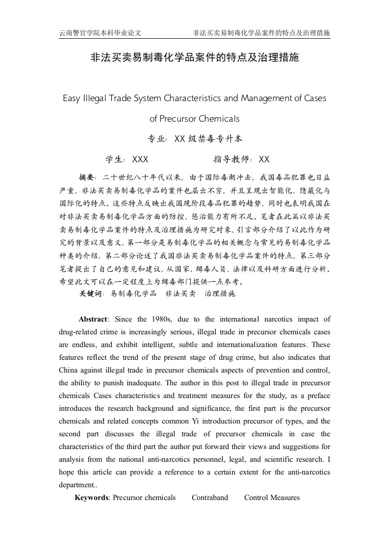 云南警官学院本科毕业论文非法买卖易制毒化学品案件的特点及治理措施非法买卖易制毒化学品案件的特点及治理措施Easy Illegal Trade System Characteristics and Management of Casesof Precursor Chemicals专业:XX级禁毒专升本学生:XXX指导教师:XX摘要:二十世纪八十年代以来,由于国际毒潮冲击,我国毒品犯罪也日益严重,非法买卖易制毒化学品的案件也层出:不穷,并且呈现出智能化、隐蔽化与国际化的特点。这些特,点反映出我国现阶段毒品犯罪的趋势,同时也表明我国在对非法买卖易制毒化学品方面的防控、惩治能力有所不足。笔者在此篇以非法买卖易制毒化学品案件的特,点及治理措施为研究对象,引言部分介绍了以此作为研究的背景以及意义,第一部分是易制毒化学品的相关概念与常见的易制毒化学品种类的介绍,第二部分论述了我国非法买卖易制毒化学品案件的特点,第三部分笔者提出了自己的意见和建议,从国家、舞毒人员、法律以及科研方面进行分析。希望此文可以在一定程度上为舞毒部门提供一点参考。关键词:易制毒化学品非法买卖治理措施Abstract:Since the 1980s,due to the international narcotics impact ofdrug-related crime is increasingly serious,illegal trade in precursor chemicals casesare endless,and exhibit intelligent,subtle and internationalization features.Thesefeatures reflect the trend of the present stage of drug crime,but also indicates thatChina against illegal trade in precursor chemicals aspects of prevention and control,the ability to punish inadequate.The author in this post to illegal trade in precursorchemicals Cases characteristics and treatment measures for the study,as a prefaceintroduces the research background and significance,the first part is the precursorchemicals and related concepts common Yi introduction precursor of types,and thesecond part discusses the illegal trade of precursor chemicals in case thecharacteristics of the third part the author put forward their views and suggestions foranalysis from the national anti-narcotics personnel,legal,and scientific research.Ihope this article can provide a reference to a certain extent for the anti-narcoticsdepartment..Keywords:Precursor chemicalsContrabandControl Measures云南警官学院本科毕业论文非法买卖易制毒化学品案件的特点及治理措施目录一、易制毒化学品相关概念及常见种类1(一)易制毒化学品概念11、易制毒化学品…2、易制毒化学品犯罪.2(二)易制毒化学品常见种类1、被列入特别管制的化学品…2、被列入特别监视的易制毒化学品…2二、非法买卖易制毒化学品案件的特点3(一)数量大宗化…4(二)品种多样化。(三)内外勾结…4(四)买卖手段狡猾(五)伪装隐蔽5(六)查处困难…1、定性难…2、取证难…3、来源及去向难查明…4、打击难…三、非法买卖易制毒化学品案件的治理措施5(一)扩大预防教育宣传禁吸戒毒成果51、坚持预防为本…52、坚持以人为本.6(二)坚持堵源截流严厉打击…61、坚持堵源截流.62、严厉打击…3、从严管理做好监管….6(三)加强管理整治提高禁毒科研力度1、综合重力和重点治理相结合…62、加强对娱乐场所的监控6(四)完善法律适用性…71、界定药毒范畴.2、成瘾标准统一化…73、完善定罪量刑相关法规7云南警官学院本科毕业论文非法买卖易制毒化学品案件的特点及治理措施(五)加强对易制毒化学品的管理.7(六)提高缉毒人员缉查能力…总结8参考文献91011