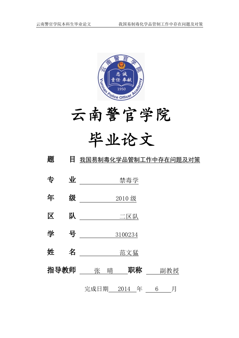 云南警官学院本科生毕业论文我国易制毒化学品管制工作中存在问题及对策官忠诚Yunn责任奉献1950Acade云南警官学院毕业论文题目我国易制毒化学品管制工作中存在问题及对策专业禁毒学年级2010级区队二区队学号3100234姓名范文猛指导教师张晴职称副教授完成日期2014年6月云南警宫学院本科生毕业论文我国易制毒化学品管制工作中存在问题及对策声明本人郑重声明:所呈交的毕业论文,是本人在指导教师的指导下,独立进行研究所取得的成果。除文中已经注明引用的内容外,本论文不包含任何其他个人或集体已经发表或撰写过的科研成果,也不包含为获得其他教育机构的学位或证书而使用过的材料。我承诺,论文中的所有内容均真实、可信。本论文的成果属于云南警官学院所有。论文(设计)作者签名:年月日云南警官学院本科生毕业论文我国易制毒化学品管制工作中存在问题及对策目录引言2一、易制毒化学品非法流失现状和危害(一)贩卖数量大,品种多样化…4(三)易制毒化学品的贩卖空间不断扩大…·4三、我国贩卖易制毒化学品案件的成因...(一)涉毒区域不断扩大,毒品需求量日益增加5(二)不法分子唯利是图,违法生产贩卖易制毒化学品(三)由易制毒化学品合成的新型毒品迅速兴起…5(四)我国对药品类易制毒化学品的监管仍然存在漏洞.6四、我国易制毒化学品的管制和防控对策...(一)继续加大易制毒化学品法律法规的宣传力度6(二)健全和完善易制毒化学品法律法规6(仁)加快推进易制毒化学品管理信息系统建设…7(四)开展易制毒化学品国际协查合作.8结语9参考文献911