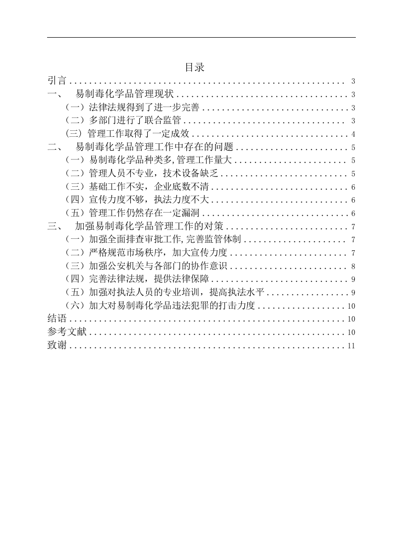 目录一、易制毒化学品管理现状·..3(一)法律法规得到了进一步完善(三)管理工作取得了一定成效..二、易制毒化学品管理工作中存在的问题5(一)易制毒化学品种类多,管理工作量大5(二)管理人员不专业,技术设备缺乏(三)基础工作不实,企业底数不清.··..(四)宣传力度不够,执法力度不大.·(五)管理工作仍然存在一定漏洞.··.·三、加强易制毒化学品管理工作的对策(一)加强全面排查审批工作,完善监管体制7(二)严格规范市场秩序,加大宣传力度.·.(三)加强公安机关与各部门的协作意识.·····9(六)加大对易制毒化学品违法犯罪的打击力度....10结语.参考文献云南警官学院本科生毕业论文易制毒化学品管理工作中存在的问题及对策易制毒化学品管理工作中存在的问题及对策专业:禁毒学学生:赵康指导老师:张晴【摘要】近年来,由于我国制毒犯罪形势日益严峻,国家对易制毒化学品的管理没有足够重视,易制毒化学品违法犯罪案件呈逐年上升趋势。本文笔者客观阐述了当前国内易制毒化学品管理工作现状,具体分析了易制毒化学品在管理工作中存在的问题,进而提出了管理易制毒化学品的对策,以便更好地对易制毒化学品进行管理,从源头上過制毒品的危害。【关键词】易制毒化学品;管制;问题;对策On the easy problems and countermeasures system precursorchemicals control efforts[Abstract]In recent years,the terrain of the drug crime more and moresevere,there is not enough attention to control of precursor chemicals,the lawsand regulations control of the precursor chemicals at present exist a great dealof insufficient,it cause that criminal acts of produce drugs increase with years.The author expound the situation of the country to prevent and investigate il legalactivities of manufacture drug,and analysis it exist some issues of the work tocontrol the illegal production,operation,purchase and transportation ofprecursor chemicals,then put some effective countermeasure forward to controlprecursor chemicals,in order to better control it,and to curb the harm of theprecursor chemicals at the source.[Keywords]Precursor chemicals;Control;Problem;Strategy2云南警宫学院本科生毕业论文易制毒化学品管理工作中存在的问题及对策引言随着国际毒巢的泛滥,新型毒品开始出现在我国各个地区,合成类新型毒品在我国的泛滥形势日趋严重,因易制毒化学品是非法制造毒品中的主要原料,所以大量易制毒化学品也就经常走私、贩运,流入制毒渠道。可见要从源头上减少毒品危害,就得严格规范易制毒化学品的管理,堵源截流。“没有易制毒化学品,就没有毒品”已经成为了全球人们的共识,因而易制毒化学品的管制工作是何其重要,然而由于易制毒化学品的品种众多,管理混乱,管理结构不合理,易制毒化学品的监管工作存在严重挑战。为进一步加强易制毒化学品管理,从源头上遏制毒品的泛滥,必须清楚易制毒化学品的管理现状,明确易制毒化学品在管理工作中存在的问题,寻求易制毒化学品的管理对策。易制毒化学品管理现状(一)法律法规得到了进一步完善国家陆续制定颁布了《易制毒化学品管理条例》、《易制毒化学品购销和运输管理办法》等10余部行政法规和部门规章,形成了一套完整的监管制度:开展《易制毒化学品管理条例》修订工作,适应国内外毒品形势和易制毒化学品流失情况新变化。6月,最高法、最高检和公安部三部委联合发布《关于办理走私、非法买卖麻黄碱类复方制剂等刑事案件适用法律若干问题的意见》:9月,国家药监局、公安部、卫生部下发《关于加强含麻黄碱类复方制剂管理有关事宜的通知》,从源头上遏制麻黄碱类复方制剂流入非法渠道被用于制造毒品;8月,公安部、商务部、卫生部、海关和安监等部门联合发布《关于管制邻氯苯基环戊酮的公告》,将制造羟亚胺的原料邻氯苯基环戊酮列入《易制毒化学品管理条例》附表第一类易制毒化学品进行管制。有了法律制度的保障,在执法过程中能有法可依,禁毒执法部门能更好地通过配套法律来进行监管。(二)多部门进行了联合监管近年来,在各地区禁毒委员会的领导和组织和协商下,各地相关部门积极配合,共同协商,对易制毒化学品管制工作中存在的问题提出相应的处理措施,共同讨论措施的合理性和可行性,最终提炼出确获的易制毒化学品贩卖案件中,都是通过公安、商务、工商等多部门协调配合下破获的实、可行、有效的解决方案,对易制毒化学品管制中的问题有了彻底有效地处理:在很多破,多方都发挥自己的力量,多管齐下,同抓共管,形成了一条完整的打击毒品犯罪链条。四来源于《中国禁毒报告》[R].2013