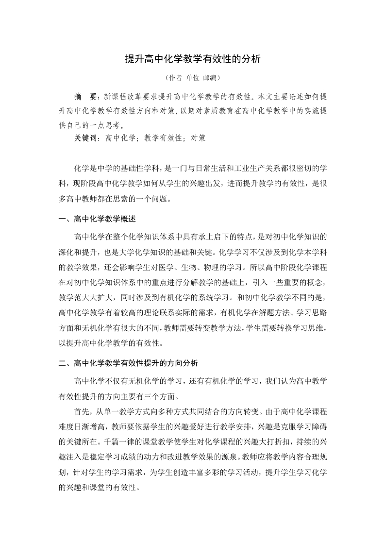 提升高中化学教学有效性的分析(作者单位邮编)摘要:新课程改革要求提升高中化学教学的有效性。本文主要论述如何提升高中化学教学有效性方向和对策,以期对素质教育在高中化学教学中的实施提供自己的一点思考。关镜词:高中化学;教学有效性;对策化学是中学的基础性学科,是一门与日常生活和工业生产关系都很密切的学科,现阶段高中化学教学如何从学生的兴趣出发,进而提升教学的有效性,是很多高中教师都在思索的一个问题。一、高中化学教学概述高中化学在整个化学知识体系中具有承上启下的特点,是对初中化学知识的深化和提升,也是大学化学知识的基础和关键。化学学习不仅涉及到化学本学科的教学效果,还会影响学生对医学、生物、物理的学习。所以高中阶段化学课程在对初中化学知识体系中的重点进行分解教学的基础上,引入一些重要的概念,教学范大大扩大,同时涉及到有机化学的系统学习。和初中化学教学不同的是,高中化学教学有着较高的理论联系实际的需求,有机化学在解题方法、学习思路方面和无机化学有很大的不同,教师需要转变教学方法,学生需要转换学习思维,以提升高中化学教学的有效性。二、高中化学教学有效性提升的方向分析高中化学不仅有无机化学的学习,还有有机化学的学习,我们认为高中教学有效性提升的方向主要有三个方面。首先,从单一教学方式向多种方式共同结合的方向转变。由于高中化学课程难度日渐增高,教师要依据学生的兴趣爱好进行教学安排,兴趣是克服学习障碍的关键所在。千篇一律的课堂教学使学生对化学课程的兴趣大打折扣,持续的兴趣注入是稳定学习成绩的动力和改进教学效果的源泉。教师应将教学内容合理规划,针对学生的学习需求,为学生创造丰富多彩的学习活动,提升学生学习化学的兴趣和课堂的有效性。其次,从理论教学到理论和实践并重转变。人们的衣食住行都离不开化学,从工业生产到人们生活都离不开化学,化学知识在实践领域的应用性很强,实践需求是学习和研究的动力所在。教师应引导学生从实践锻炼学生解决实践问题的本领,用实践的思维去应对化学课程的学习,进而去除学生学习化学的焦虑感,使学生能够在实践过程中印证学习中的疑问,解决学习中遇到的各种问题,增强解决问题的能力。再次,从静态教学到动态教学转变。不是靠单纯的静态讲就能取得教学效果的,化学本质上是一门实用性的学科,需要和实践建立联系。化学理论形成的过程以及论证都要依托动态的实验方法,教材对各种化学反应的分析、化学材料的命名都仅仅停留在理论阶段,高中化学教学应该建立动态性,解除学生的疑惑,通过实验帮助学生构建化学的理论体系,提升高中化学教学的有效性。三、提升高中化学教学有效性具体对策现阶段需要提升高中化学教学的有效性,不断推动高中化学教学的水平的提升,推进素质教育在高中化学教学中的实施,具体来说应该从一下几个方面努力。(一)课堂教学的设计要具有动态性课堂教学是高中化学教学的主阵地,课堂教学是确保教学效果最重要、最基础的环节。现代信息技术的巨大发展丰富了课堂教学手段,为化学背景资料的回放和化学反应过程的演示提供了很好的便利条件条件,课堂教学应为高中化学理论建立动态的呈现载体,应当从动态教学的角度设计入手提升课堂教学的有效性。具体做法上,教师可以从理论的背景资料搜集开始对各个章节教学讲解,让学生对该章节有一个初步的认识,进而对课程树立相应的感性认识,不断提升学生的学习兴趣。在此基础上为让学生对课本中的知识形成直观印象,教师运用多媒体教学技术将相关的趣味性实验传递给学生,师生在动态教学的应用中可以更多地进行互动交流,在交流讨论的同时进行提问答疑,以利于学生直接将化学知识消化吸收。使课堂教学既尊重教材,又不局限于教材,教学效果得到提升。(二)实验教学的设计要体现主体性在高中化学实验教学中,要提升教学有效性就要提升学生的举一反三的能力,学生根据教师和教材的指导,通过教材要求的顺序,循序渐进的完成既定实验内容并不困难,但是要提升教学有效性,就需要教师策划更多的实验活动,以主导实验为契机,吸引学生从更深层次去应用所学的化学知识。教师可以将班级学生划分为若干小组,各个小组实行分工配合,每个小组负责一项主题实验。实验目的在于增强学生分析问题和解决实践问题的能力,内容以教材实验的延伸和拓展为主,每个小组首先自行演示和探讨,争取把问题在组内消化掉,实验成功后向大家演示,把自己实验的程序和关键点和其它组员教学交流,以求让学生学生学生主导整个实验过程,提升高中化学教学的有效性。(三)应用广义课堂的教学资源广义课堂的概念已经提出一段时间了,是指将教学的时间和空间延伸,充分利用各类适合教学有效性提升的教学手段,就是在教室、实验室以外引导学生教学化学学习。教师可组织学生开展化学沙龙活动,以提升理论实践相结合方面的能力,仍然是将全班学生划分为若干小组,各个小组在竞争的驱动下,充分发挥主观能动性和创造力,加深对理论知识的应用理解。另外,教师还可开通网络微博和微信,用现代网络的方法加强与学生之间的沟通,方便师生在课余时间的进一步交流,实现教学相长