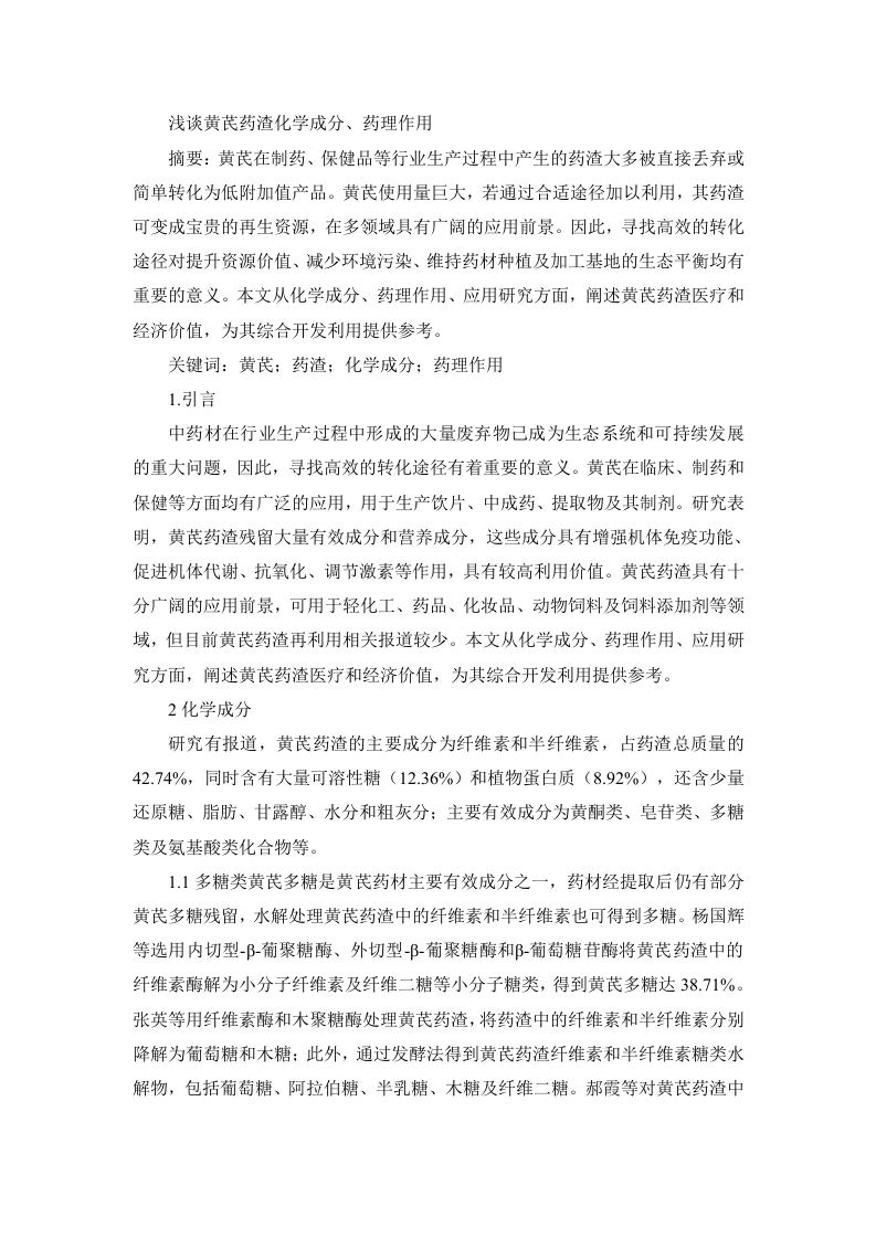 浅谈黄芪药渣化学成分、药理作用摘要:黄芪在制药、保健品等行业生产过程中产生的药渣大多被直接丢弃或简单转化为低附加值产品。黄芪使用量巨大,若通过合适途径加以利用,其药渣可变成宝贵的再生资源,在多领域具有广阔的应用前景。因此,寻找高效的转化途径对提升资源价值、减少环境污染、维持药材种植及加工基地的生态平衡均有重要的意义。本文从化学成分、药理作用、应用研究方面,阐述黄芪药渣医疗和经济价值,为其综合开发利用提供参考。关键词:黄芪:药渣:化学成分:药理作用1.引言中药材在行业生产过程中形成的大量废弃物己成为生态系统和可持续发展的重大问题,因此,寻找高效的转化途径有着重要的意义。黄芪在临床、制药和保健等方面均有广泛的应用,用于生产饮片、中成药、提取物及其制剂。研究表明,黄芪药渣残留大量有效成分和营养成分,这些成分具有增强机体免疫功能、促进机体代谢、抗氧化、调节激素等作用,具有较高利用价值。黄芪药渣具有十分广阔的应用前景,可用于轻化工、药品、化妆品、动物饲料及饲料添加剂等领域,但目前黄芪药渣再利用相关报道较少。本文从化学成分、药理作用、应用研究方面,阐述黄芪药渣医疗和经济价值,为其综合开发利用提供参考。2化学成分研究有报道,黄芪药渣的主要成分为纤维素和半纤维素,占药渣总质量的42.74%,同时含有大量可溶性糖(12.36%)和植物蛋白质(8.92%),还含少量还原糖、脂肪、甘露醇、水分和粗灰分:主要有效成分为黄酮类、皂苷类、多糖类及氨基酸类化合物等。1.1多糖类黄芪多糖是黄芪药材主要有效成分之一,药材经提取后仍有部分黄芪多糖残留,水解处理黄芪药渣中的纤维素和半纤维素也可得到多糖。杨国辉等选用内切型-阝葡聚糖酶、外切型-阝-葡聚糖酶和β-葡萄糖苷酶将黄芪药渣中的纤维素酶解为小分子纤维素及纤维二糖等小分子糖类,得到黄芪多糖达38.71%。张英等用纤维素酶和木聚糖酶处理黄芪药渣,将药渣中的纤维素和半纤维素分别降解为葡萄糖和木糖:此外,通过发酵法得到黄芪药渣纤维素和半纤维素糖类水解物,包括葡萄糖、阿拉伯糖、半乳糖、木糖及纤维二糖。郝霞等对黄芪药渣中提取的粗阿拉伯木聚糖进行分离纯化,得到8种水溶性多糖组分。刘磊等分析黄芪药渣中的4种半纤维素组分,发现其中AX-I-1为杂多糖,包括鼠李糖、阿拉伯糖、木糖、甘露糖、葡萄糖和半乳糖。2.2黄酮类黄芪总黄酮是黄芪重要的有效成分。马宏军采用色质联机法分别定量分析黄芪和黄芪药渣中的黄酮类物质,发现黄芪药材所含的5种黄酮类物质有3种出现在黄芪药渣中:2-[4羟基-3-甲氧亚苄基]-5-羟基-苯丙二氢呋喃-3-酮coumaran-5-ol-3-one,2-[4-hydroxy-3-methoxybenzylidene]-),7--2-(4-氧基苯苯吡喃酮(4H-1-benzopyran-4-one,7-hydroxy-2-(4-methoxyphenyl)),3,4-二羟基-3(3-羟基-2,4二甲氧基苯)2H苯吡喃7醇2H-1-benzopyran-7-o1,3,4-dihydro-3-(3-hydroxy-2,4-dimethoxyphenyl)-),依次为50.2%、35.1%、27.1%。黄芪药渣中还含有毛蕊异黄酮、芒柄花素等黄酮类成分。1.3皂苷类皂苷类是黄芪药材有效成分之一,其中黄芪甲苷是黄芪质量检定的指标成分,为一种三萜皂苷。研究表明,黄芪药渣仍含有大量黄芪甲苷。黄亚非等通过HPLC分别测定黄芪药材和药渣中黄芪甲苷含量,结果表明,黄芪甲苷在药渣中的含量为药材的72.08%。周萍等采用高效液相色谱-蒸发光散射法测得黄芪药渣中黄芪甲苷含量为0.74mgg。竺利红等测定黄芪药渣不同发酵时间发酵液中黄芪甲苷含量,发现发酵96h得到的黄芪甲苷含量最高,达(0.57±0.027)%。3药理作用研究黄芪药渣及其发酵产物具有抗菌、抗炎、镇痛、抗癌、抗氧化、增强免疫力、促生长等药理作用。3.1抑菌朱振元等研究黄芪药渣虫草发酵粉的抑菌作用,结果表明,黄芪药渣虫草发酵粉对沙门氏菌(G-)、金黄色葡萄球菌(G十)、枯草芽孢杆菌(G十)、大肠杆菌(G-)均具有抑制作用,作用强度依次降低:对部分真菌也具有抑菌效果,其中对曲霉Aspergillusspp.和青霉Penicilliumspp.的抑制作用最强。竺利红等[25]研究发现,黄芪药渣经棘孢木霉发酵后,对变形杆菌、沙门氏杆菌、枯草芽孢杆菌、金黄色葡萄球菌和大肠杆菌均具有抑制作用。3.2抗氧化刘磊等研究发现,黄芪药渣中多糖AX-I的各组分对超氧阴离子均具有清除作用。马宏军研究表明,黄芪药渣中的黄酮类成分可显著提高金鲫鱼肝脏内超氧化物歧化酶(S0OD)活性。闫先超研究黄芪药渣发酵制剂对青脚麻鸡生长性能及部分血清生化指标的影响,结果显示,发酵黄芪药渣发酵制剂可显著增加鸡血清总SOD含量。3.3抗抑郁陆明鸣等采用灵芝菌发酵黄芪药渣,并进行开场实验、悬尾试验和强迫游泳实验,发现芝芪菌质水提物可显著缩短悬尾和游泳不动时间,提示黄芪药渣发酵物具有一定的抗抑郁作用。3.4抗疲劳陈玉胜等采用芝芪菌质水提物灌胃30后测定小鼠负重游泳持续时间、运动后血清尿素氮水平、肝糖原含量、血清乳酸脱氢酶活力及平均体质量的增加量。结果显示,芝芪菌质水提物可使血清尿素氮水平显著降低,其他各项指标均显著提高,提示黄芪药渣发酵物具有抗疲劳作用。3.5调节尿酸陆潭等用黄芪药渣发酵产物对高尿酸血症模型小鼠进行试验,考察黄芪药渣发酵物抗高尿酸血症活性,结果显示,与模型对照组相比,给药组小鼠血清尿酸、肌酐和尿素氮水平均显著降低,而尿液尿酸