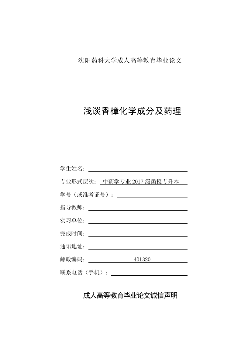 沈阳药科大学成人高等教育毕业论文浅谈香樟化学成分及药理学生姓名:专业形式层次:中药学专业2017级函授专升本学号(或准考证号):指导教师:实习单位:完成时间:通讯地址:邮政编码:401320联系电话(手机):成人高等教育毕业论文诚信声明本人郑重声明:所呈交的毕业论文,是本人在指导老师的指导下,独立进行研究工作所取得的成果,成果不存在知识产权争议,除文中已经注明引用的内容外,本论文不含任何其他个人或集体已经发表或撰写过的作品成果。对本文的研究做出重要贡献的个人和集体均已在文中以明确方式标明。本人完全意识到本声明的法律结果由本人承担。毕业论文作者签名:年月日目录第1章引言............m.m3第2章香樟化学成分2.1挥发油42.2黄酮类化合物…2.3木脂素类化合物2.4糖苷类52.5其他类第3章药理作用63.1抑菌活性63.2抗氧化活性.…63.3抗炎活性3.4神经系统活性3.5杀虫活性8总结…9参考文献10致谢…11