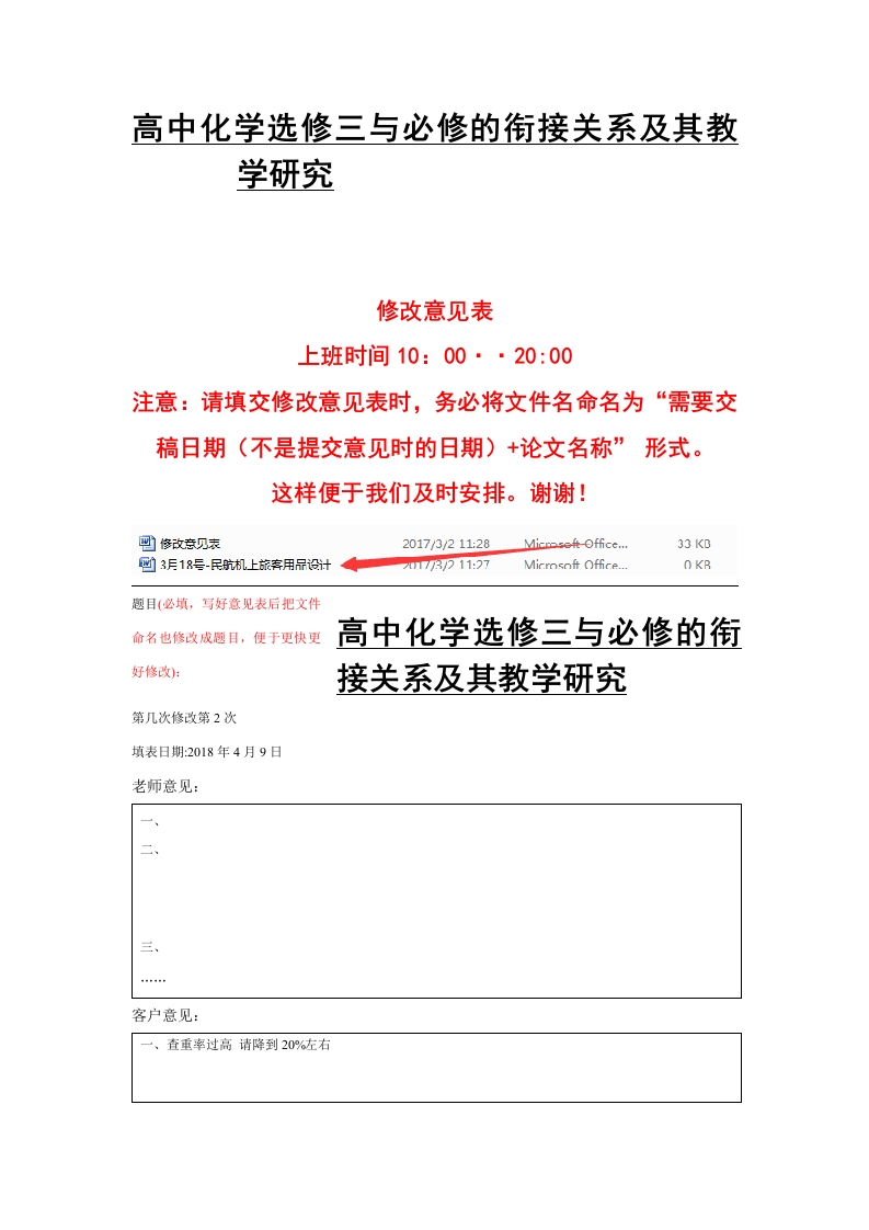 高中化学选修三与必修的衔接关系及其教学研究修改意见表上班时间10:00··20:00注意:请填交修改意见表时,务必将文件名命名为“需要交稿日期(不是提交意见时的日期)+论文名称”形式。这样便于我们及时安排。谢谢!2017/3/211:28则3月18号-民航机上旅存用品设汁趣目(必填,写好意见表后把文件命名也修改成趣目,便于更快更高中化学选修三与必修的衔好修改):接关系及其教学研究第几次修改第2次填表日期:2018年4月9日老师意见:三、客户意见:、查重率过高请降到20%左右二、请看查重报告修改三、改稿日期要求交稿日期:2018年4月11日补充意见:4月11号要谢谢!修改须知:1.因修改需要根据意见查阅相关资料,修改论文内容一般五天左右,格式小问题可以加快,硕士博士毕业论文内容一周左右,如需要加急修改,请和客服详谈。2笼统的意见,恕不修改。您要说出详细修改的意见哦,否则我们也不清楚您的想法。2.请不要将意见一点一点的提出来,请全部整理好以后,一次性发给我们,单独的意见不予受理。3在与初衷无明显出入、不改变题目、文章整体思路和大框架的前提下,免费修改。换题目、大修改视为重写,不予免费。4.凡在成文后换题、追加、细化写作要求,属买家本身的责任,恕不免费修改,敬请谅解。