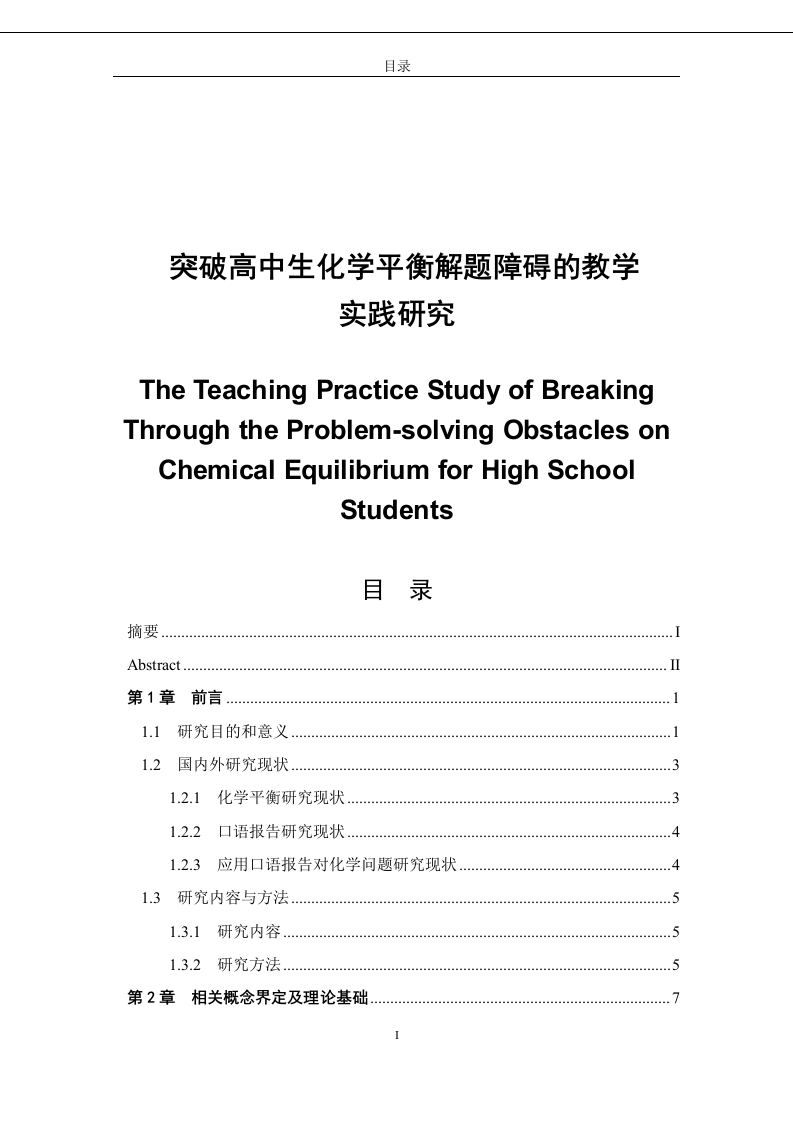 目录突破高中生化学平衡解题障碍的教学实践研究The Teaching Practice Study of BreakingThrough the Problem-solving Obstacles onChemical Equilibrium for High SchoolStudents目录Abstract.…第1章前言1.1研究目的和意义…1.2国内外研究现状31.2.1化学平衡研究现状31.2.2口语报告研究现状.1.2.3应用口语报告对化学问题研究现状1.3研究内容与方法…1.3.1研究内容1.3.2研究方法第2章相关概念界定及理论基础7目录2.1相关概念2.1.1问题72.1.2问题解决.72.1.3障碍2.1.4诊断…92.1.5策略92.2理论基础研究.92.2.1问题解决理论基础研究2.2.2问题解决心理过程研究2.2.3化学问题解决心理过程研究2.2.4化学问题解决障碍…2.2.5解决策略的研究.16第3章解题障碍的诊断及有效解题策略分析183.1化学平衡类问题解决过程中思维障碍的诊断.183.1.1日的.183.1.2对象.183.1.3测查方法与过程.….183.1.4结果与分析.83.2化学平衡类问题解决过程中行为表现测查.203.3学优生与中等生化学平衡计算题有效策略个案分析…233.4高中生化学平衡问题解决过程总分析与评价253.5化学平衡类问题解题策略…25第4章解题策略实施效果研究274.1研究目的…274.2研究内容4.3研究方案274.3.1研究对象274.3.2目录4.3.3研究过程.…4.3.4教学实践前的访谈记录274.4.1正逆混合推理策略训练284.4.2模糊思维策略训练.314.4.3总结反思策略训练324.5化学平衡解题策略训练的教学策略与基本原则344.5.1化学平衡解题策略训练的教学策略4.5.2化学平衡解题策略训练的基本原则.354.6课后具体做法,..364.6.1每个学生建立错题本…4.6.2构建知识网络.….364.6.3小组合作分享解题方法364.6.4面谈、面批、面改.364.7测试结果与分析374.7.1教学实践后的访谈记录.374.7.2实验前后学生解题能力对比分析38第5章总结与反思.435.1研究结论..435.2研究反思…43参考文献.…45附录A化学平衡前测试题48附录B化学平衡后测试题49关于学位论文使用授权声明关于学位论文原创性的声明..