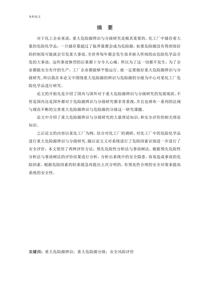 本科论文摘要对于化工企业来说,重大危险源辨识与分级研究是极其重要的。化工厂中储存着大量的危险化学品,一旦储存量超过了临界量都会成为危险源,如果危险源没有得到很好的控制很可能就会引发重大事故。全世界每年都会发生很多骇人听闻的由危险化学品引发的大事故,这些事故惨烈的后果都十分令人心痛。所以为了这一切都不发生,为了企业都能安全有序的生产,工厂企业都能够平稳运行。就一定要做好重大危险源辨识与分级研究。所以我在本论文中围绕重大危险源的辨识与危险源的分级为中心对某化工厂危险化学品进行研究。论文的开始先是介绍了国内与国外对于重大危险源辨识与分级研究的发展现状。不管是国内还是国外都对于危险源辨识与分级研究都非常重视,并且也颁布一系列的法规与规范不断的完善重大危险源辨识与危险源的分级这一研究课题。论文中介绍了重大危险源辨识与分级研究的大量理论知识,和安全评价的相关理论知识。之后论文的内容以某化工厂为例,结合对化工厂的调研,对化工厂中的危险化学品进行重大危险源辨识与分级研究。随后论文又对系统进行了危险因素识别进一步进行了安全评价,本文使用了两种评价方法,预先危险性分析法与事故树法。根据预先危险性分析法与事故树法的评价结果进行分析,分析出系统中的安全隐患,容易造成事故的危险因素,根据危险因素的轻重缓急再提出主次分明的,有预见性合理的安全对策来提高系统的安全性。关键词:重大危险源辨识:重大危险源分级:安全风险评价本科论文AbstractFor chemical enterprises,the identification and classification of major hazard sources isextremely important.Chemical plants store a large number of hazardous chemicals,once theamount of storage beyond the critical amount will become a hazard source,if the hazardsource is not well controlled will likely lead to major accidents.Every year,there are manyhorrendous accidents around the world caused by dangerous chemicals,the tragicconsequences of which are heart-wrenching.So in order not to happen all this,in order toenterprises can be safe and orderly production,factories and enterprises can run smoothly.We must do a good job in the identification and classification of major hazard sources.So I'mwriting this paper The hazardous chemicals in a chemical plant are studied in the center ofidentification of major hazard sources and classification of hazard sources.At the beginning of the thesis,the development status of identification and classificationof major hazard sources at home and abroad is introduced.Both domestic and foreigncountries attach great importance to hazard source identification and classification research,and also issued a series of laws and regulations to improve the major hazard sourceidentification and classification of the research topic.In this paper,we introduce a lot of theoretical knowledge about the identification andclassification of major hazard sources,and the relevant theoretical knowledge of safetyevaluation.Then the paper takes a chemical plant as an example,combined with the investigation ofthe chemical plant,the chemical plant production workshop,storage area,hazardouschemicals warehouse in the identification and classification of major hazardous sources.Then the paper takes a chemical plant as an example,combined with the investigation ofthe chemical plant,the major hazard identification and classification of chemical plant.Then,the paper carries on the safety evaluation to the system identification further,this paper usestwo evaluation methods,the pre-risk analysis method and the accident tree method.According to the pre-risk analysis method and the evaluation results of the accident treemethod,the safety hidden danger in the system is analyzed,and the risk factors are easy tocause the accident.本科论文Key words:Identification of major hazard sources;classification of major hazard sources;safety risk assessmen