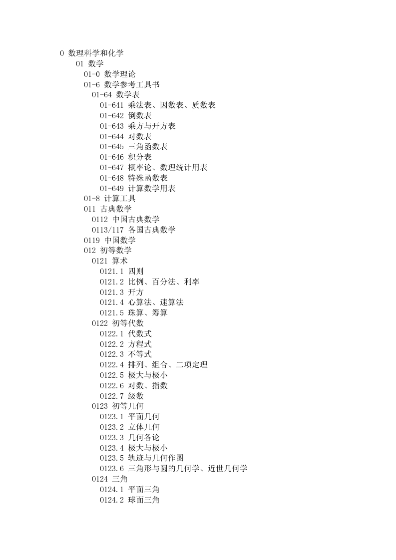 0数理科学和化学01数学01-0数学理论01-6数学参考工具书01-64数学表01-641乘法表、因数表、质数表01-642倒数表01-643乘方与开方表01-644对数表01-645三角函数表01-646积分表01-647概率论、数理统计用表01-648特殊函数表01-649计算数学用表01-8计算工具011古典数学0112中国古典数学0113/117各国古典数学0119中国数学012初等数学0121算术0121.1四则0121.2比例、百分法、利率0121.3开方0121.4心算法、速算法0121.5珠算、筹算0122初等代数0122.1代数式0122.2方程式0122.3不等式0122.4排列、组合、二项定理0122.5极大与极小0122.6对数、指数0122.7级数0123初等几何0123.1平面几何0123.2立体几何0123.3几何各论0123.4极大与极小0123.5轨迹与几何作图0123.6三角形与圆的几何学、近世几何学0124三角0124.1平面三角0124.2球面三角013高等数学014数理逻辑、数学基础0141数理逻辑(符号逻辑)0141.1命题演算、谓词演算、类演算0141.12谓词演算(命题函项演算)0141.13类演算0141.2证明论0141.3递归论(递归函数、能行性理论)0141.4模型理论0141.41非标准分析0142应用数理逻辑0143数学基础0144集合论0144.1基本概念0144.2悖论0144.3公理集合论0144.4类型论0144.5描述集合论(解析集合论)015代数、数论、组合理论0151代数方程论、线性代数0151.1代数方程论0151.2线性代数0151.21矩阵论0151.22行列式论0151.23多线性代数0151.24向量代数、因子代数、代数不变量论0151.25线性不等式0151.26线性代数的应用0152群论0152.1有限群论0152.2交换群论(阿贝尔群论)0152.3线性群论0152.4拓扑群论0152.5李群0152.6群表示论0152.7群的推广0152.8群论的应用0153抽象代数(近世代数)0153.1偏序集合与格论0153.2布尔代数0153.3环论0153.4域论0153.5泛代数0154范畴论、同调代数0154.1范畴论0154.2同调代数0154.3代数K-理论0155微分代数、差分代数0156数论0156.1初等数论0156.2代数数论0156.2+1代数数域、域扩张0156.2+2局部数域0156.2+3分圆域0156.2+4类域论0156.3几何数论0156.4解析数论0156.5二次型(二次齐式)0156.6超越数论0156.7丢番图分析(丢番图数论)0157组合数学(组合学)0157.1组合分析0157.2组合设计0157.3组合几何0157.4编码理论(代数码理论)0157.5图论0157.6图论的应用0158离散数学0159模糊数学017数学分析0171分析基础0172微积分0172.1微分学0172.2积分学0173无穷级数论(级数论)0173.1发散级数、可求和性、收敛因子0173.2连分式论0174函数论0174.1实分析、实变函数0174.11描述理论0174.12测度论0174.13凸函数、凸集理论0174.14多项式理论0174.2傅里叶分析(经典调和分析)0174.21正交级数(傅里叶级数)0174.22傅里叶积分(傅里叶变换)0174.23殆周期函数0174.3调和函数与位势论