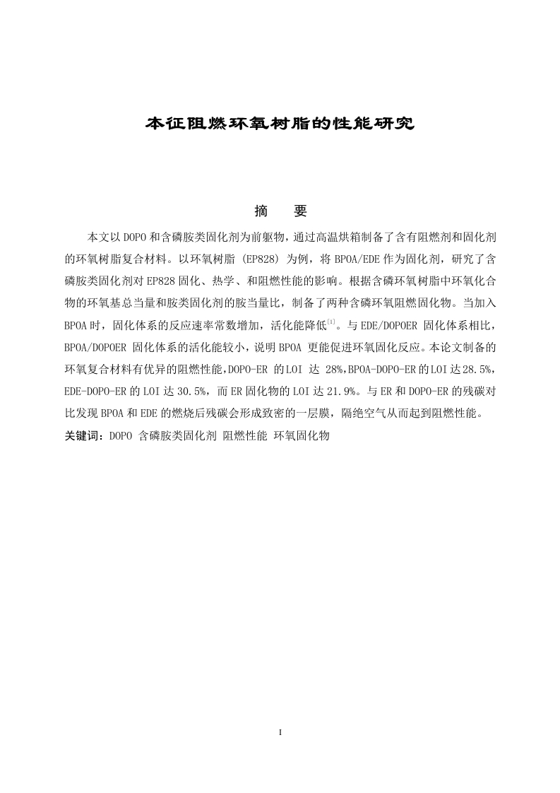 本征阻燃环氧树脂的性能研究摘要本文以D0P0和含磷胺类固化剂为前躯物,通过高温烘箱制备了含有阻燃剂和固化剂的环氧树脂复合材料。以环氧树脂(EP828)为例,将BPOA/EDE作为固化剂,研究了含磷胺类固化剂对EP828固化、热学、和阻燃性能的影响。根据含磷环氧树脂中环氧化合物的环氧基总当量和胺类固化剂的胺当量比,制备了两种含磷环氧阻燃固化物。当加入BPOA时,固化体系的反应速率常数增加,活化能降低。与EDE/DOPOER固化体系相比,BPOA/DOPOER固化体系的活化能较小,说明BPOA更能促进环氧固化反应。本论文制备的环氧复合材料有优异的阻燃性能,D0P0-ER的L0I达28%,BP0A-D0P0-ER的L0I达28.5%,EDE-DOP0-ER的L0I达30.5%,而ER固化物的L0I达21.9%。与ER和D0P0-ER的残碳对比发现BPOA和EDE的燃烧后残碳会形成致密的一层膜,隔绝空气从而起到阻燃性能。关键词:DOP0含磷胺类固化剂阻燃性能环氧固化物AbstractIn this paper,epoxy resin composites containing flame retardants and curing agents wereprepared by high-temperature constant-temperature oven reaction using DOPO andamine-containing curing agents as precursors.Taking epoxy resin (EP828)as an example,using BPOA/ethyl-ethylenediamine as a curing agent,the effect of a phosphorus-containingamine curing agent on the curing,thermal and flame retardancy properties of EP828 wasstudied.Based on the analysis of the thermal degradation behavior.Characterization of relatedproducts was performed using infrared analytical method.,confirmed the structure.Twophosphorus-containing epoxy flame-retardant epoxy cured products were prepared accordingto the epoxy equivalent weight of the total equivalent epoxy resin EP828 in epoxy resin(DOPOER).When BPOA is added,the reaction rate constant of the curing system increases andthe activation energy decreases.Compared with the EDE/DOPOER curing system,theactivation energy of the BPOA/DOPOER curing system is smaller,indicating that BPOA cansignificantly promote the epoxy curing reaction.The epoxy resin composites prepared in thispaper have excellent flame-retardant properties,the LOI of DOPO-ER is 28%,the LOI ofBPOA-DOPO-ER is 28.5%,and that of EDE-DOPO-ER.LOI reached 30.5%,while LOI ofER cured products was 21.9%.Compared with ER and DOPO-ER,the amine groups of BPOAand EDE have been found to help improve the flame-retardant properties of epoxy curedproducts.In the process of burning,air-shielded air is produced to provide flame-retardantproperties.Keywords DOPO Phosphorus-containing amine curing agent flame retardantperformance cured epoxy resin