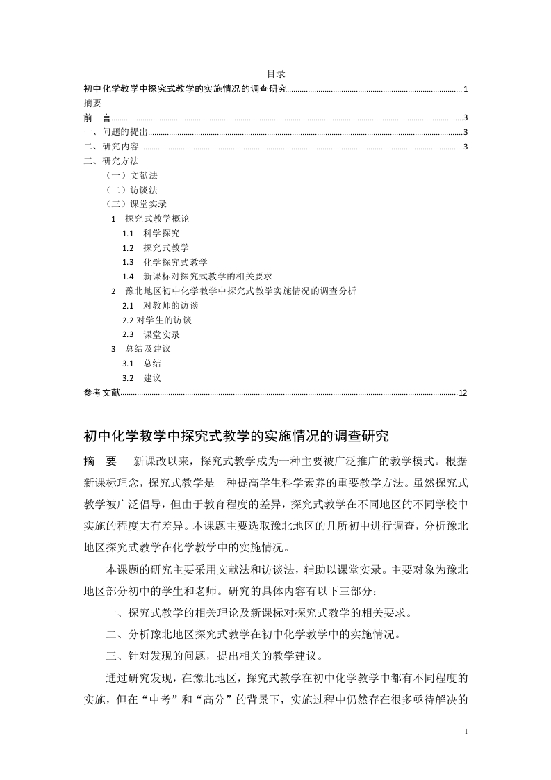 目录初中化学教学中探究式教学的实施情况的调查研究摘要3一、问题的提出二、研究内容3三、研究方法(一)文献法(二)访谈法(三)课堂实录1探究式教学概论1.1科学探究1.2探究式教学1.3化学探究式教学1.4新课标对探究式教学的相关要求2豫北地区初中化学教学中探究式教学实施情况的调查分析2.1对教师的访谈2.2对学生的访谈2.3课堂实录3总结及建议3.1总结3.2建议参考文献…….12初中化学教学中探究式教学的实施情况的调查研究摘要新课改以来,探究式教学成为一种主要被广泛推广的教学模式。根据新课标理念,探究式教学是一种提高学生科学素养的重要教学方法。虽然探究式教学被广泛倡导,但由于教育程度的差异,探究式教学在不同地区的不同学校中实施的程度大有差异。本课题主要选取豫北地区的几所初中进行调查,分析豫北地区探究式教学在化学教学中的实施情况。本课题的研究主要采用文献法和访谈法,辅助以课堂实录。主要对象为豫北地区部分初中的学生和老师。研究的具体内容有以下三部分:一、探究式教学的相关理论及新课标对探究式教学的相关要求。二、分析豫北地区探究式教学在初中化学教学中的实施情况。三、针对发现的问题,提出相关的教学建议。通过研究发现,在豫北地区,探究式教学在初中化学教学中都有不同程度的实施,但在“中考”和“高分”的背景下,实施过程中仍然存在很多亟待解决的1问题和困难。针对这些困难及存在的问题,对学校、教师及学生提出相关的建议。关键词探究式教学;访谈调查:实施情况:建议The Research on Exploratory Teaching Carrying outCircumstance of Junior ChemistryAbstract Since the new curriculum reform,exploratory teaching becomes a kind ofmainly promoted teaching model.According to the idea of the chemistry standard ofcompulsory education,one of the most important teaching methords is exploratoryteaching which can promote students'scientific literacy.Although the exploratoryteaching is widely advocated,there is a big difference from the degree ofimplementation of it indifferent schools in different aeras ,which is because of thedifferences in educational level.In this research,I selected several junior high schoolsin northern Henan to investigate,then according to the results of investigation,analyzed the implementation of exploratory teaching in chemistry teaching innorthern Henan.The research of this subject mainly adopts the methods of searching literatureand interviewing,besides,I had participated in classroom teaching to help toinvestigate.The main people to be interviewed are teachers and students of severalschools in northern Henan.The study has the following three parts:1.Theory about exploratory teaching and related requirements about exploratoryof the chemistry standard of compulsory education.2.Analyze the implementation of exploratory teaching in chemistry teaching innorthern Henan.3.Make some suggestions for carrying out the exploratory teaching according tothese discovered problems.Though the research,exploratory teaching in chemistry teaching has been carried indifferent levels among schools in northern Henan,however,in the background of thepromotion exam,there are still many problems which are waiting to be solved.At last,Iwill give some advice to schools,teachers and students according to these problems.Keywords exploratory teaching:interview;implementation:suggestion前言一、问题的提出新课标指出,义务教育阶段的化学教育,以提学生的科学素养为主旨,通过引导学生体验科学探究的过程,培养学生的实践能力:引导学生认识化学、技术、社会和环境的联系,理解科学的本质。探究式教学作为一种新的教学模式,为新课标的施行提供了更好的实践方式。在探究式教学过程中,学生模拟科学家进行探究,通过给出的问题情境,自己进行猜想假设,进而制订一系列的实验方案,通过实施自己的实验方案验证猜想并得出结论。学生通过体会科学探究的过程,学会科学地处理问题,在形成、联系与应用知识的过程中培养科学态度。因此,在化学教学过程中,探究式教学的实施能更好地提升学生的科学素养。新课改以来,我省也大力开展探究式教学的实施工作,但在“中考”的大背景下,面对升学和“高分”,探究式教学是否能真正被广泛运用在课堂中?学生能否适应探究式教学的模式?老师能否按照课标要求施行探究式教学?这些问题仍然有待考究。因此我通过对豫北地区几所学校的老师和学生进行访谈,并在其中一所学校进行课堂跟踪实录,从而调查探究式教学在化学教学中的实施情况。通过对调查结果的分析,找出其中存在的问题,并提出相关的建议。二、研究内容以前人的研究为基础,对于本课题的研究,具体的内容分为以下三方面:(一)探讨与探究式教学相关的一些理论,并分析《义务教育化学课程标准》对探究式教学的相关要求。(二)分析豫北地区几所学校化学教学中实施探究式教学的情况。(三)通过对访谈及课堂实录结果的分析,发现探究式教学实施过程中出现的问题,并针对发现的问题问题,提出相关的建议。三、研究方法根据此次调查研究的内容,采取以下研究方法:(一)文献法本课题参考的文献包括教育部制定的《义务教育化学课程标准》、有关探究
