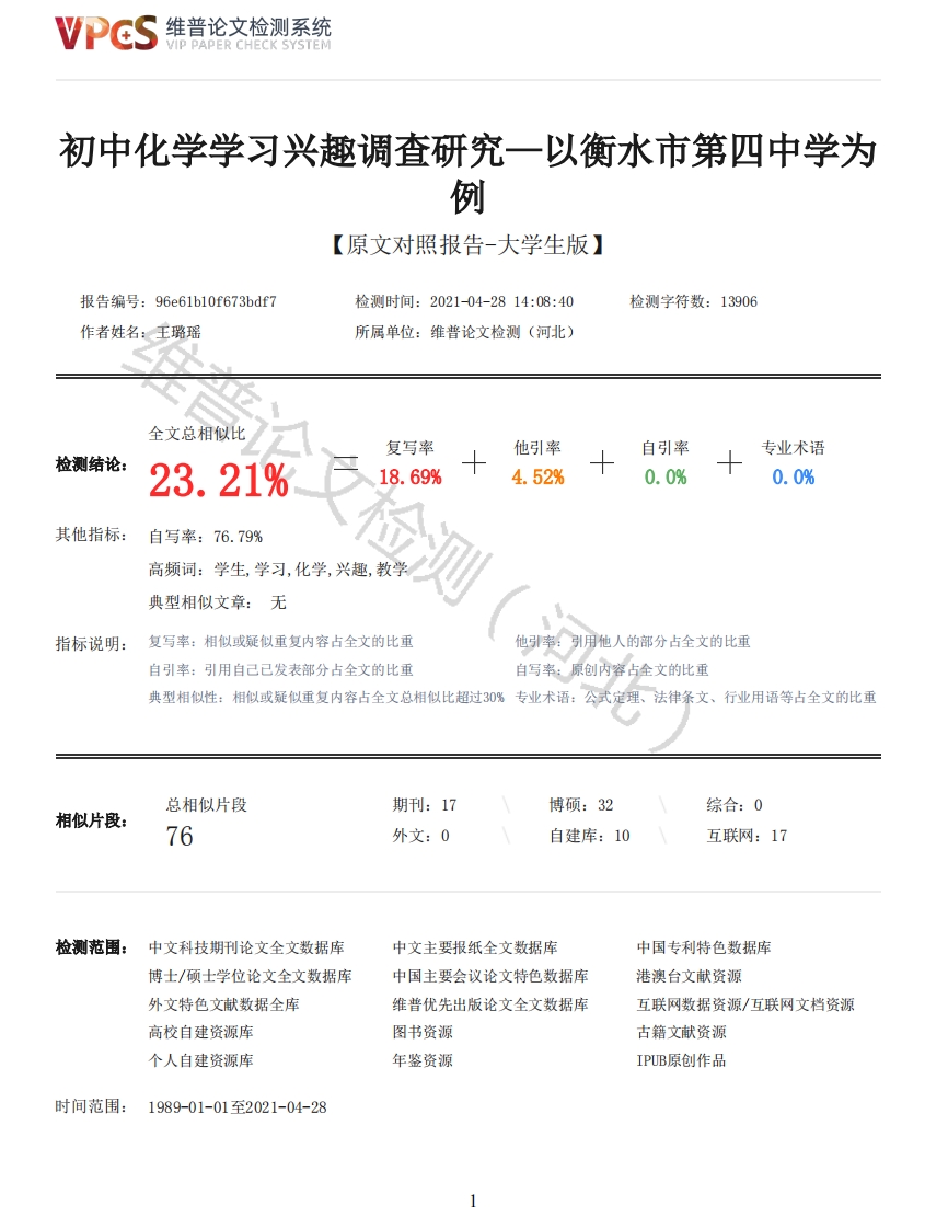 维普论文检测系统VIP PAPER CHECK SYSTEM初中化学学习兴趣调查研究一以衡水市第四中学为例【原文对照报告-大学生版】报告编号:96e61b10f673bdf7检测时间:2021-04-2814:08:40检测字符数:13906作者姓名:王璐瑶所属单位:维普论文检测(河北)全文总相似比复写率他引率自引率专业术语检测结论:23.21%18.69%4.52%0.0%0.0%其他指标:自写率:76.79%高频词:学生,学习,化学,兴趣,教学典型相似文章:无指标说明:复写率:相似或疑似重复内容占全文的比重他引率:引用他人的部分占全文的比重自引率:引用自己已发表部分占全文的比重自写率:原创内容占全文的比重典型相似性:相似或疑似重复内容占全文总相似比超过30%专业术语:公式定理、法律条文、行业用语等占全文的比重总相似片段期刊:17博硕:32综合:0相似片段:76外文:0自建库:10互联网:17检测范围:中文科技期刊论文全文数据库中文主要报纸全文数据库中国专利特色数据库博士/硕士学位论文全文数据库中国主要会议论文特色数据库港澳台文献资源外文特色文献数据全库维普优先出版论文全文数据库互联网数据资源/互联网文档资源高校自建资源库图书资源古籍文献资源个人自建资源库年鉴资源IPUB原创作品时间范围:1989-01-01至2021-04-28维普论文检测系统VIP PAPER CHECK SYSTEM原文对照颜色标注说明:■自写片段■复写片段(相似或疑似重复)口引用片段(引用)■专业术语(公式定理、法律条文、行业用语等)1923学士学位论文初中化学学习兴趣调查研究一以衡水市第四中学为例姓名王璐瑶学号201740607127河北)院系应用化学系专业化学指导教师曹利慧二零二零年五月十八日学位论文原创性声明本人所提交的学位论文《初中化学学习兴趣调查研究一以衡水市第四中学为例》,是在导师的指导下,独立进行研究工作所取得的原创性成果。除文中已经注明引用的内容外,本论文不包含任何其他个人或集体已经发表或撰写过的研究成果。对本文的研究做出重要贡献的个人和集体,均已在文中标明。本声明的法律后果由本人承担。论文作者(签名):指导教师确认(签名):年月日年月日学位论文版权使用授权书本学位论文作者完全了解衡水学院有权保留并向国家有关部门或机构送交学位论文的复印件和磁盘,允许论文被查阅和借阅。本人授权河北师范大学可以将学位论文的全部或部分内容编入有关数据库进行检索,可以采用影印、缩印或其它复制手段保存、汇编学位论文。保密的学位论文在年解密后适用本授权书。论文作者(签名):指导教师(签名):年月日年月日2维普论文检测系统VIP PAPER CHECK SYSTEM摘要兴趣是学生热爱学习的重要因素。初中生对于化学处于新接触状态,如何激发他们的学习兴趣,使他们积极主动的投入到化学的学习中是一件值得思考的问题。没有学习的兴趣就不能很好的让学生高效的完成学习任务,在中学化学的教学中,化学兴趣的提高是教学中主要的任务之一,教师可以通过多种方法来提高学生的学习兴趣。笔者通过发布调查问卷、进行访谈的形式分析以下问题:(1)对于化学兴趣初中生的理解是什么?(2)化学兴趣的影响因素有哪些?(3)提高初中生化学兴趣的策略有哪些?调查结果显示在学生学习的过程中,学习兴趣是逐步下降的,影响他们的因素有很多,比如学生本身的学科基础薄弱、对学习的态度,教师的教学方法、讲课方式和教学理念、个人魅力、化学课本的难度系数、学习环境等。经过笔者对化学兴趣的研究、对调查数据的分析,发现以下提高化学兴趣的策略,并效果显著。教师方面:增添教学的语言色彩,或通过联系生活实际的现象让学生对所学知识产生求知欲,进而提高课堂的效率,让学生更加主动的去学习化学,采用多媒体教学,通过播放一些相关的小视频,快速的提高学生的注意力。学生方面:对学习化学这一门课程有信心,有自己的学习目标,与成绩优异的学生进行交流,吸取他人经验。本论文一共分为五个部分,第一章论述学习兴趣的研究背景,包括研究目标和意义、方法。第二章是相关概述,包括化学兴趣的研究和理论。第三章是论文最重要的一部分包括对调查数据的分析和总结。第四章是根据前面的数据分析总结影响化学兴趣的因素。第五章则是探究如何克服因素提高学习兴趣的策略。关键词:初中化学:学习兴趣:兴趣提高的方法ABSTRACTInterest is an important factor in students'love for learning.Junior high school students arein a new contact state of chemistry,how to stimulate their interest in learning,so that theyactively invest in the study of chemistry is a worthy of thinking.Without interest in learning,students can not finish their learning tasks efficiently.In the teaching of chemistry in middleschool,the improvement of chemical interest is one of the main tasks in teaching.Teachers shouldpay more attention to motivating students and guiding their interest in chemistry learning,and helpthem to build up their confidence in chemical learning.Under the guidance of interest andmotivation,the author conducts the investigation and analysis of the following problems through theform of questionnaire and interviewWhat are the chemical interests of junior high school students?What are the factors that affect chemical interest?What are the strategies to improve the chemicalinterest of junior high school students?The results show that in the process of learning,theinterest in learning is gradually decreasing,and there are many factors affecting them,such as theweak discipline found