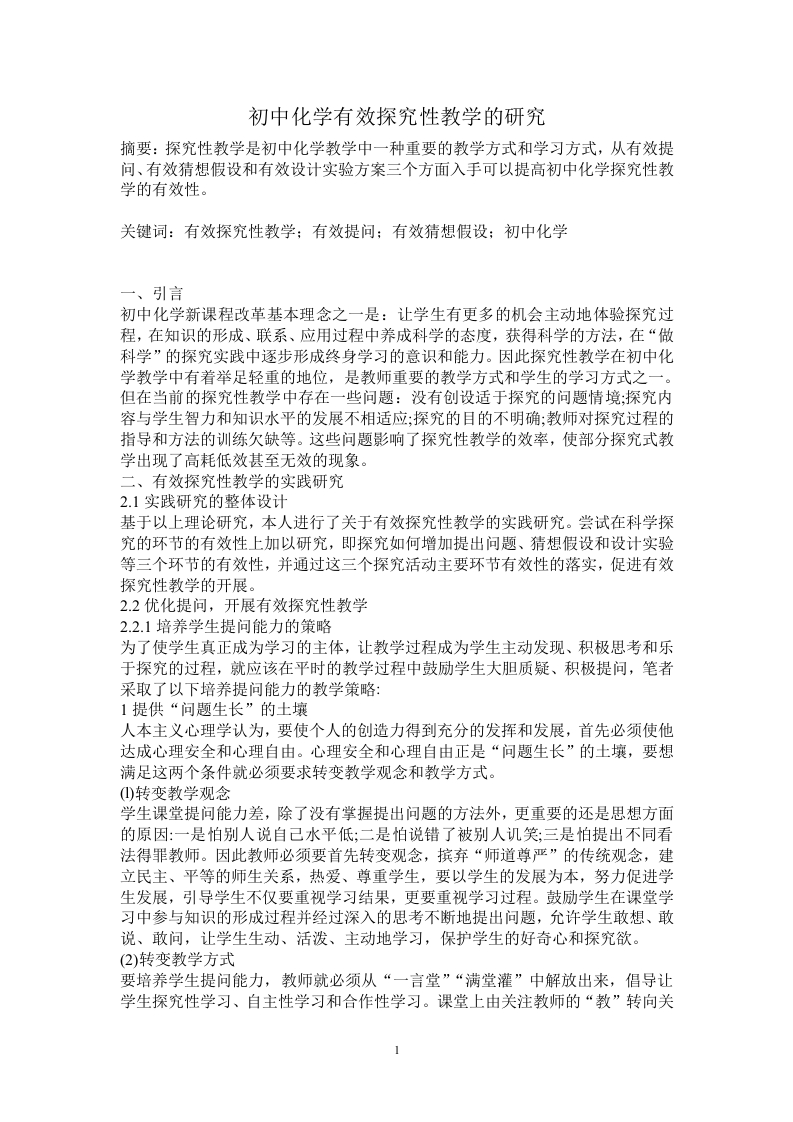 初中化学有效探究性教学的研究摘要:探究性教学是初中化学教学中一种重要的教学方式和学习方式,从有效提问、有效猜想假设和有效设计实验方案三个方面入手可以提高初中化学探究性教学的有效性。关键词:有效探究性教学:有效提问:有效猜想假设:初中化学一、引言初中化学新课程改革基本理念之一是:让学生有更多的机会主动地体验探究过程,在知识的形成、联系、应用过程中养成科学的态度,获得科学的方法,在“做科学”的探究实践中逐步形成终身学习的意识和能力。因此探究性教学在初中化学教学中有着举足轻重的地位,是教师重要的教学方式和学生的学习方式之一。但在当前的探究性教学中存在一些问题:没有创设适于探究的问题情境:探究内容与学生智力和知识水平的发展不相适应:探究的目的不明确:教师对探究过程的指导和方法的训练欠缺等。这些问题影响了探究性教学的效率,使部分探究式教学出现了高耗低效甚至无效的现象。二、有效探究性教学的实践研究2.1实践研究的整体设计基于以上理论研究,本人进行了关于有效探究性教学的实践研究。尝试在科学探究的环节的有效性上加以研究,即探究如何增加提出问题、猜想假设和设计实验等三个环节的有效性,并通过这三个探究活动主要环节有效性的落实,促进有效探究性教学的开展。2.2优化提问,开展有效探究性教学2.2.1培养学生提问能力的策略为了使学生真正成为学习的主体,让教学过程成为学生主动发现、积极思考和乐于探究的过程,就应该在平时的教学过程中鼓励学生大胆质疑、积极提问,笔者采取了以下培养提问能力的教学策略:1提供“问题生长”的土壤人本主义心理学认为,要使个人的创造力得到充分的发挥和发展,首先必须使他达成心理安全和心理自由。心理安全和心理自由正是“问题生长”的土壤,要想满足这两个条件就必须要求转变教学观念和教学方式。①)转变教学观念学生课堂提问能力差,除了没有掌握提出问题的方法外,更重要的还是思想方面的原因:一是怕别人说自己水平低;二是怕说错了被别人讥笑:三是怕提出不同看法得罪教师。因此教师必须要首先转变观念,摈弃“师道尊严”的传统观念,建立民主、平等的师生关系,热爱、尊重学生,要以学生的发展为本,努力促进学生发展,引导学生不仅要重视学习结果,更要重视学习过程。鼓励学生在课堂学习中参与知识的形成过程并经过深入的思考不断地提出问题,允许学生敢想、敢说、敢问,让学生生动、活泼、主动地学习,保护学生的好奇心和探究欲。(2)转变教学方式要培养学生提问能力,教师就必须从“一言堂”“满堂灌”中解放出来,倡导让学生探究性学习、自主性学习和合作性学习。课堂上由关注教师的“教”转向关注学生的“学”,加强师生间和学生间的互动性,引导学生积极讨论,大胆探索,在相互交流、合作中相互启迪,促进问题的提出,并在课堂教学中将学生“答问”的时间,分配一些给学生“提问”,以创造学生提问的机会和条件,每节课在结束前留给学生一定的提问时间。2训练“问题形成”的方法很多学生没有提出问题并不表示没有问题,而是没有受过产生问题的思维方法和提问技能的训练,这就要求教师去启发诱导,做好提问示范,逐步训练培养和发展学生的提问能力,在教学中笔者进行了以下的一些启发和引导。2.2.2有效探究中培养学生提出有效问题的策略1.创设使学生发现和提出有效问题的情景。创设情景目的是促使学生在已有知识与未知知识之间产生激烈冲突,使学生意识中的矛盾激化,从而激发学生发现问题、探究问题的欲望,产生问题意识,提出有价值的问题。2.营造和谐气氛,鼓励学生大胆质疑,提出有效问题。在创设问题情景的基础上,鼓励学生大胆想象、质疑、勇于求异、主动发现和提出有探究价值的问题。对敢于质疑的学生给予及时肯定和表扬,努力建立一种平等、信任、理解的新型师生关系,营造一种民主、和谐、宽松、自由的课堂教学气氛,让学生消除思想障碍,敢于质疑。让问题成为学生感知和思维的对象,使学生在问题中求知,在问题中发展,不断提高发现和提出有价值问题的能力。3.留给学生独立思考、独立发现和提出有效问题的时间和空间。引导学生在阅读中、实验探究过程中发现和提出问题,并给学生的思维过程发展尽可能的提供时间,避免担心教学进度而出现的“师演生看”、“师讲生听”的现象发生。4.引导学生对所发现的问题以口头或书面的形式加以表述。学生提出有效问题的能力是逐步发展的,学生发现问题后,教师应引导学生把所发现的问题表述出来,正确的给予充分肯定和鼓励,不恰当的要及时纠正。学生经过多次的经验积累,随着他们化学知识技能的提高,就可以逐步发展他们发现和提出有价值问题的能力。2.3培养猜想假设能力,开展有效探究性教学1改变教法,创设猜想与假设的空间。在教学活动中,教师应发扬教学民主,成为学生学习活动的组织者、引导者、合作者,要虚心听取学生的各种建议,关心每一个学生的成长,让学生感到无拘无束,无紧张之感。给予学生充分的思考和表述的时间,让学生做到畅所欲言,大胆的进行猜想与假设,合理的进行鼓励。教师要善于抓住其创意加以表扬,培养其猜想的积极性和自信心:偏向的进行引导,要有意识地保护学