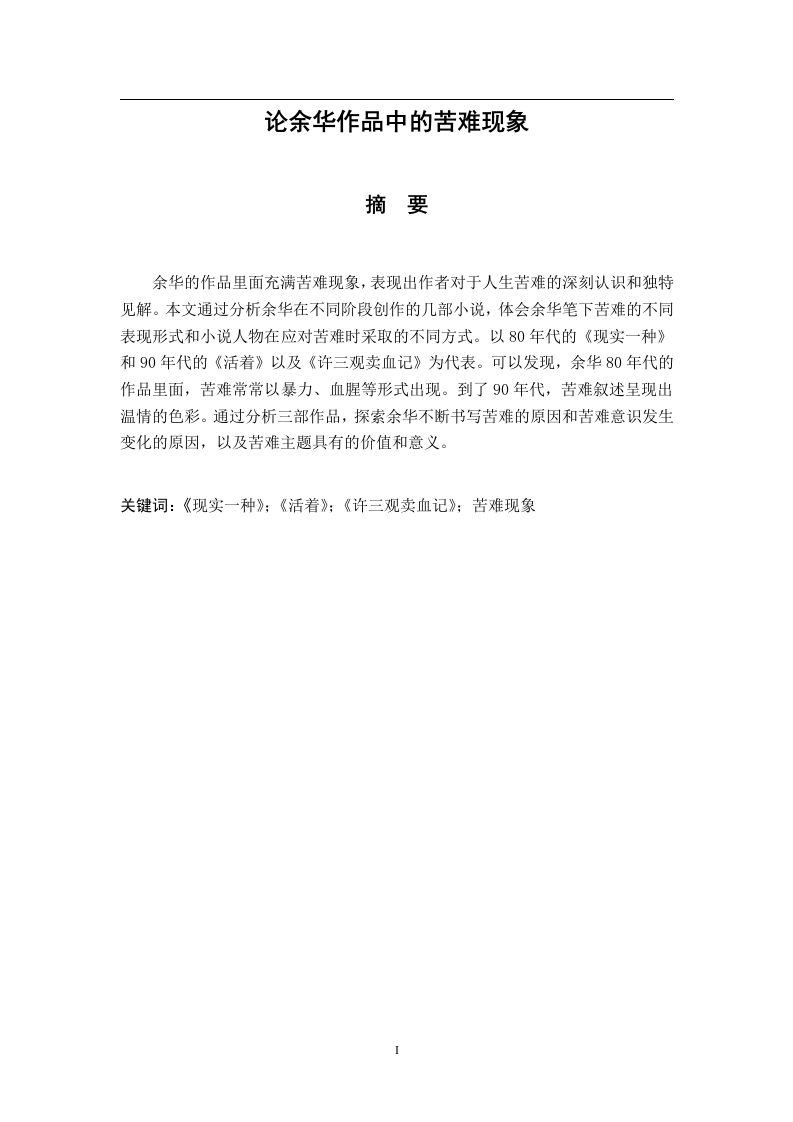 论余华作品中的苦难现象摘要余华的作品里面充满苦难现象,表现出作者对于人生苦难的深刻认识和独特见解。本文通过分析余华在不同阶段创作的几部小说,体会余华笔下苦难的不同表现形式和小说人物在应对苦难时采取的不同方式。以80年代的《现实一种》和90年代的《活着》以及《许三观卖血记》为代表。可以发现,余华80年代的作品里面,苦难常常以暴力、血腥等形式出现。到了90年代,苦难叙述呈现出温情的色彩。通过分析三部作品,探索余华不断书写苦难的原因和苦难意识发生变化的原因,以及苦难主题具有的价值和意义。关键词:《现实一种》:《活着》:《许三观卖血记》:苦难现象Suffering in Yu Hua's NovelsAbstractYu Hua's novels are full of misery.The author deeply understands the hardshipsof our life.In this paper,through the analysis of the different stages of Yu Hua's novels,wecan understand different forms of suffering and different ways to deal with misery inYu Hua's novels.I will take a novel as an example in 80s,andas examples in 90s.The works of the 80s are oftenviolent and bloody.In 90s,the narrative of suffering presents warmth.From theseworks,we can explore the causes of the change of Yu Hua's suffering consciousnessand experience the author's deep thoughts on suffering.Key Words:Suffering目录摘要-IAbstract-目录一、《现实一种》(二)苦难的表现ソ(三)苦难暴力化的原因-2(四)《现实一种》的意义3二、《活着》(一)苦难的表现(二)苦难温情性的原因-6(三)《活着》的意义6三、《许三观卖血记》7-7(二)苦难悲悯性的原因-8(三)《许三观卖血记》的意义9参考文献-11