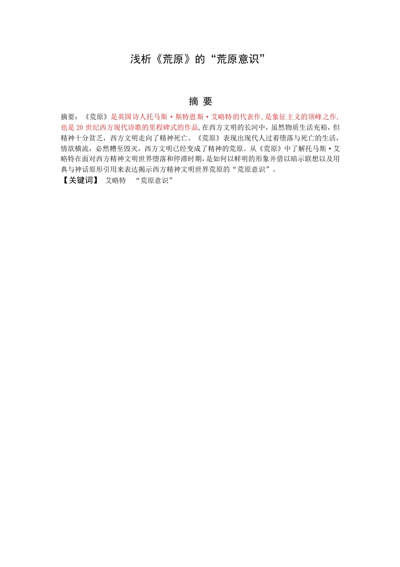 浅析《荒原》的“荒原意识”摘要摘要:《荒原》是英国诗人托马斯·斯特恩斯·艾略特的代表作,是象征主义的顶峰之作,也是20世纪西方现代诗歌的里程碑式的作品,在西方文明的长河中,虽然物质生活充裕,但精神十分贫乏,西方文明走向了精神死亡。《荒原》表现出现代人过着堕落与死亡的生活,情欲横流,必然糟至毁灭,西方文明已经变成了精神的荒原。从《荒原》中了解托马斯·艾略特在面对西方精神文明世界堕落和停滞时期,是如何以鲜明的形象并借以暗示联想以及用典与神话原形引用来表达揭示西方精神文明世界荒原的“荒原意识”。【关键词】艾略特“荒原意识”绪论T·S·艾略特(T·S·Eliot,1888-1965)是英国非常著名现代派诗人和文学评论家,1948年凭借诗歌创作而荣获诺贝尔文学奖。一直以来,《荒原》被大家视为20世纪西方现代诗歌文学的里程碑式的作品。全诗一共434行,由五个部分构成:第一部分为“死者的葬礼”;第二部分为“弈棋”:第三部分为“火诫”:第四部分为“水里的死亡”:第五部分为“雷霆的话”共使用了七种文字和大量的典故,它的包容性不可谓不广。诗人笔下的“荒原”满目荒凉:土地龟裂,石头发红,树木枯死;荒原人们精神恍恍惚惚,死气沉沉,显示了现代世界中的精神文明危机,现代人类精神文化的灭亡及拯救。《荒原》在文学艺术上的成就超过了现代派的其他诗作,是一首非常具有借鉴价值,值得认真探究的作品。本文将从诗歌“荒原意识”在文中的展现、“荒原意识”形成的原因及影响、“荒原意识”为后世的影响,三个方面入手,分析诗歌《荒原》复杂晦涩的主题内函及其意义,以展示诗歌的复杂性,和“荒原意识”的重要意义。一、《荒原》创作的时代背景(一)英国所处的时代背景托马斯·艾略特1914年到伦敦,在英国生活了很长时间。他于1927年成为英国公民。因此,在文学史上对他是英国人还是美国人有不同的看法。托马斯·艾略特定居伦敦后,结识了美国意象派诗人庞德,并从事诗歌创作,庞德帮了艾略特很多忙。《荒原》恰逢诗人托马斯艾略特所处的时代,表现了诗人在精神文明世界中的失败。春去秋来,日复一日,周而复始,大自然的循环在“荒原”中杂乱无章。时间的倒转对自然系统造成了严重的创伤和破坏,很难延续拯救与重生的神话。为什么诗人如此失望?为什么春天的四月在诗人的作品中成为“最残酷的月份”?第一次世界大战后,无数的生命变得不完整,无数的家庭变得支离破碎,战争不仅使人们缺乏物质,而且使人们的良知和精神上的噩梦枯萎。20世纪初的欧洲,人们的情感枯萎,精神空虚,前途渺茫,宗教信仰缺失。世界变成了物质和精神的无边广阔的“荒原”。所以在荒芜的土地上,诗人不仅向人们展示了失落的精神,而且也展示了崩溃的精神。诗人把这种绝望和悲伤的心情融入荒原季节的逆转之中,使滋养灵魂的源泉不可能出现。但同时,诗人希望战后的人类能在死后重生。故而也曾叩问世界,叩问自己:“去年你种在花园里的尸体/抽芽了吗?今年它会开花吗?”[1](二)艾略特创作《荒原》的个人原因托马斯·艾略特1888年9月出生于密苏里州圣路易斯的一个清教徒家庭。他的祖父创立了华盛顿大学的前身。他父亲是个成功的商人。他母亲出身名门,喜欢文学。他的家庭有很高的文化修养。1906年,他进入哈佛大学,专攻哲学、英语和法国文学,并接受新人文主义者欧文·巴比特的教育。1909年大学毕业后,他继续在研究生院学习哲学。他于1910年获得哈佛大学的硕士学位,后来他在牛津大学学习,并在法国和德国学习。艾略特成年后的经历和信仰实际上是对带有浓厚美国特色的家庭宗教的背叛。他对现实很敏感,特别是对文化和世界精神状态很敏感。他不希望看到第一次世界大战前后欧洲的文明危机,但是不仅反映在现实生活中,也反映在人类的灵魂中。915年,他出版了《阿尔弗雷德·普鲁弗洛克的情歌》,这是一首描述当时危机感的长诗。它以一位中年资产阶级男子求爱途中的复杂心理思想来表达当代西方人对现代文明生活的幻灭和困惑,但是他早年的生活的足迹却在他后来的作品中留下了深深浅浅的痕迹。他在《四首四重奏》之三把密西西比河比喻为“强壮棕色芙的神”[2],它“神情阴郁”而又“桀骛不驯”。《荒原》里有这样的诗行:“哦哦哦哦这莎士比亚的拉格一一多么文雅/多么聪明。”[3)二、对“荒原意识”文本内容的分析(一)《荒原》的诗歌主体内容1.死者的葬礼第一部分“死者的葬仪”可分成5小节。(1)第一节:败落的贵族玛丽对昔日浪漫史的回忆:四月是残酷的月份,不毛之地长毛之地长出香花来”暗示了上流社会生活中的空虚寂寞和西方文明的衰落。(2)第二节:借《圣经》中的典故来描写荒原景象:什么么树枝牢牢抓着大,什么什么从这这片乱石的垃圾中出的人子呵,枯树树没有阴凉,蟋蟀叫声也不让声也不讠干石间石间没有流水的。只是在这这块红岩下有影子-..我要让要让您在一把尘看到恐惧。(3)第三节:描写了纯洁爱情的诗。写了一次失败的爱情故事我不死,也不活,什么都不知道,空虚而荒凉是那大海。(4)第四节:写柯斯脱里斯夫的疑惑。她是能用纸牌算命的预言家,著名的千里眼,但她占卜的结果是:找不到那被绞不到那被害怕水里的死亡,这年头人必须得小心啊(5)第五节:写“并无的实际