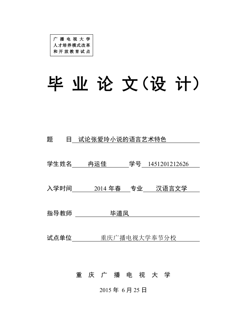 广播电视大学人才培养模式改革和开放教育试点毕业论文(设计)题目试论张爱玲小说的语言艺术特色学生姓名冉运佳学号1451201212626入学时间2014年春专业汉语言文学指导教师毕道凤试点单位重庆广播电视大学奉节分校重庆广播电视大学2015年6月25日材料目录1.指导任务书.…(1)2.指导记录表.(2)3.写作提纲4.论文(设计)提要…5.论文(设计)正文…6.参考文献…7.指导教师情况及评语9.审查意见.毕业论文(设计)指导任务书毕业论文(设计)题目试论张爱玲小说的语言艺术特色学生姓名冉运佳专业汉语言文学指导教师毕道凤职称高级教师毕业论文(设计)的内容及要求:(可附另页)1.学生应在深入实际的基础上,运用所学知识,一人一题,独立写出具有一定质量的毕业论文。毕业论文应观点明确、材料翔实、结构合理严谨、语言通畅。2.切实做好毕业论文的选题工作。所选题目不宜过大,也不宜过于简单。题目难易要适度,在短期内经过努力能完成。本科阶段所学课程内容的选题不得低于教学班总选题的30%,并应避免选题过度集中。3.毕业论文文体为学术论文。调查报告、工作总结或单纯的案例分析不能作为毕业论文。4.毕业论文的内容结构按照提出问题一一分析问题一一解决问题的思路来写。5.毕业论文要求卷面整洁、字迹工整,论文的结构、纸型、版式与用字等执行重庆电大论文格式要求,毕业论文要制成电子文档。6.毕业论文正文字数要求不少于6000字。7.毕业论文的写作格式要求详见“重庆广播电视大学毕业论文(毕业设计文本)格式规范”。主要包括:毕业论文要求用A4纸打印。页边距:上20mm、下20mm、左20mm、右20mm。论文标题采用3号宋体,加粗,顶部居中排列,上下各空一行:正文文字采用5号宋体,每段起首空两格,回行顶格,单倍或1.5倍行距。毕业论文(设计)进度计划:1、期限:自2015年2月20日起至2015年6月20日2、具体进度安排:时间完成内容3.20至4.10选题确定论文研究范围。4.11至5.20撰写论文初稿。521至6.20修改论文,形成定稿。至1