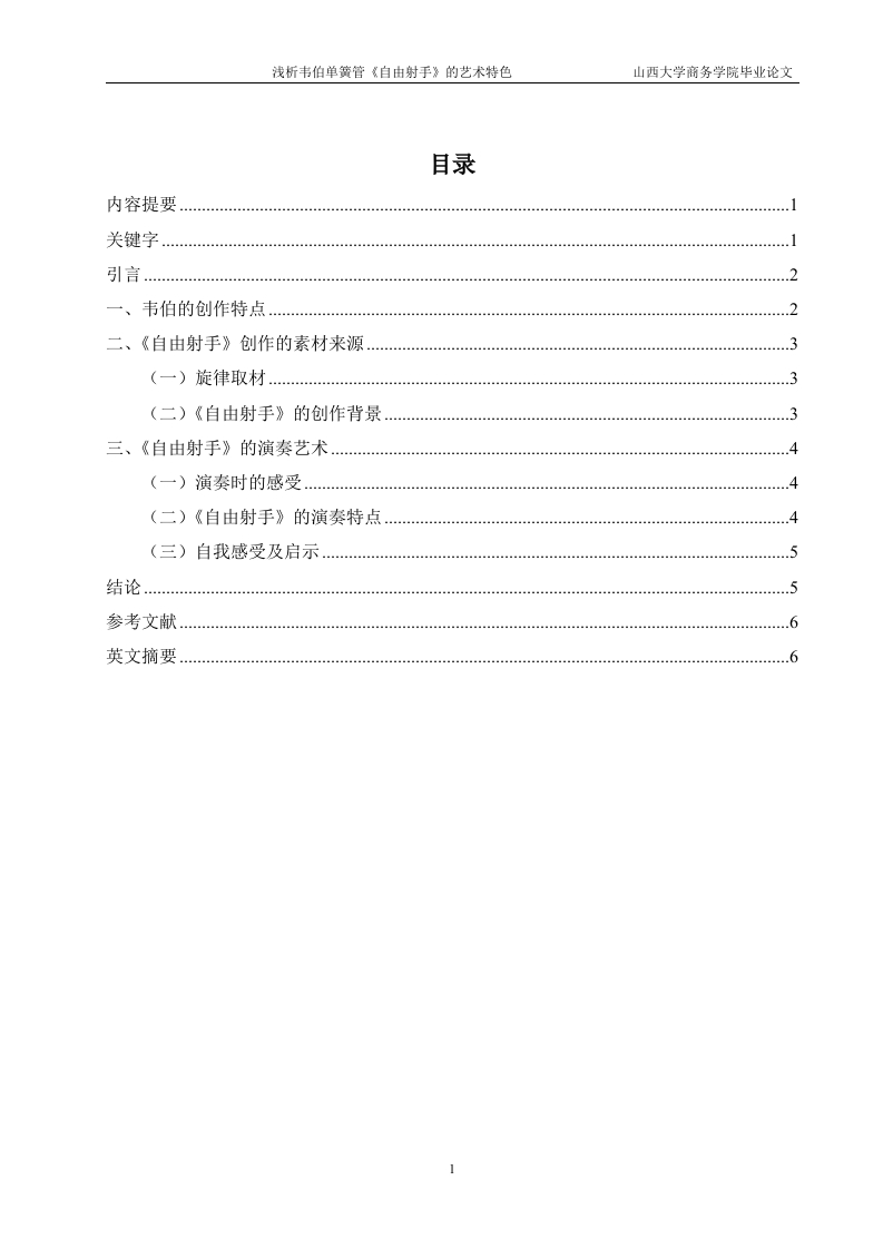 浅析韦伯单簧管《自由射手》的艺术特色山西大学商务学院毕业论文目录内容提要关键字.引言…2一、韦伯的创作特点…2二、《自由射手》创作的素材来源…3(一)旋律取材3(二)《自由射手》的创作背景3三、《自由射手》的演奏艺术…(一)演奏时的感受.…4(二)《自由射手》的演奏特点(三)自我感受及启示…5结论…5参考文献6浅析韦伯单簧管《自由射手》的艺术特色山西大学商务学院毕业论文浅析韦伯单簧管《自由射手》的艺术特色学生姓名:李正阳指导老师:【内容提要】伯被世人所熟知是由他的歌剧开始,不仅如此,韦伯的器乐作品的功力也丝毫不输于歌刷。器乐作品中,韦伯的单黄管作品无论是从质量上还是意义上都被业内人士奉为经典中的经典。韦伯的单黄管作品是上至著名的单簧管演奏家下至初学单簧管的学生所练习和演奏的对象。而《自由射手》在器乐坛的地位则更为经典和崇高。韦伯作为欧洲浪漫乐派歌剧创始人,德国民族歌刷的奠基者其最著名也是最重要的作品《自由射手》上演后便标志肴德国浪漫主义的诞生,同时将意大利歌刷在当时德国的垄断地位的局面打破,自此德国才能拥有富于本国民族性与戏剧性的作品。不仅如此,该作品的诞生快速推进了近代音乐文化的发展,使得音乐变得更加多元化。它不仅推动了浪漫主义精神,还推进了创作技法的成长。这对后世艺术的发展影响极深。可以说《自由射手》的出现是在瓦格纳之前,为开辟德国民族歌剧的道路奠定了基础。【关键字】单篑管曲式结枸《自由射手》气息1浅析韦伯单簧管《自由射手》的艺术特色山西大学商务学院毕业论文引言卡尔玛利亚冯韦伯(Carl Maria von Weber,1786.11.18-1826.6.5)是德国作曲家、钢琴家、指挥家、音乐评论家,也是德国浪漫主义歌剧的莫基人。韦伯出生于音乐世家,其父亲弗朗茨·安东·冯·韦伯(1734-1812)是一个音乐家,其母亲诺薇法•布伦纳是一个歌唱演员”。韦伯的一生中,大部分的时间里,一般是在12月18日这一天庆祝自己的生日,他是在1817年才得知自己的洗礼日为11月20日。晚年时的韦伯,把自己的生日当成11月19日,因为那天恰好与其妻子的生日以及他们的订婚纪念日重合。韦伯的早期生活深受父亲的影响,韦伯很小的时候,父亲就带着自己的旅行乐团离开了家乡欧丁。也就是从那个时候起,韦伯的父亲开始带着韦伯开启了巡演之路。在父亲的带领下,韦伯踏上了音乐之路。父亲对韦伯的的期望很高,希望他能够有莫扎特一样的成就,只可惜,愿望落空。一路上的迁移与颠簸使得韦伯无法接受系统的教育,每次跟随的老师时间都很短暂。后来有机会拜室内乐音乐家迈林根公爵弗里德里希的小乐队演奏家约翰彼得霍伊施克为师,霍伊施克非常欣赏韦伯的音乐天赋,于是开始针对韦伯进行有计划的培养,教他学习声学、钢琴以及对位法。韦伯对德国民间音乐和风俗是深有感触的。这些因素的存在对韦伯往后的创作奠定了基础。十岁学钢琴,而后学作曲,十二岁开始接触并创作歌剧音乐。1813年以后,他先后任布拉格剧院和德累斯顿交响乐团常任指挥,并对两个乐团的发展影响深远。其代表作为歌剧《自由射手》又称《魔弹射手》。该歌剧具有浓郁的德国风格和浪漫气总,被认为是德国第一部浪漫主义歌剧。除此以外,韦伯的歌剧作品还有《奥伯龙》,以及少序曲、协奏曲,奏鸣曲。其中,钢琴曲《邀舞》最受群众喜爱。一、韦伯的创作特点韦伯在创作中始终使用新的无调性作曲巧法,而且次技法深得群众喜爱,尽管如此,韦伯仍认为传统曲式是不可丢失的。于是后期便以曲式结构的创作为主。所以创作时将新的无调性音乐语言把传统曲式结构包裹起来。韦伯的作品中有些标注的体裁,如变奏曲(variation)、协奏曲(concerto)、交响曲(symphony),由此得知其中的曲式结构②。早期的曲式结构通常对主题之间的发展更为重视,尤其是对比,哪怕是海顿的单主题也会有调性间的对比。到了贝多芬变出现变化,开始革新。贝多芬将主题简化,有时只有三四个音(命运动机)。新维也纳乐派时期,韦伯曲式结构的旋律、主题及调性关系等方面都不再依附传统,主题也一一消减,乐曲是否结束是由乐思的发展决定,而主属关系也逐渐减弱。早期韦伯的作品中最先被人们知晓的是变奏曲式演奏法,如《管弦乐变奏曲》(Op.26)和《钢琴变奏曲》(Op.27),直白的曲目名称带给观众最直接的感受。韦伯的变奏曲式在这时再无传统意义上通过改变调性、节奏织体等方式来实现变奏手法,镜像结构或对称关系成为他变奏的重要手段。作品《交响曲》(Op.21)第二乐章采用传统变奏曲式中主题加变奏的手法,其中传统曲式的框架清晰,主题及每个徐乐娜.节伯单黄管协奏曲[】.音乐爱好者,2007(11):72-72⑦周莉.论歌剧《自由射手》体现的浪漫主义音乐特征[】.读写算:教师版,2016(10):5-6.2