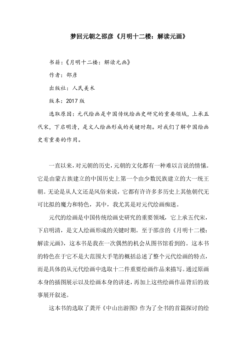 梦回元朝之邵彦《月明十二楼:解读元画》书籍:《月明十二楼:解读元画》作者:邵彦出版社:人民美术版本:2017版选取原因:元代绘画是中国传统绘画史研究的重要领域,上承五代宋,下启明清,是文人绘画形成的关键时期。对我们了解中国绘画史有重要的作用。一直以来,对元朝的历史,元朝的文化都有一种难以言说的情愫。它是由蒙古族建立的中国历史上第一个由少数民族建立的大一统王朝。无论是从人文还是风俗来说,它都有许许多多历史上其他朝代无可比拟的魔力和特色,其中,我尤其是对元代绘画痴迷。元代的绘画是中国传统绘画史研究的重要领域,它上承五代宋,下启明清,是文人绘画形成的关键时期。至于邵彦的《月明十二楼:解读元画》,这本书是我在一次偶然的机会从图书馆看到的。这本书的特色在于它不是大范围大手笔的概括总述了整个元代绘画的特点,而是具体的从元代绘画中选取十二件重要绘画作品来描写。通过原画本身的插图展示以及绘画本身的讲述,再加上这些绘画作品背后的故事展开叙述。这本书的选取了龚开《中山出游图》作为了全书的首篇探讨的绘画文本。在宋末元初的时候因为文人画家龚开对一些社会现象不满,把一些人视为妖魔鬼怪,创作了《中山出游图》。在作者的题跋中就曾这样说:“不应将墨鬼视为戏笔,它乃是画家之草圣,世上岂有不善真书而能作草书者。”由此看来,此图绝不是画家随意为之,而是他的精心之作。此画很明显的漫画特征给人一种宣泄之感。画者自题其画曰:“髯君家本住中山,驾言出游安所适?谓为小猎无鹰犬,以为意行有家室,阿际韶容见靓妆,五色胭脂最宜墨”诗与画充满荒诞、诙谐的味道,可见他对当时社会的厌恶已经深入骨髓,愤恨燃尽即是无奈,文人无奈的极致就是深刻的嘲讽,这也就更进一步证实画家是一个极富个性的人。另外作者的的现实生活也是如此,他在南宋灭亡之后,隐居不仕,生活十分窘迫,家中“坐无几席”,每次俯伏榻上都以他儿子的背为案作画。《中山出游图》正是这种情况下的产物。以首篇为例,我在读完这章的时候就已经能够深深的体会到了作为一名画家,画和内心的情感连接关系。正是因为眼之所见,才会有心之所感,接而才会有笔下所画。一个好的画家、好的艺术家,一定是能够感知生活,感知实践,在社会实践和情感经历上的升华之后方能在纸上呈现出来好的艺术作品。继而,我怀着期待和使命感,继续将书读了下去,后面还有高克恭《云横秀岭图》、赵孟頫《红衣罗汉图》、黄公望《富春山居图》、柯九思《晚香高节图》、《元世祖出猎图》、王渊《桃竹锦鸡图》、方从义《云山图》等余下十一幅作品。通过画面的直观呈现和对作者、作品的背后故事深入探究,每一幅作品的背后都有一个值得人深入探及的新世界,细细读来每一幅作品都会带给我不一样的沉思、不一样的震撼。原来一直以为能够有触动人心的只能是实实在在经历过的人和事,可是我未曾想过,这些未曾谋面的故事和画卷也会带给我如此长久不能忘怀的感动和震撼。综而观之,本书的作者邵彦在对作品和作者的选区上来看,我们可以发现这些作品都是元代一些大名鼎鼎的泰斗之作,他们的作品无论是在当时还是传至后代都有不可否认的影响力,而且能在很大程度上展现元代绘画的风貌和概况,能够带给读者最原汁原味的“元代”感。这些作品不仅有传统的文人画家,也不乏一些民间花匠和宫廷花匠,能够从多个方面展示元代的绘画的艺术。其次,从绘画内容来看,所涉及到的不仅有亭台楼阁,还有山水花鸟和世间百态诸生,其中最特别的是选取了永乐宫壁画。它充分揭示元代民间绘画所取得的成就,而这是为以往文人写就的画史所忽略的部分。这些多方面、全方位的绘画视觉展示能够丰富全面的展现元代绘画各个形态的特点。通过这本书的阅读,我不仅更深层次的领略了元代绘画艺术的魅力,也增长了其他文学历史方面的知识,更重要的是领略了大家的艺术情怀,在自己的思想深度认知上又有了新的突破。