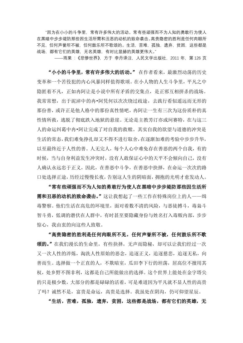 “因为在小小的斗争里,常有许多伟大的活动。常有些顽强而不为人知的勇敢行为使人在黑暗中步步堤防那些因生活所需和丑恶的动机的致命袭击。高贵隐密的胜利是任何肉眼所不见,任何声誉所不被,任何鼓乐所不歌颂的。生活,苦难,孤独,遗弃,贫困,这些都是战场,都有它们的英雄,无名英雄,有时比显赫的英雄更伟大。”一雨果:《悲惨世界》,方于李丹译注,人民文学出版社,2011年,第126页“小小的斗争里,常有许多伟大的活动。”在作者看来,最激烈动荡的历史变革和一个苦役犯的内心风暴同样值得歌颂。在小人物的人生斗争里,平凡之中隐匿着不凡,正如冉阿让是小说中所有矛盾的交集点,是正邪互相拼杀的战场。我常常想,出于泥淖中的冉·阿凭何以次次绕过歧途,去践行看似遥远而无形的那份善,或许正是他人格中的那份真性情吧,冉阿让一生有三次为这份质朴的真性情所救,逃脱了彻底跌入地狱的悬崖。无论是主教芳汀亦或珂赛特,在与这三人的命运纠葛中冉·阿让完成了对自我的救赎。其实自我的欲望与道德的冲突是生活的常态,我们难免挣扎却又不得不进行取舍,在逐渐加难的考验中步步升华,以至最终近于人性的善。人无完人,每个人心中难免存在善恶的两个自我,有的时候,当与自身利益发生冲突时,没有人敢保证心中的天平不会倾向自己,没有人确认永远忠于正义,因此,在善恶中斗争,在善恶中抉择,在命运一次次的路口处选择正途,历经过慢慢长夜,告别这人生的阴暗面,拥抱的光明才愈发动人。“常有些顽强而不为人知的勇敢行为使人在黑暗中步步堤防那些因生活所需和丑恶的动机的致命袭击。”这让我想起了一些工作在特殊岗位上的人一一缉毒警察。他们生活在高危的环境里,面对着数不清的风险,与恶徒搏斗,毒枭斗智斗勇,低调的潜伏在人群中,有时甚至要隐藏身份与姓名打入毒贩内部,步步惊心,我由衷的向这些人致敬。“高贵隐密的胜利是任何肉眼所不见,任何声誉所不被,任何鼓乐所不歌颂的。”在我们漫长的生命里,有些抉择,无声而隐秘,却可以让我们经过一次又一次人性的淬炼,淘洗人性原始的恶念,追逐正义,追逐慈悲,追逐无私,向善而生。选择做一个正直的人,不欺暗室,瓜田李下行的坦荡,居高位不擅用其权,处乡野不图非利,这都是自己所能做出的选择。这个世界上能处在金字塔尖的只是极少数,大部分的都是碌碌的活着,可是难道因为平凡就不显人性的高贵了吗?诚然不是,富贵是命运,高贵是选择。我虽处在阴沟,仍可仰望星辰。“生活,苦难,孤独,遗弃,贫困,这些都是战场,都有它们的英雄,无名英雄,有时比显赫的英雄更伟大。”在这里我不想去歌颂伟大,蝼蚁尚偷生,生存始终是人的刚需,孟子有言“”如是人之所欲有甚于生者,则凡可以得生者何不用也”,但是如何活,如何更有尊严的活则是我们更应该考虑的,在平淡生活中选择健康积极的生活方式:当厄运来袭时不轻易放弃,用生命的韧性相搏,不为合群而合群,学会与自己独处:被抛弃却不放弃,家贫不露谄媚之色..·.·做自己的英雄,可伸可曲,有所为有所不为,活出自己的态度,如是才见真正的风骨。