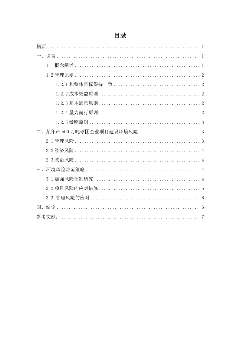 目录11.1概念阐述1.2管理原则.1.2.1和整体目标保持一致1.2.2成本效益原则....21.2.3基本满意原则..1.2.4量力而行原则.....3三、环境风险防范策略.43.1加强风险控制研究.3.2项目风险的应对措施..6四、结论.6参考文献:摘要目前大型工程承包模式大多采用设计采购施工总承包的模式,因此工程建设总承包是一种交钥匙工程,其中风险管理的水平在很大程度上决定了工程建设的利润。特别是在治金行业,很多建设项目由于工程量巨大,存在着高投入高风险的特点,在工程建设过程中不仅需要大量的人力财力以及物力作为支撑,更重要的是最重要设计或者生产出高水平高质量的产品,目前全世界经济局势并不稳定,由于政治环境以及其他原因的影响,一旦大型工程出现项目延期以及融资困难或者是欠款增多等现象,整个工程能否顺利进行施工以及项目建设的预期结果都会受到严重影响。关键词:球团项目:环境风险:分析本文对某500万吨球团生产企业进行建设项目环境风险的详细分析,并针对具体的风险提出针对性的策略和建议,以期能够降低项目实施的风险以及与风险相伴的经济损失,有效增强相关企业的抗击风险能力和利润获取能力。第一章、项目风险管理1.1概念阐述在人类活动中,风险一直伴随,风险的存在不仅让人类的活动变得具有更多的不确定,而且还给参与其中的人们带来大量的威胁,但是与此同时风险也伴随着大量的机遇,人们的各种活动都有其目的,这也就是我们常说的活动期望值,因为环境因素等影响,基于人们初始期望的目的和最终产生的结果会存在一定的差异,这种差异在很大程度上就是活动过程中不确定因素造成的。人在各类活动中都占据主体地位,但是由于不同人的各种生活习性等不同,人们在行为喜好上也有所偏差,这就导致不同人在处理同一件事的过程中所采取的行动也不尽相同,进而就会产生各种不同的结果。本文主要研究后一种情况,也就是人们在不确定环境中做出不同决策导致的企业经营风险。通常情况下风险主要是由三种基本要素构成的,这三种要素分别为风险因素和风险事故以及风险造成的损失,这三个要素在一定程度上存在因果关系,也就是说属于风险的因素在不断的积累过程中会导致各种事故的发生,而事故发生之后必然伴随着经济损失的产生。风险因素是由多种导致事故发生的条件以及原因组成的,而风险事故则是这多重风险因素在一定的条件下发生的事件,风险损失则是指不在预算或者计划内的经济以及财产的损失。对项目进行风险管理,主要是为了识别各种风险因素,并根据风险因素的形成条件进行预防性的处理,尽可能扩大对项目进行有利的因素,降低风险因素,风险管理在整个项目的建设过程中都必须存在,风险管理主要包括控制与处置风险和降低项目与确定性等内容四。1.2管理原则由于项目建设过程中会受到多种因素的共同影响,而这些因素的差异性也造成了目标在选址上的差异性,因此项目环境风险管理必须要遵循以下原则:1.2.1和整体目标保持一致项目建设总目标是整个工程建设的核心,一切项目建设活动都应该围绕总目标进行。而风险管理就是针对项目实施的每一个细节进行管理,确保项目实施各环节能够顺利进行,进而实现总目标的达成。1.2.2成本效益原则对于工程项目的建设而言,出现的风险种类繁多,因此针对不同风险采取的策略也是各不相同,在此情况下,我们一定要坚持一个原则一成本和效益之间的平衡,也就是说要确保使用最低的成本获取最大化的效益,对于风险管理的成本而言,核算是相当简单的,但是处理之后产生的效益则是需要通过一定时期的观察,效益产生具有一定的滞后性②。1.2.3基本满意原则由于未来存在一定的不确定性,因此想要保证每次项目实施都达到最优化的效果是不可能的,风险的产生也伴随着各种不确定性,在项目建设过程中,对于各种风险的处理,很多时候我们并不需要做到尽善尽美,只要能够将风险控制在一定程度内就可以。对于一些我们短时间内无法把控的风险因素不需要进行过多的事前关注,只需要在风险出现之后及时处置,尽可能降低其带来的损失就可以。1.2.4量力而行原则由于项目建设所处环境的复杂性,各种风险随时有可能产生,但是对于每一个风险都采取有效措施进行规避也是不现实的,因此在处置过程中我们要尽可能采用回避以及分散的方式尽可能的降低损失,在处置过程中要量力而行,根据自身能力确定风险的处置方案。1.2.5激励原则风险处置是一项非常复杂的工作,这就要求我们的风险管理团队能够有效工作,成员互相之间做到紧密配合。风险管理团队应该以此建立起有效的问责机制和激励机制,落实责任到个人,保证每个员工都能清楚明白自己的工作内容,并且通过积极地激励机制充满调动成员的工作积极性,进而实现风险防范管理工作有效进行。二、某年产500万吨球团企业项目建设环境风险2.1管理风险在项目建设过程中,管理风险主要有代理人风险以及组织内部风险和组织机构风险等等组成,举例来讲,对于一个企业而言,如果在选址上存在大量的不确定因素,项目建设本身的管理人员就需要具有非常高的素养,并且如果在建设过程中项目管理人员数量不足,就会出现一人身兼数职的情况,这对于现场管理是十分不利的,并且项目在建设过程中需要充分考虑到