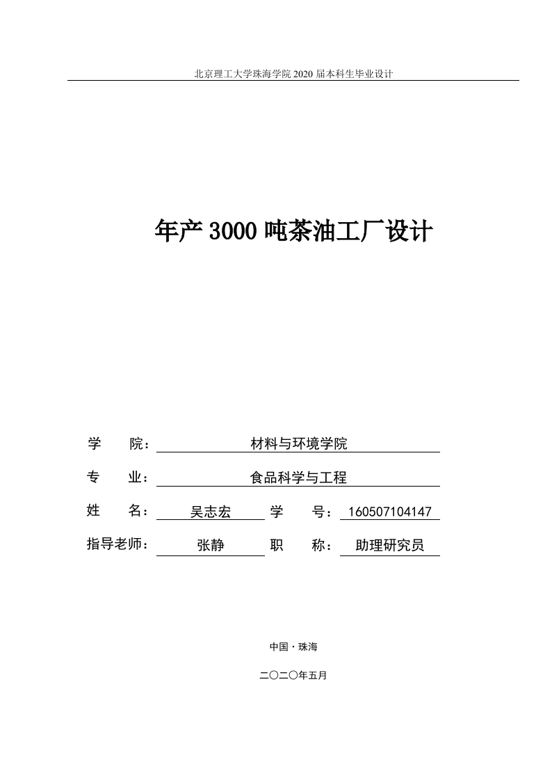 北京理工大学珠海学院2020届本科生毕业设计年产3000吨茶油工厂设计学材料与环境学院专业:食品科学与工程姓名:吴志宏学号:160507104147指导老师:张静职称:助理研究员中国·珠海北京理工大学珠海学院2020届本科生毕业设计诚信承诺书本人郑重承诺:本人承诺呈交的毕业设计《年产3000吨茶油工厂设计》是在指导教师的指导下,独立开展研究取得的成果,文中引用他人的观点和材料,均在文后按顺序列出其参考文献,设计使用的数据真实可靠。本人签名:日期:年月日北京理工大学珠海学院2020届本科生毕业设计年产3000吨茶油工厂设计摘要本设计中的茶油是一种纯天然高品质可食用植物油。本工厂设计通过对多种生产工艺流程进行对比,最终选择了冷榨法作为本设计的生产工艺。其好处是可以避免油料经过高温蒸炒,流失营养成分,最大限度地保留了生物活性物质。全过程使用物理方法,无化学添加,符合绿色食品的标准。根据各个流程生产能力的需求进行设备选型,选择合理的生产设备,进而优化车间布局,设计最后通过设备、原料以及水电成本的估算对产品定价,从实际出发,使本工厂设计成本最优化,利益最大化。关键词:茶油:工艺流程;设备选型:工厂设计