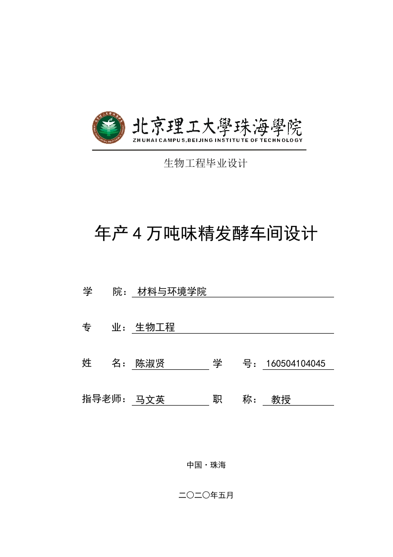 北京理工大學珠海學院生物工程毕业设计年产4万吨味精发酵车间设计学院:材料与环境学院专业:生物工程姓名:陈淑贤学号:160504104045指导老师:马文英职称:教授中国・珠海北京理工大学珠海学院2020届本科生毕业设计诚信承诺书本人郑重承诺:本人承诺呈交的实验论文《年产4万吨味精发酵车间设计》是在指导教师的指导下,独立开展研究取得的成果,文中引用他人的观点和材料,均在文后按顺序列出其参考文献,设计使用的数据真实可靠。本人签名:日期:年月日2北京理工大学珠海学院2020届本科生毕业设计年产4万吨味精发酵车间设计摘要味精又名谷氨酸钠,是谷氨酸的单钠盐,同时谷氨酸作为味精的前体物质而存在,由此观之谷氨酸的质量高低对味精的品质有直接影响。味精其主要作用是增加食品的鲜味,归因于谷氨酸有鲜味。谷氨酸不仅是自然中广泛存在的一种氨基酸,也是人体合成自身所需蛋白质中必不可少的一部分。本次设计的目标是年产4万吨味精发酵车间设计。通过多种制取味精方法比对选择出具有良好的经济效益和社会效益的方法,努力减少生产过程中原料的损失。最后通过各种衡算确定设备类型并制作车间布置图。关键词:工艺设计、谷氨酸发酵、设备选型3