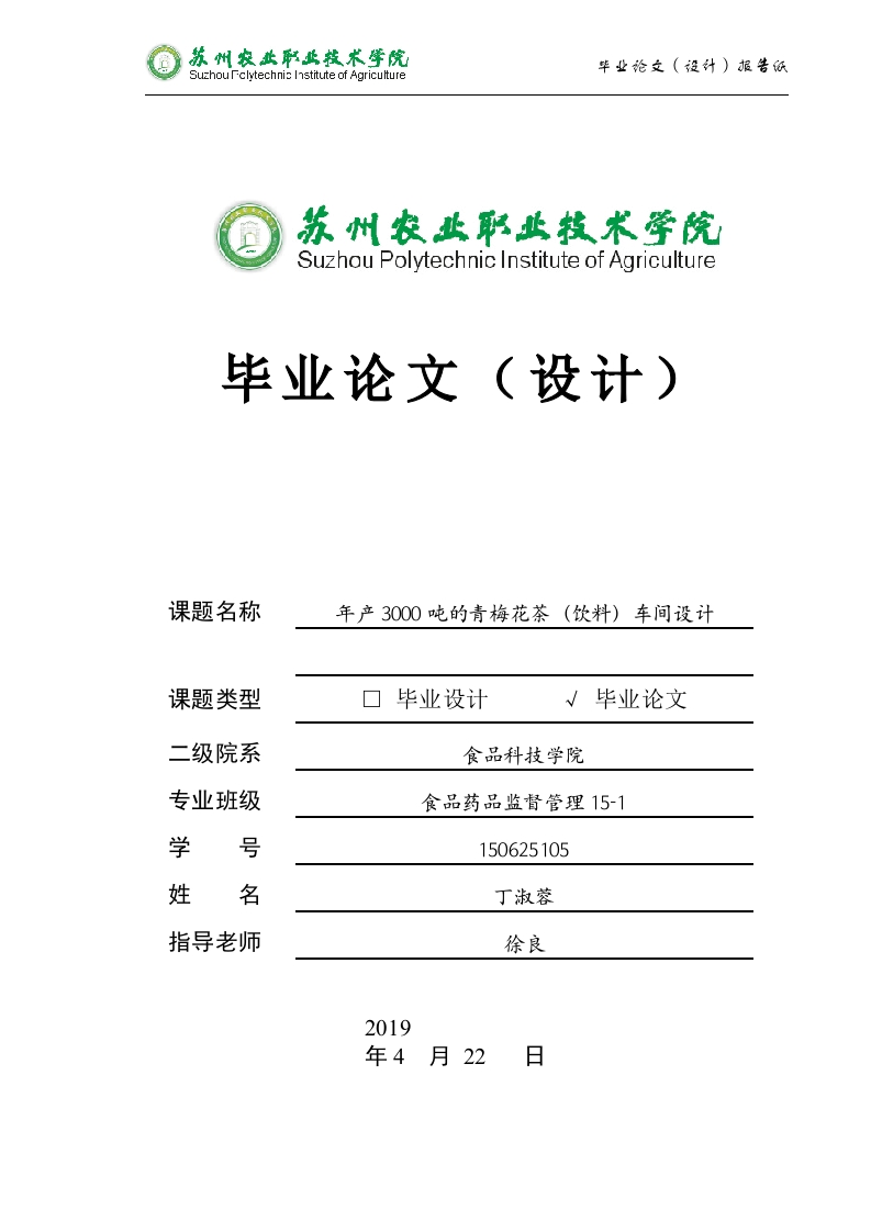 Suzhou Polytechnic Institute of Agriculture毕业论文(设计)课题名称年产3000吨的青梅花茶(饮料)车间设计课题类型口毕业设计√毕业论文二级院系食品科技学院专业班级食品药品监督管理15-1学号150625105姓名丁淑蓉指导老师徐良2019年4月22日目录摘要我们国家种植青梅花时间非常的长,相关文化也很多,在以前的医学书上写道过,青梅花可以防止出汗,痔疮也可以治,还能美化皮肤等很多功能。它有和人参一样的口碑。现在,好多人开始稀罕青梅花,因为研究发现,青梅花里面有很多的营养东西,青梅花还可以降血糖,对三高的人有好处,所以青梅花对现在三高的人有很有效的控制。这个设计是在青梅花的好处上,为了民众的健康着想,要研制一种新的关于青梅花的饮料,方便人们使用。这个设计借用了做绿茶的工艺,做自己的饮料,通过不断的实验研制出做这种饮料的最好的配方,本文设计生产茶饮料的工艺流程,做了一张工艺流程图,设计一个车间能够一年生产3000吨的青梅花茶,对主要的生产工艺以及流程进行分析研究,选择合适的生产设备,最后,选择车间的建设地址,对车间进行平面设计,并对青梅茶工厂投入的钱和收回的钱进行估算,检验车间设立的合理性。关键词:青梅花工艺流程车间设计Abstract共17页第3页