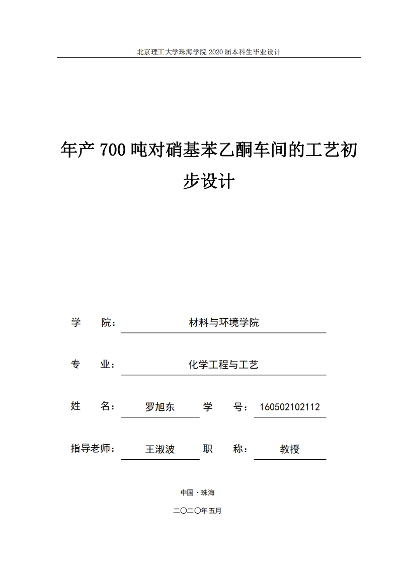 北京理工大学珠海学院2020届本科生毕业设计年产700吨对硝基苯乙酮车间的工艺初步设计学院:材料与环境学院专业:化学工程与工艺姓名:罗旭东学号:160502102112指导老师:王淑波职称:教授中国·珠海北京理工大学珠海学院2020届本科生毕业设计诚信承诺书本人郑重承诺:本人承诺呈交的毕业设计《年产700吨对硝基苯乙酮车间的工艺初步设计》是在指导教师的指导下,独立开展研究取得的成果,文中引用他人的观点和材料,均在文后按顺序列出其参考文献,设计使用的数据真实可靠。本人签名:日期:年月日北京理工大学珠海学院2020届本科生毕业设计年产700吨对硝基苯乙酮车间的工艺初步设计摘要对硝基苯乙酮,又称为4-硝基苯乙酮,其纯品为淡黄色晶体,易溶于苯、乙醚、热乙醇但是不溶于水,对于生产氯霉素它是重要的有机合成中间体,工业化所生产的氯霉素(氯霉素又是广谱抗生素),即使化工应用中制备对硝基苯乙酮的方法很多,但是乙苯硝化氧化法是技术最完善和效益最高的生产方法(也就是乙苯先通过硝化后再经过氧化生成对硝基苯乙酮)。本工艺就采用硝化氧化法,相比其他合成工艺,此工艺的长处是:起始物料乙苯容易获取,比较容易操控且反应的连续性,生成对硝基苯乙酮的副产物较少。关键词:对硝基苯乙酮、氯霉素、乙苯硝化氧化法