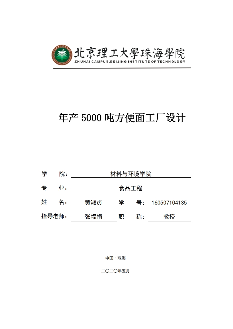 北京理工大學珠海學院ZHUHAI CAMPUS.BEIJING INSTITUTE OF TECHNOLOGY年产5000吨方便面工厂设计学院:材料与环境学院专业:食品工程姓名:黄淑贞学号:160507104135指导老师:张福捐职称:教授中国・珠海北京理工大学珠海学院2016届本科生毕业设计诚信承诺书本人郑重承诺:本人承诺呈交的毕业设计《年产5000吨香菜方便面工厂设计》是在指导教师的指导下,独立开展研究取得的成果,文中引用他人的观点和材料,均在文后按顺序列出其参考文献,设计使用的数据真实可靠。本人签名:日期:年月日北京理工大学珠海学院2016届本科生毕业设计年产5000吨方便面工厂设计摘要本设计为年产5000吨方便面工厂设计,根据市场对于方便面的需求得出方便面在营养这方面的价值还有很大的进步空间。我们决定在方便面中加入香菜,因此拟定了5000t香菜方便面的工厂设计。我们应该先对生产中所需要的原辅料以及涉及到的工艺流程进行分析,其中包括工艺流程中重要操作要点进行物料衡算:进而依据国际市场要求进行了主要的设备选型。合理规划厂区内部布局,根据产品设定一个合理的市场价格计算出工厂的年利润,再根据工厂情况设计厂区平面图和人流物流图以及车间布局图和人流物流图。关键词:方便面:原材料:物料衡算:设备选型:工厂设计