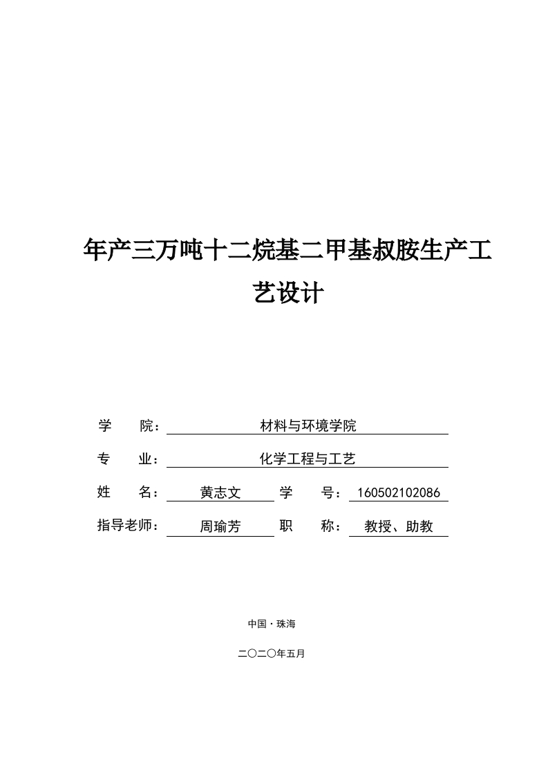 年产三万吨十二烷基二甲基叔胺生产工艺设计学院:材料与环境学院专业:化学工程与工艺姓名:黄志文学号:160502102086指导老师:周瑜芳职称:教授、助教中国·珠海北京理工大学珠海学院16届本科生毕业设计诚信承诺书本人郑重承诺:本人承诺呈交的毕业设计《年产3万吨十二烷基二甲基叔胺生产工艺设计》是在指导教师的指导下,独立开展研究取得的成果,文中引用他人的观点和材料,均在文后按顺序列出其参考文献,设计使用的数据真实可靠。本人签名:日期:年月日北京理工大学珠海学院16届本科生毕业设计年产3万吨十二烷基二甲基生产工艺设计摘要脂肪胺是工业上最具有价值的脂肪酸衍生物品种之一,广泛的用于轻纺、建材、采矿等工业以及日常生活,是精细化工行业的重要基本原料之一。本设计为3万吨/年十二烷基二甲基叔胺生产工艺设计,生产工艺选用目前已经成熟的十二醇与二甲胺一步催化胺化法生产乙烯工艺。原料选择十二醇和二甲胺,催化剂选择Cu60/8P,将十二醇以及十二醇进料质量的1.5%催化剂混合加入环路反应器中,在氢气氛围下催化还原催化剂,后在稳定的二甲胺进气中反应3h-4h。反应产物经水洗分离出易溶于水的二甲胺,三甲胺等。经过精馏塔精馏塔顶得到质量含量为98%的十二烷基二甲基叔胺,塔釜得到高沸物集合体。首先运用Aspen软件对工艺进行模拟及优化,对反应器、精馏塔设备进行物料衡算和热量衡算,然后在此基础上对反应器、精馏塔进行计算设计。对储罐、泵、换热器等进行选型。绘制完成物料流程图(PD)和带控制点的操作流程图(PD)。最后,在设备选型的基础上,根据相关要求以及规定,以安全生产为前提,以对环境友好为准则,以节约为目的。对车间布置及厂区选址进行设计确定,绘制厂区布置图。关键词:十二烷基二甲基叔胺十二烷基二甲基叔胺工艺设计环路反应器