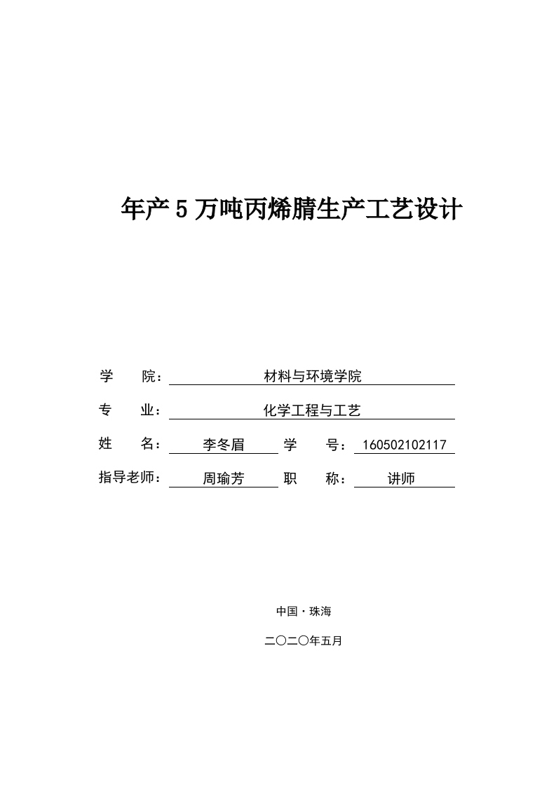 年产5万吨丙烯晴生产工艺设计学材料与环境学院专业:化学工程与工艺姓名:李冬眉学号:160502102117指导老师:周瑜芳职称:讲师中国·珠海北京理工大学珠海学院2020届本科生毕业设计诚信承诺书本人郑重承诺:本人承诺呈交的毕业设计《年产5万吨丙烯腈生产工艺设计》是在指导教师的指导下,独立开展研究取得的成果,文中引用他人的观点和材料,均在文后按顺序列出其参考文献,设计使用的数据真实可靠。本人签名:日期:年月日北京理工大学珠海学院2020届本科生毕业设计摘要丙烯腈(AN)是一种广泛使用的化学原料,并用于各种生产领域,随着国内外对丙烯腈需求的增加,丙烯腈供不应求。大多数国内丙烯腈依靠进口产品来满足市场需求。当前,生产丙烯腈的方法是主要以丙烯、空气和氨为原料合成丙烯腈。此方法与以前的工艺方法相比,具有明显的优势,原料来源多、成本低廉、工艺简单。该设计将这个工艺的优势与5万吨/年丙烯腈合成工艺的设计主题相结合,以确定特定的工艺流程、工艺参数和相关设备。工艺参数的选择包括反应温度、反应压力、接触时间、进料纯度、比例以和催化剂。介绍了丙烯腈未来的发展前景、生产现状、生产原理及工艺流程的概述和工艺合成的基本方法,并且对设备进行物料和热量衡算以及主要设备的工艺计算。关键词:丙烯腈:丙烯氨氧化法;工艺计算