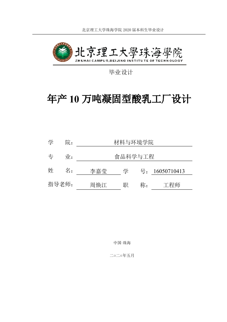 北京理工大学珠海学院2020届本科生毕业设计北京理工大學珠海學院ZHUHAI CAMPUS.BEIJING INSTITUTE OF TECHN OLOGY毕业设计年产10万吨凝固型酸乳工厂设计学材料与环境学院专业:食品科学与工程姓名:李嘉莹学号:16050710413指导老师:周焕江职工程师中国珠海二o二o年五月北京理工大学珠海学院2020届本科生毕业设计诚信承诺书本人郑重承诺:本人承诺呈交的毕业设计《年产10万吨凝固型酸乳工厂设计》是在指导教师的指导下,独立开展研究取得的成果,文中引用他人的观点和材料,均在文后按顺序列出其参考文献,设计使用的数据真实可靠。本人签名:日期:年月日该同学毕业设计已审核。同意存档。指导老师(签字):日期:年月日北京理工大学珠海学院2020届本科生毕业设计年产10万吨凝固型酸乳生产设计摘要本次设计主要目的是设计出大多数人群所食用的凝固型酸乳,由此在工艺配方上做了一定的调整,尽量满足人群的需求。在传统成分中添加了鼠李糖乳杆菌作为原料,相对于保加利亚乳杆菌等其他有益菌来说,鼠李糖乳杆菌对于肠道的增殖作用较强。更有利于肠道的健康。在原料的配方上的第二个调整,使用木糖醇作为甜味剂,目前市面上的酸乳因为添加了大量的白砂糖,木糖醇的甜度与蔗糖相似,木糖醇对于人体有一定的保健作用,更有利于大多数人的食用。以聚葡萄糖作为稳定剂,聚葡萄糖可以大大降低凝固型酸乳的析水程度。为达到年产10万吨凝固型酸乳的生产,对于工艺流程、生产车间及其流程的合理化操作,对于工厂的成本最优化可对热量衡算,物料衡算、设备选型、成本估算尽可能降低能耗以及减少污染。关键词:凝固型酸乳;鼠李糖乳杆菌:木糖醇:聚葡萄糖:工厂设计