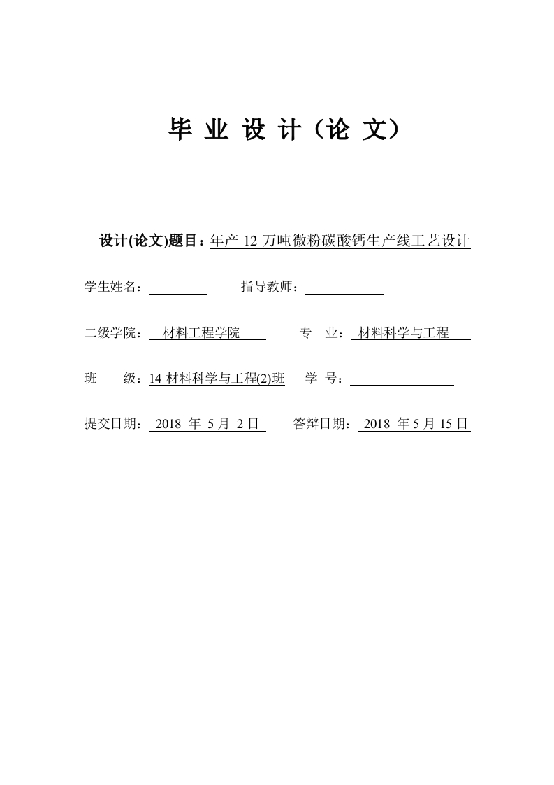 毕业设计(论文)设计(论文)题目:年产12万吨微粉碳酸钙生产线工艺设计学生姓名:指导教师:二级学院:材料工程学院专业:材料科学与工程班级:14材料科学与工程2)班学号:提交日期:2018年5月2日答辩日期:2018年5月15日金陵科技学院学士学位论文目录摘要IVAbstract...第1章绪论1.1碳酸钙介绍与分类1.1.1碳酸钙介绍1.1.2碳酸钙分类1.2碳酸钙市场分析…21.2.1国内外行情.…21.2.2国内现状分析21.3研究的目的及意义.第2章工艺分类及流程设计42.1工艺分类42.1.1重质碳酸钙生产方式2.1.2轻质碳酸钙生产方式2.2工艺流程设计.…2.2.1煅烧工段2.2.2消化工段62.2.3粗灰乳的调和与精制工段72.2.4窑气的冷却与净化工段口2.2.5窑气的压缩工段…82.2.6精灰乳的碳化工段82.2.7熟浆的增浓和过滤工段82.2.8母液沉降工段口…2.2.9干燥及包装工段92.3本章小结…10第3章物料衡算与能量衡算113.1概述113.2物料衡算的计算基准11金陵科技学院学士学位论文3.2.1石灰石煅烧工段的物料衡算3.2.2石灰消化过程的物料衡算143.2.3碳化过程的物料衡算3.2.4浆液增浓与过滤过程的物料衡算…444444173.2.5干燥与包装过程的物料衡算...183.3能量衡算3.3.1石灰石煅烧过程的能量衡算.193.3.2石灰消化过程的能量衡算…203.3.3浆液调温调浓过程的能量衡算213.3.4碳化过程的能量衡算223.3.5干燥过程的能量衡算23第4章主要设备的设计与选型254.1立窑主要数据的确定254.2碳化塔主要数据的确定...…4.3石灰消化与精制设备..314.3.1槽式化灰机的主要数据确定.…314.3.2直线振动筛的主要数据确定4.4固液分离设备选型324.5小结…32第5章经济性能评价5.1总投资成本、产品成本.5.1.1总投资成本.5.1.2产品成本.345.2环境保护.365.2.1环境保护意义.365.2.2环境保护措施.36第6章总结与展望386.1总结3838