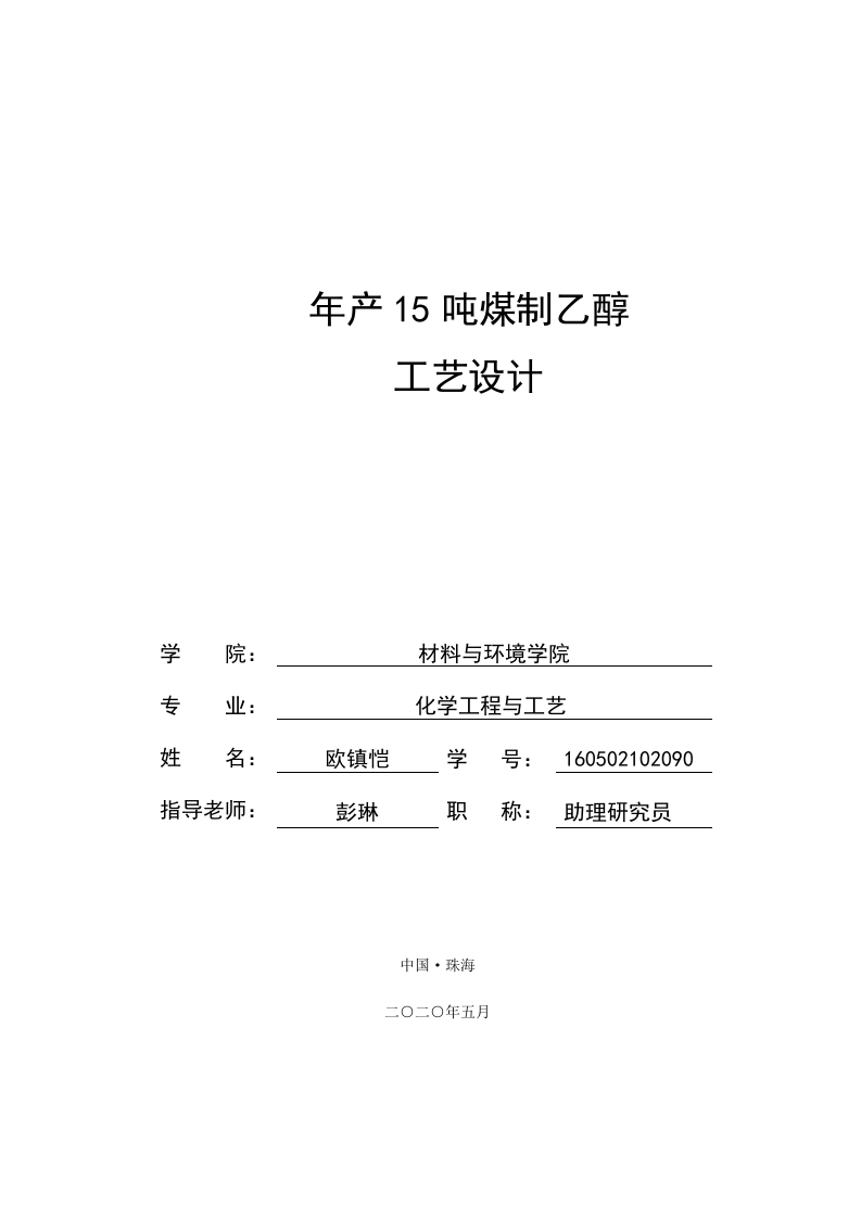 年产15吨煤制乙醇工艺设计学院:材料与环境学院专业:化学工程与工艺姓名:欧镇恺学号:160502102090指导老师:彭琳职称:助理研究员中国·珠海北京理工大学珠海学院2020届本科生毕业设计诚信承诺书本人郑重承诺:本人承诺呈交的毕业设计《年产15万吨煤制乙醇生产工艺设计》是在指导老师的指导下,独立开展研究取得的成果,文中引用他人的观点与材料,均在文后按顺序列出其参考文献,设计使用的数据真实可靠。本人签名:日期:年月日该同学毕业设计(论文)已审核,同意存档。指导老师(签字):日期:年月日北京理工大学珠海学院2020届本科生毕业设计年产15万吨煤制乙醇工艺设计摘要本设计是在干净的合成气基础上,在适当的反应环境与催化剂下合成乙醇。通过合成气合成的方法合成乙醇,该方法下的反应条件相较其他更加温和,而且配套技术上更加成熟,并且收率相对其他方法而言更高。此法先在固定管板的反应塔中进行反应,然后进入常压精馏塔进行分离提纯。对现有技术的分析与研究,可以促进我国乙醇生产工艺的改革,提高生产效率,以适应医疗及新能源的发展新需要。本次设计包括对产品的市场及生产工艺、生产设备的分析,完成了工艺流程的设计、物料衡算、热量衡算、设备选型、三废处理与工业配套设施等。乙醇是工业价值极高的化工原料,在经济的发展、化工生产的改良的层面上,对其的合理开发是必不可少的一部分。关键词:乙醇:合成气:新能源:工艺设计3