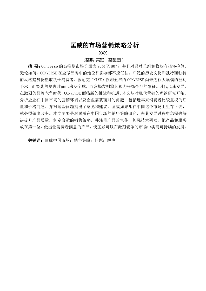 匡威的市场营销策略分析XXX(某系某班,某集团)摘要:Converse的高峰期市场份额为70%至80%,并且对品牌重组和收购有很多抱怨。无论如何,CONVERSE在全球品牌中的地位和影响都不应低估。广泛的历史文化和独特而独特的风格趋势仍然取决于消费者。被耐克(NIKE)收购五年的CONVERSE尚未进行大规模的被动手术,而经典的复古时尚已遍及全球,而发烧友则将其视为张扬个性的象征。时代飞速发展,在激烈的品牌竞争时代,CONVERSE面临新的挑战和机遇。本文从对现代营销的理论研究开始,分析企业在中国市场的营销环境以及企业需要面对的问题,包括近年来消费者比较重视的质量和价格问题。并对这些问题提出了意见和建议,匡威如果想在中国这个市场上生存下去,就必须做出改变。本文主要是对匡威在中国市场的销售策略研究,在其发展过程中急需去解决提升产品质量,制定合适的销售策略,并注重产品的宣传,加强技术研发,把产品和服务放在第一位,做出让消费者满意的产品,使匡威可以在激烈竞争的市场中实现可持续的发展。关键词:匡威中国市场:销售策略:问题:解决目录一、匡威市场SW0T分析与品牌分析.....1122二、匡威市场销售策略分析....2(一)匡威市场的营销战略...2(二)匡威营销存在的问题..3三、匡威市场销售策略改进4(一)明确目标市场和消费人群...456引言近年来,随着中国体育产业的飞速发展,中国的运动鞋市场进入了多品牌时代,在中国的运动鞋领域投入了大量资金。知名品牌已通过在证券交易所上市进入资本市场,国内外联合投资和多机构投资是运动鞋投资的主要形式。中国是领先的制鞋商,帆布鞋在中国已有80或90年的历史。如今,帆布鞋已成为国防,体育,劳动生产和人民生活不可分割的一部分。中国每年生产超过20亿只帆布鞋,占世界一半以上。它具有国内销售和出口,并具有橡胶鞋的样式,设计和用途。作为其在中国发展的一部分,匡威通过适当的公共关系活动指导了中国消费者。尤其是年轻人追求运动,积极健康的生活方式,并且必将在促进中国市场体育休闲产业的发展中发挥作用。匡威一直倡导仁慈的竞争,并一直在努力规范中国市场。在竞争日益激烈的消费者市场中,对于公司而言,更有效地选择和使用营销方法并获得更大的市场份额尤为重要。以匡威为例,我们将从消费者的角度分析匡威在中国市场的销售策略,并研究其实施中存在的问题。希望为匡威以及其他企业提供建设性意见,更好地促进行业发展。一、匡威市场SW0T分析与品牌分析2006年,匡威在中国树立了良好的品牌形象,健康的分销网络和稳定的消费群体。自2015年以来,匡威在中国大陆的销售额已达60亿美元,匡威已成为年轻人喜爱的个性化品牌的代表。国内明星徐静蕾、苏有朋、孙燕姿、何润东等代表表示,帆布鞋是大多数年轻学生和时尚迷钟爱的典型产品。(1)悠久的品牌历史1980年,匡威在美国创立了100年历史的匡威品牌。最早的篮球鞋是Converse在1917年发明的。1923年,匡威成为全球篮球鞋的代言人,随着时间的流逝,帆布鞋发生了翻天覆地的变化,使其成为最受欢迎的时尚品牌。与美国人一样,具有数百年历史的麦当劳和可口可乐品牌都是永久性品牌,使它们成为无尽的复古主题。(2)强大的营销团队公司在中国七个地区设有办事处,覆盖华南,华中,西南,西北,华东,华北和东北的市场,公司目前拥有最多的国际品牌和许多公司。本地化的团队可以更好地了解和了解每个地区的市场,与购物中心和客户情绪保持良好的沟通,并为零售商提供更紧密的服务。它可以控制设备的显示,销售和培训,并且公司政策的沟通和实施是快速而有效的。更好地了解动态市场,经销商和产品信息,以及及时的反馈,以便贵公司可以快速做出响应。(3)专有的核心产品公司的旗舰帆布鞋目前在市场上具有绝对的发展和品牌优势,并且对年轻一代具有独特的吸引力。它象征着美国文化,青年,时尚和个性,并通过同一类别的产品保留了绝对利益。公司在中低价位区间的价格在200-400元之间,公司主要客户群的学生用电量有限,使得中低价位非常有吸引力,在当今激烈的市场竞争中,它也很有竞争力。