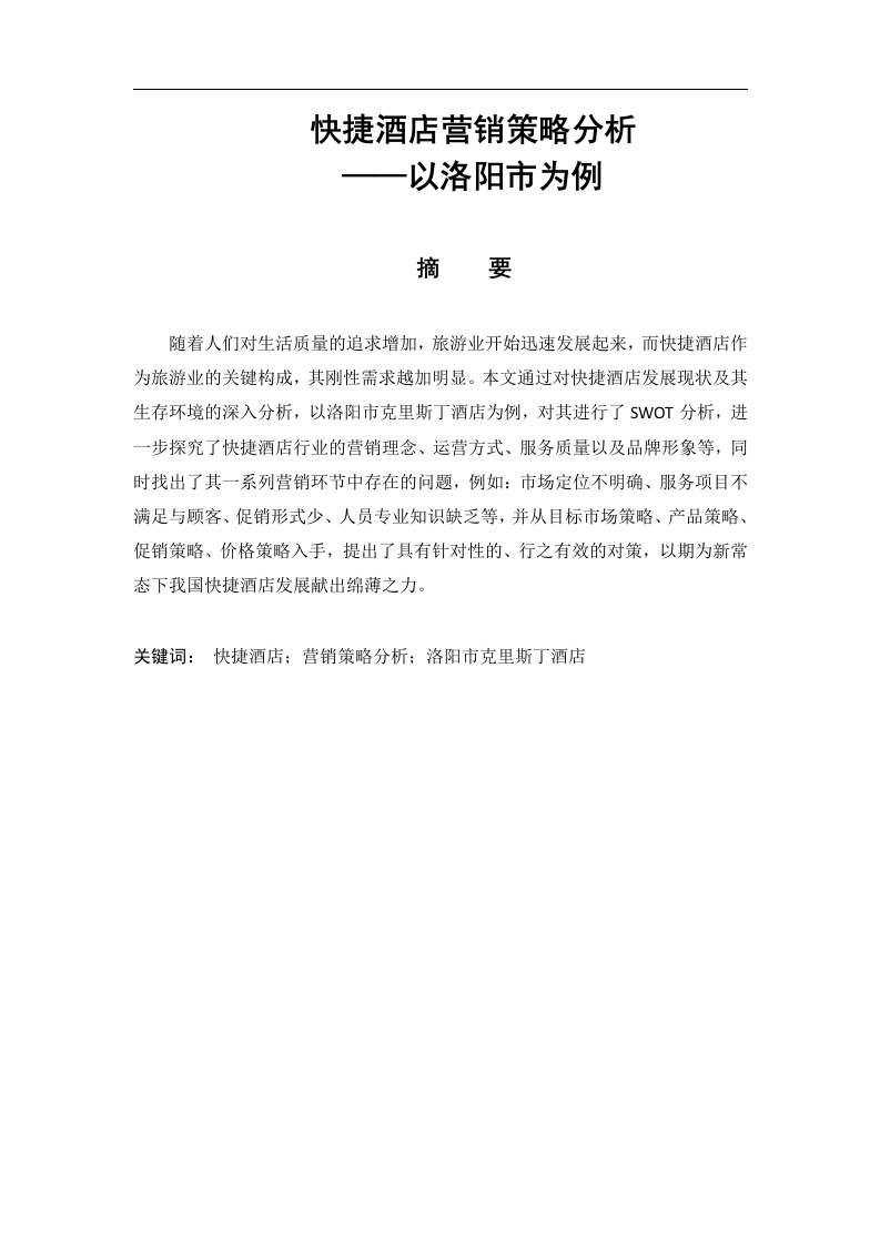 快捷酒店营销策略分析以洛阳市为例摘要随着人们对生活质量的追求增加,旅游业开始迅速发展起来,而快捷酒店作为旅游业的关键构成,其刚性需求越加明显。本文通过对快捷酒店发展现状及其生存环境的深入分析,以洛阳市克里斯丁酒店为例,对其进行了SWOT分析,进一步探究了快捷酒店行业的营销理念、运营方式、服务质量以及品牌形象等,同时找出了其一系列营销环节中存在的问题,例如:市场定位不明确、服务项目不满足与顾客、促销形式少、人员专业知识缺乏等,并从目标市场策略、产品策略、促销策略、价格策略入手,提出了具有针对性的、行之有效的对策,以期为新常态下我国快捷酒店发展献出绵薄之力。关键词:快捷酒店:营销策略分析:洛阳市克里斯丁酒店English SubjectABSTRACTWith the people's quality of life in the pursuit of increased tourism began todevelop rapidly up and Inns constitution as a key tourism,the rigid demand hasbecome increasingly obvious.Through in-depth analysis of the development statusInn and living environment,Luoyang City Christi Hotel,for example,a SWOTanalysis was carried out to further explore the Inn industry marketing idea,the waythey operate,service quality and brand image etc.,and to find out its part of a series ofmarketing existing problems,such as:market positioning is not clear,the project isnot satisfied with the customer service,fewer forms of promotion,lack of staffexpertise,etc.,and from the target market strategy,product strategy,promotionstrategy,pricing strategy,puts forward a targeted and effective countermeasures to thenew normal for the next development of Inn gave modest.Key words:Express Inn;Marketing Strategy;Luoyang Christian's Hotel目录前言一、国内外酒店行业发展现状(一)国内酒店行业发展现状.(二)国外酒店行业发展现状(一)洛阳市基本环境22.经济环境3.技术环境3(二)洛阳市餐饮酒店业发展现状…三、洛阳克里斯丁酒店现状与SW0T分析.(一)克里斯丁酒店现状4(二)SWOT分析.41.优势分析2.劣势分析3.机会分析wwa...a44.挑战分析四、克里斯丁酒店存在问题及改进(一)市场定位不明确5(二)服务项目种类少5(三)促销形式单一.6(四)员工专业知识缺乏6五、营销策略…7