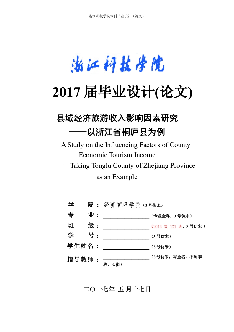 浙江科技学院本科毕业设计(论文)2017届毕业设计(论文)县域经济旅游收入影响因素研究以浙江省桐庐县为例A Study on the Influencing Factors of CountyEconomic Tourism Income--Taking Tonglu County of Zhejiang Provinceas an Example院:经济管理学院(3号仿宋)专业:(专业全称,3号仿宋)班级:(2013级101班,3号仿宋)学号:(3号仿宋)学生姓名:(3号仿宋)指导教师(3号仿宋,写全名,不加职称、头衔)二O一七年五月十七日浙江科技学院毕业设计(论文)、学位论文版权使用授权书本人学号声明所呈交的毕业设计(论文)、学位论文《》,是在导师指导下进行的研究工作及取得的研究成果。除了文中特别加以标注和致谢的地方外,论文中不包含其他人已经发表或撰写过的研究成果,与我一同工作的人员对本研究所做的任何贡献均已在论文中作了明确的说明并表示谢意。本毕业设计(论文)、学位论文作者愿意遵守浙江科技学院关于保留、使用学位论文的管理办法及规定,允许毕业设计(论文)、学位论文被查阅。本人授权浙江科技学院可以将毕业设计(论文)、学位论文的全部或部分内容编入有关数据库在校园网内传播,可以采用影印、缩印或扫描等复制手段保存、汇编毕业设计(论文)、学位论文。(保密的学位论文在解密后适用本授权书)论文作者签名:导师签名:签字日期:年月日签字日期:年月日浙江科技学院本科毕业设计(论文)内容摘要随着大众旅游时代的到来,旅游业的发展对于推动经济结构调整,培育新的经济增长点,促进经济提质增效的作用越来越大。县域旅游经济的发展对于促进县域经济发展和居民收入的优势也愈加明显。旅游收入往往由多种因素构成,对旅游收入进行分析可以判定出哪些因素影响了旅游收入,可以据此提出相关的改进措施,以增加旅游收入。这篇文章对浙江省桐庐县旅游收入进行系统科学的分析,总结出浙江省桐庐县旅游收入的构成因素,县域经济旅游收入的影响因素,旅游人数和旅游收入的之间的内在联系,而且在分析的基础上,提出合理有效的的建议。关键词:县域经济;旅游收入;影响因素;桐庐县